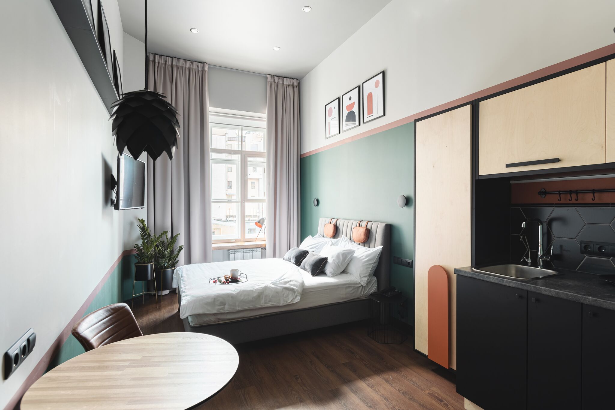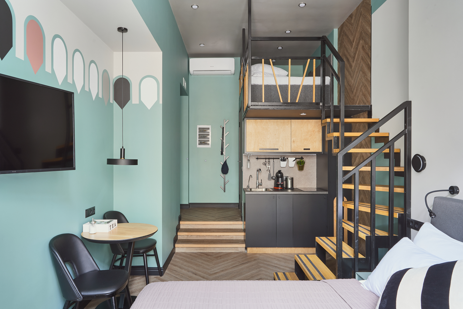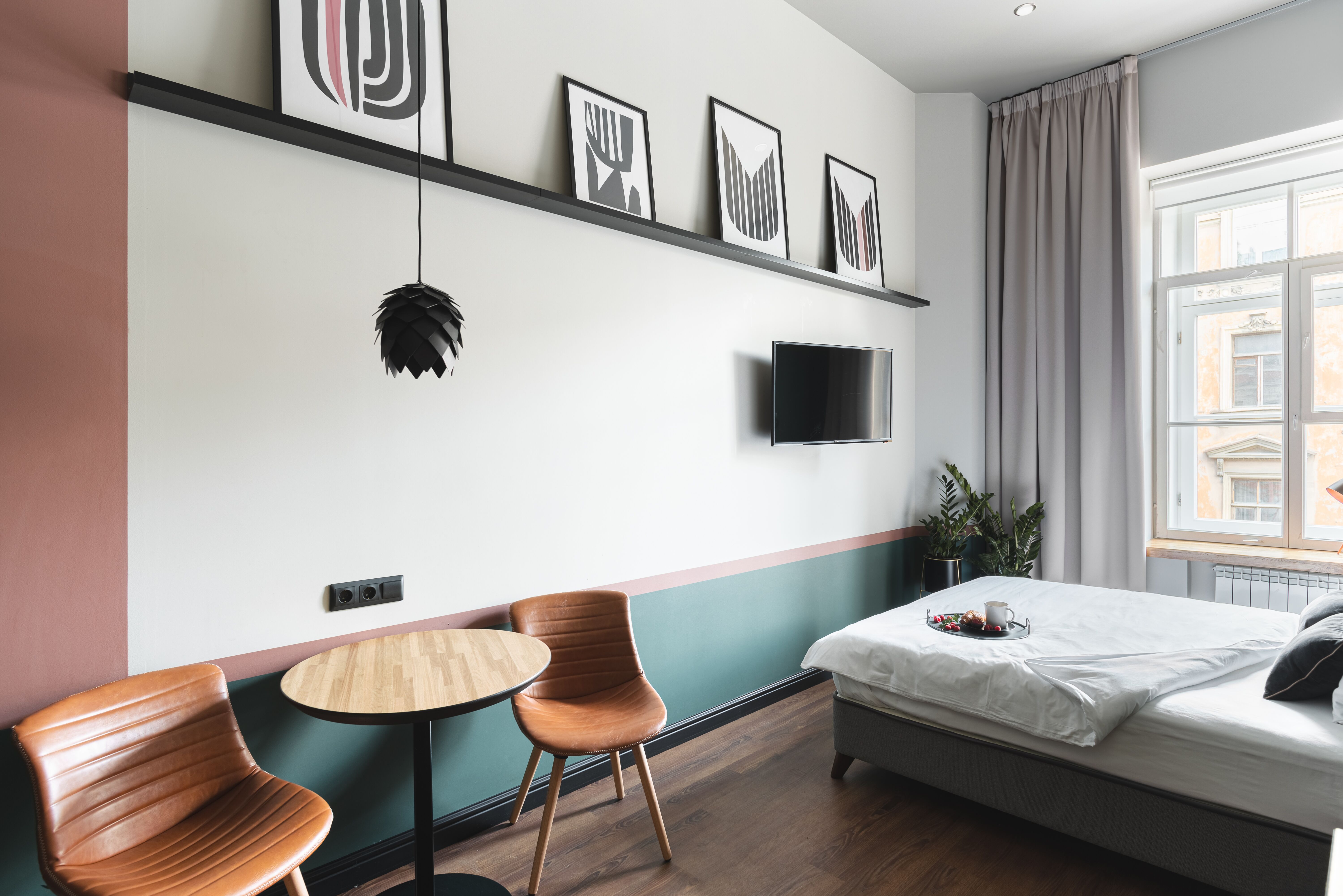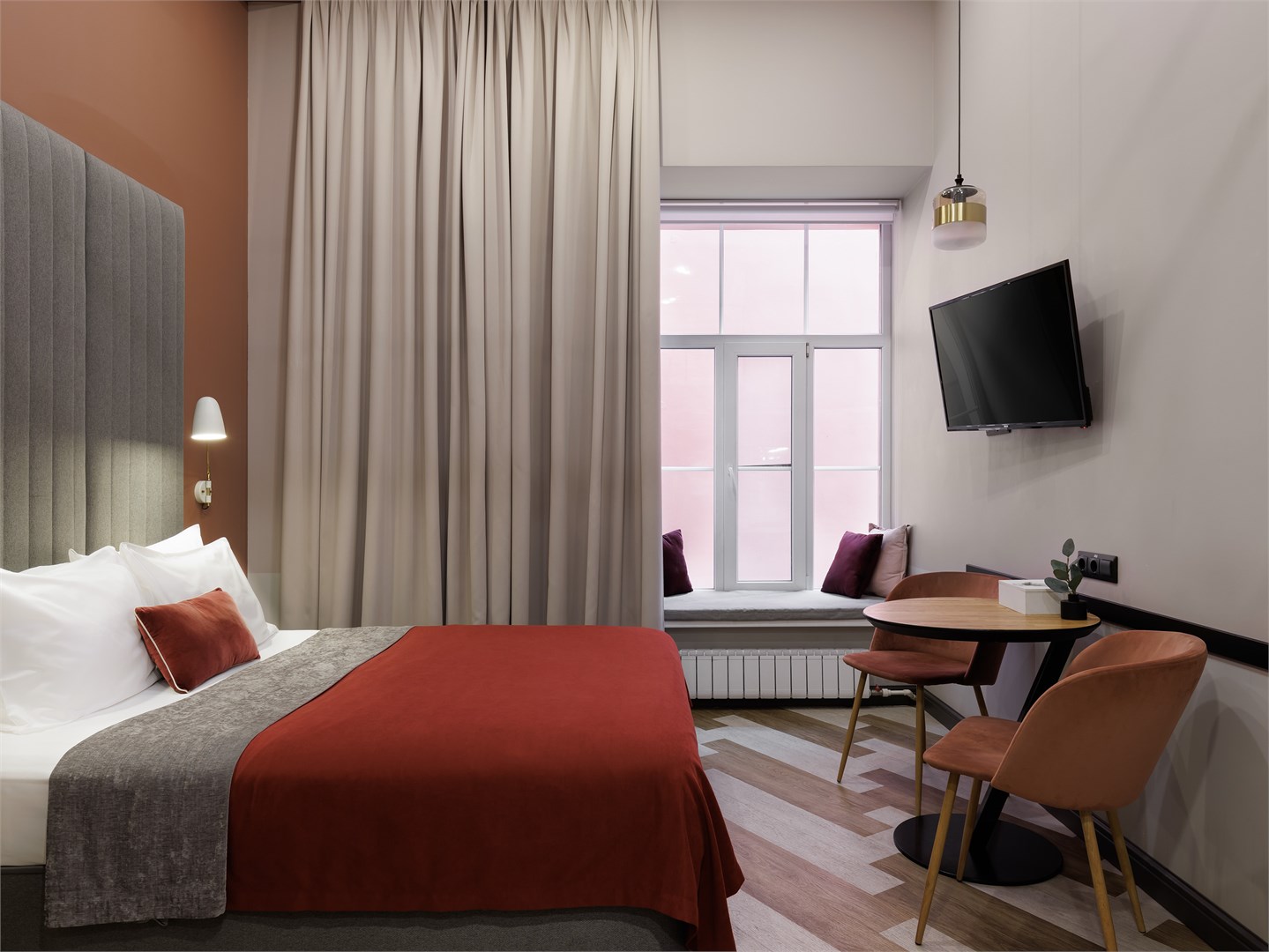 В номере: вешалка, зеркало, кровать двуспальная, прикроватные тумбочки, стол, стул, шкаф, гладильная доска, кондиционер, телевизор ЖК, утюг, чайная станция