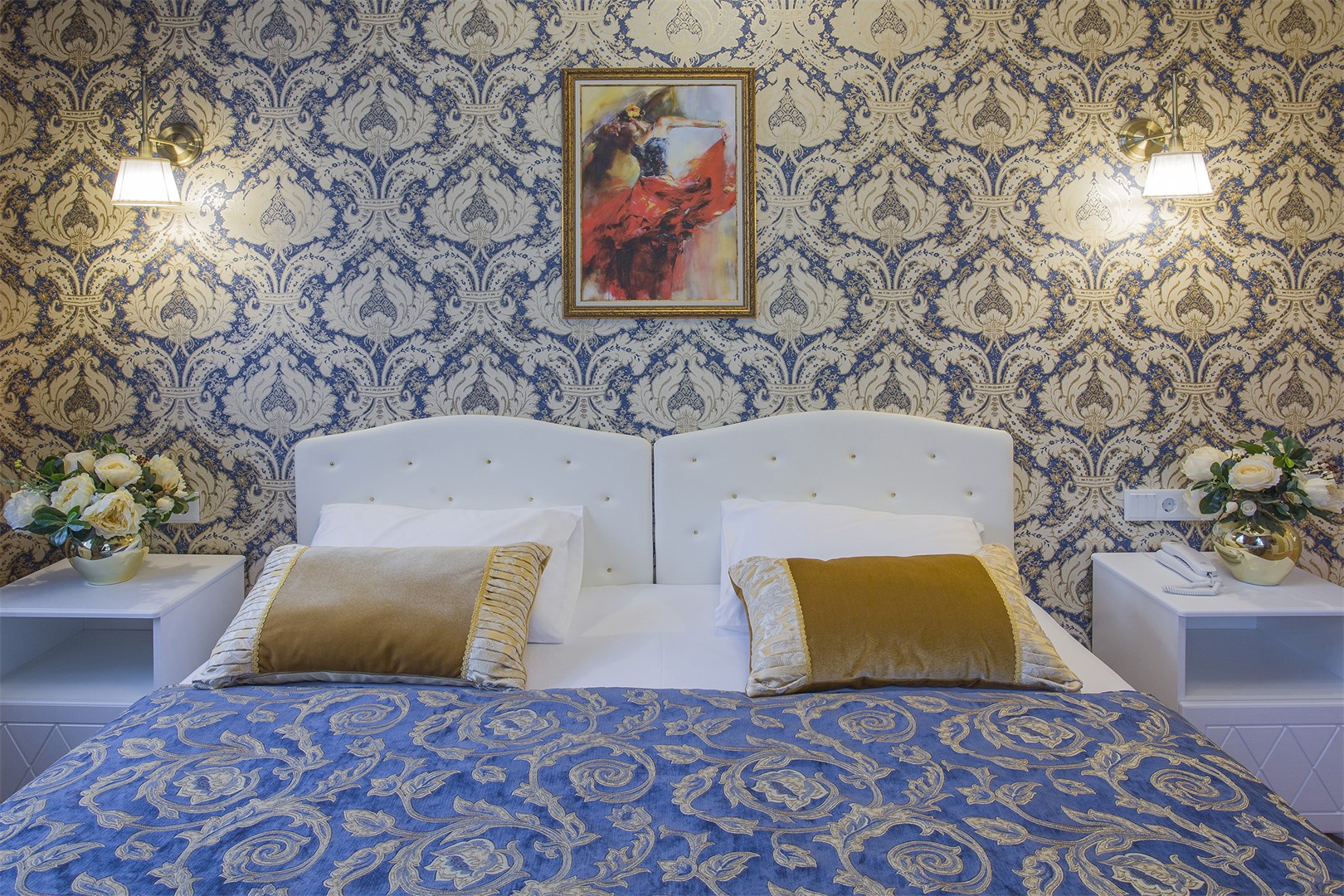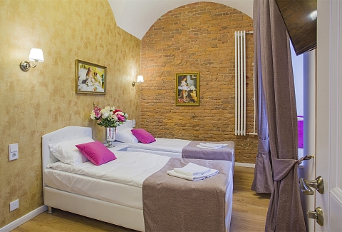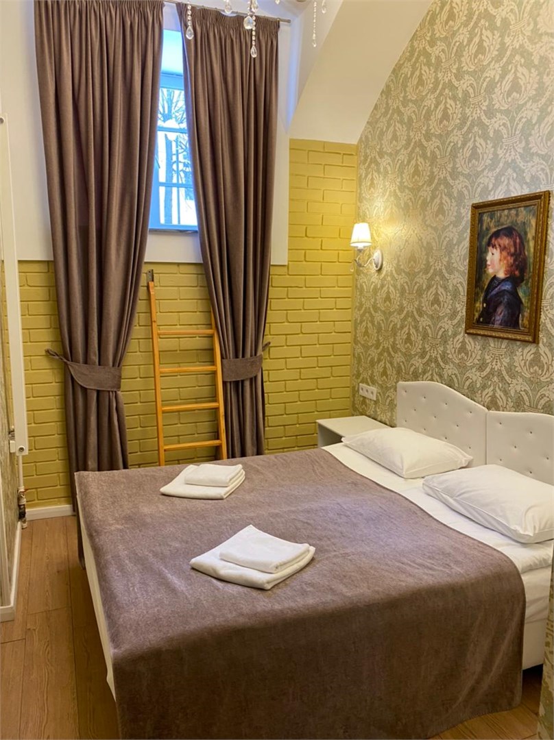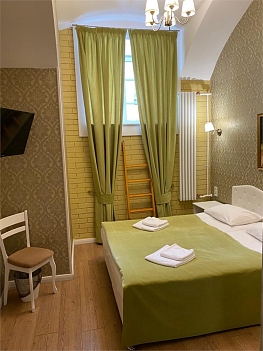 Здание отеля п-образной формы и разной этажности находится на территории римско-католической базилики Святой Екатерины. Обширный жилой фонд, способный единовременно разместить более 250 человек, предлагает удобные двухместные номера Стандарт, Бизнес, Комфорт. Интерьеры комнаты оформлены в современном стиле лофт в сочетании с классическими элементами. Каждый номер оснащен индивидуальным санузлом, плазменным телевизором, мини-холодильником. При отеле работает ресторан, на всей территории доступен беспроводной интернет. На ресепшене гости могут арендовать дополнительную бытовую технику и приобрести экскурсии по городу и пригородам.