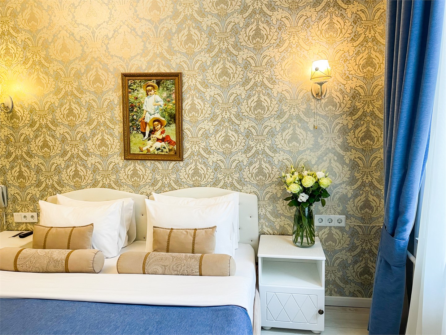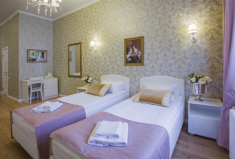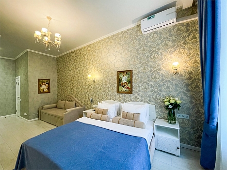 В номере: вешалка, диван, зеркало, кровати односпальные /одна двуспальная кровать, прикроватные тумбочки, стол, стул, шкаф, кондиционер, мини-холодильник, сейф, телевизор, чайный набор посуды, электрочайник