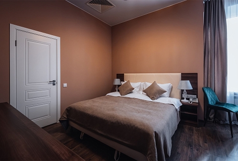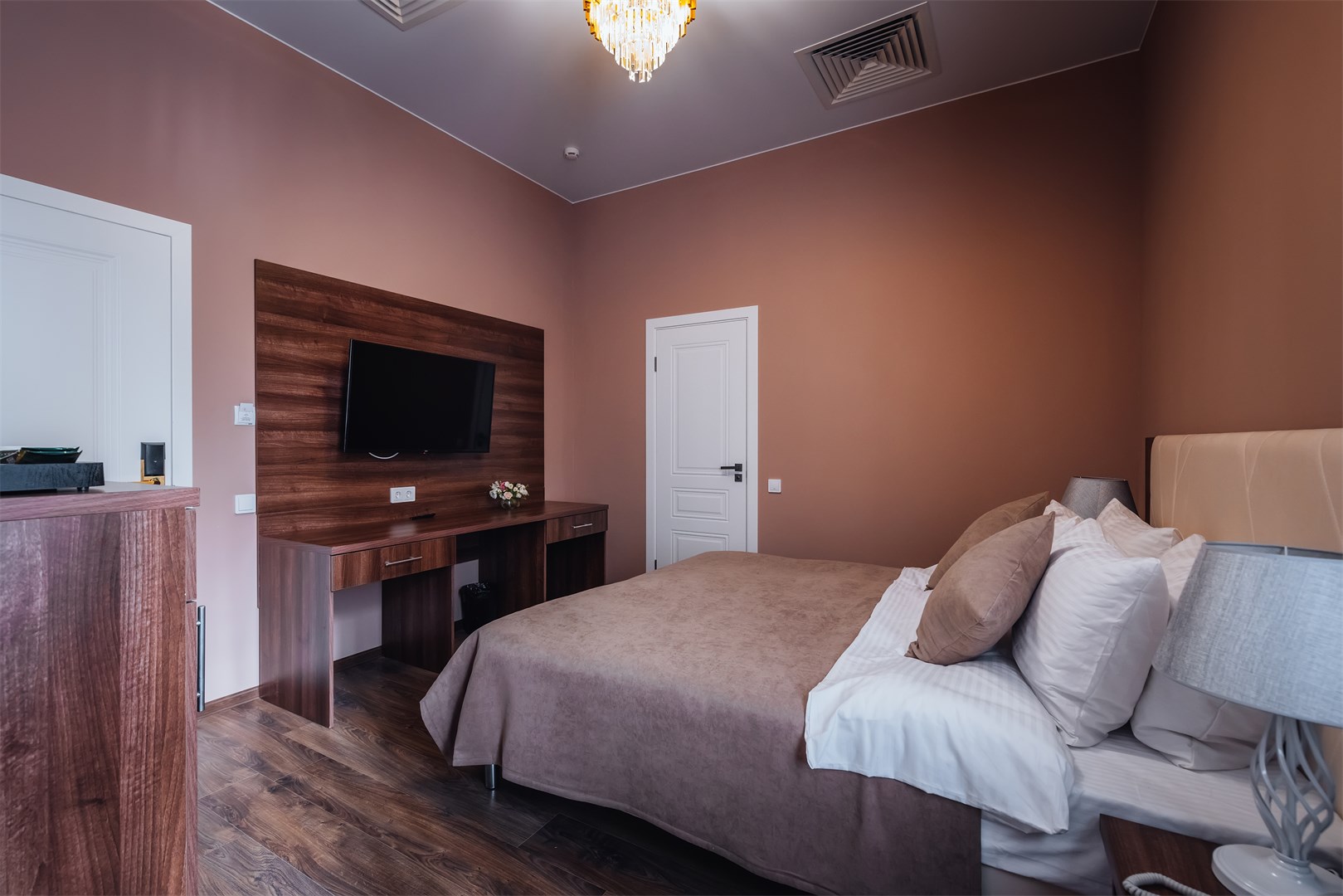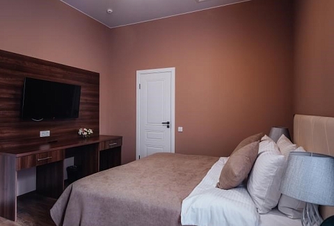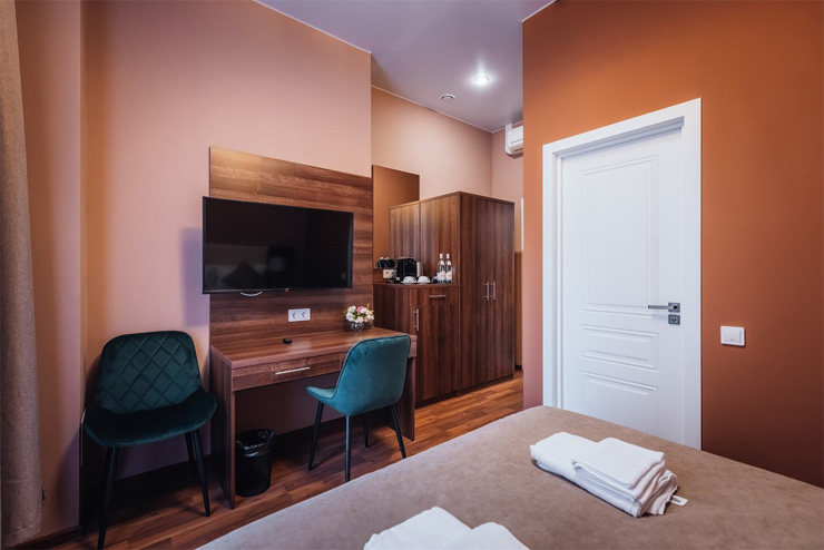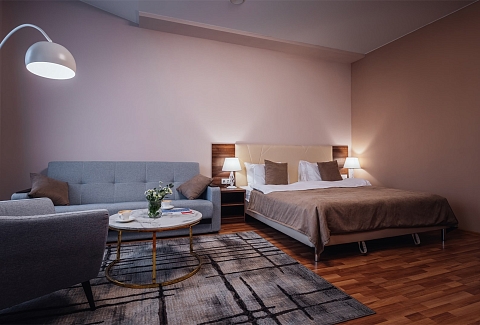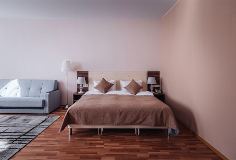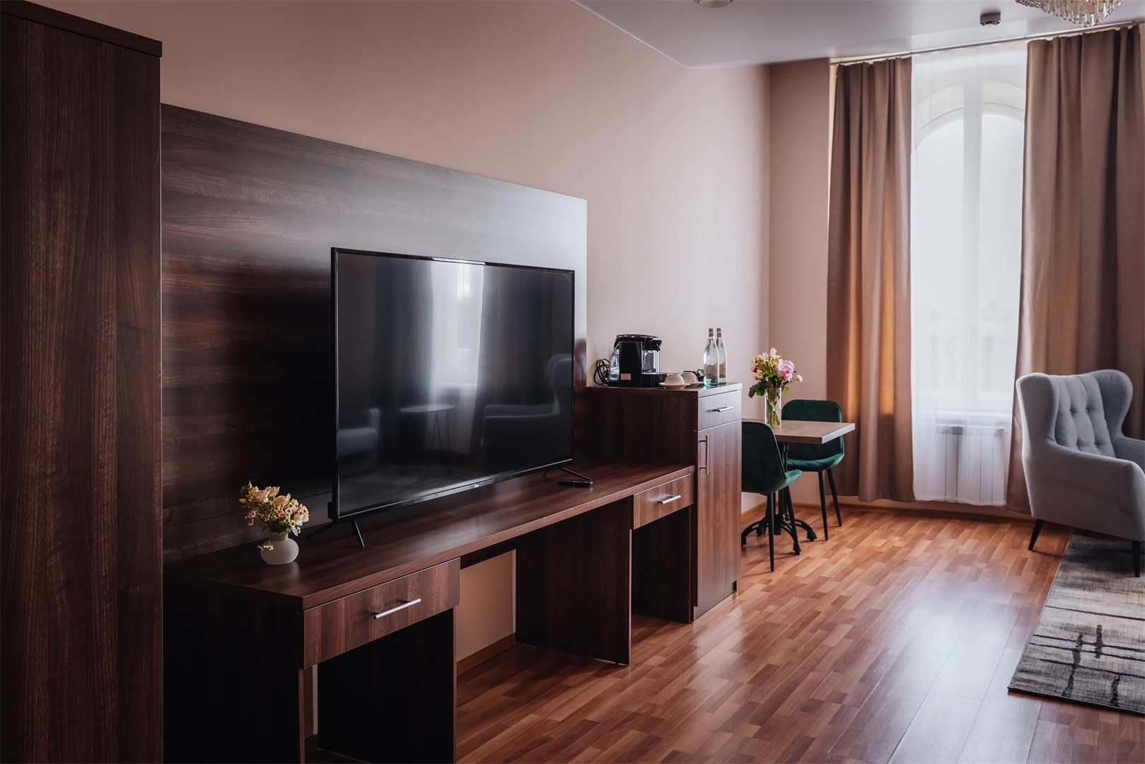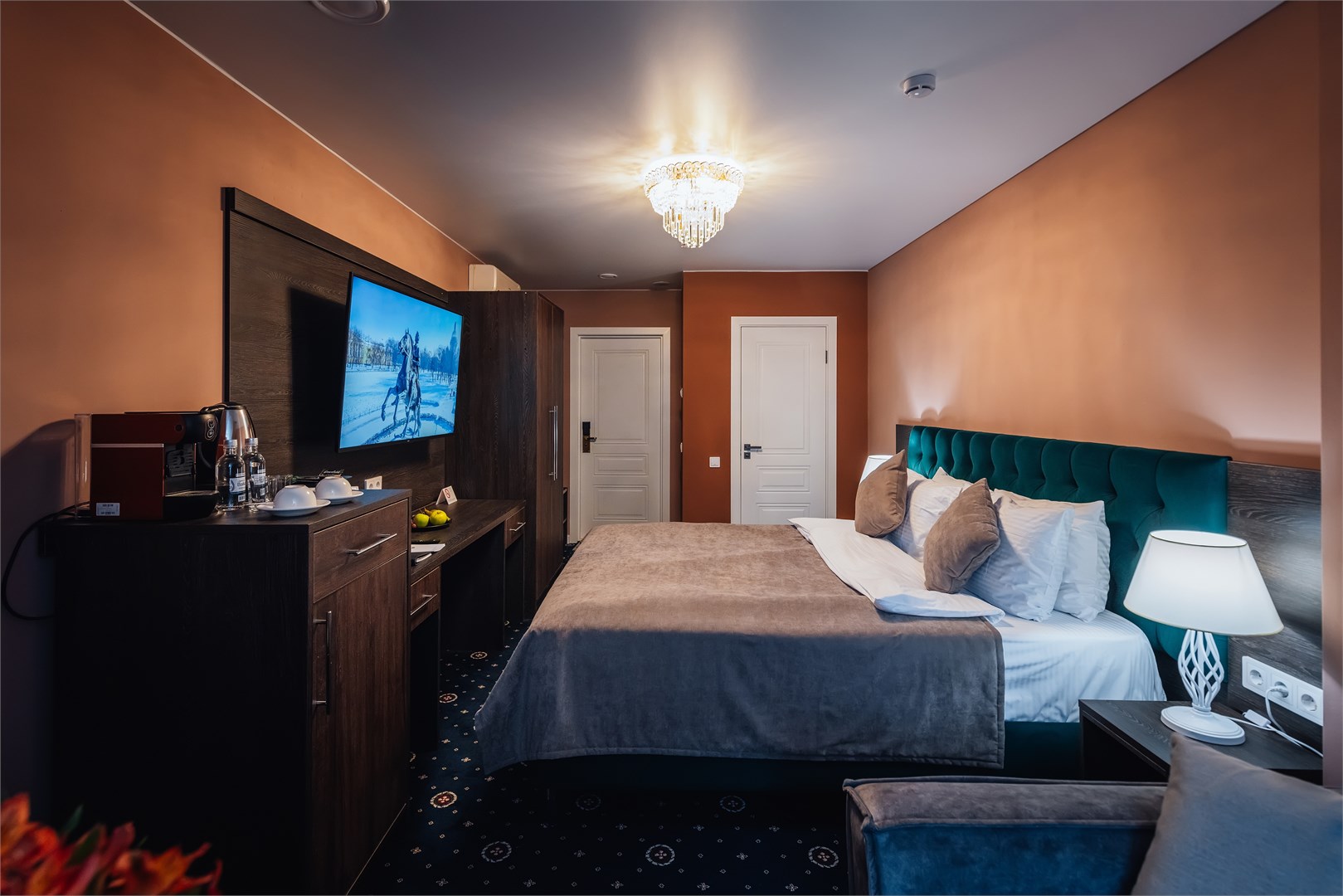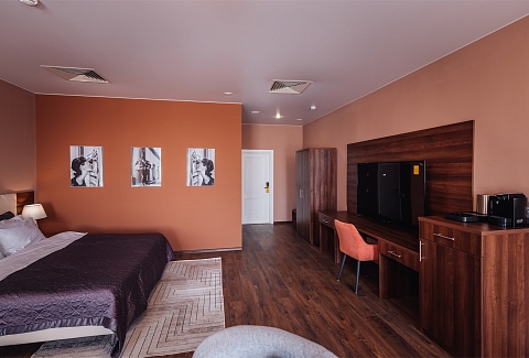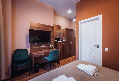 В номере: диван, зеркало, кровать двуспальная, прикроватные тумбочки, стол, стулья, шкаф, кофемашина, мини-холодильник, сейф, сплит-система, телевизор, телефон, чайный набор посуды, электрочайник