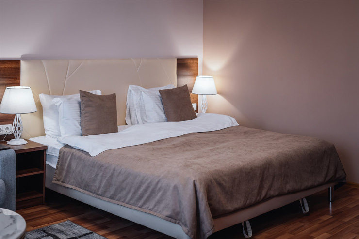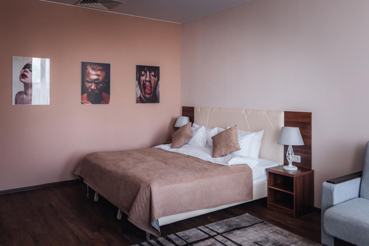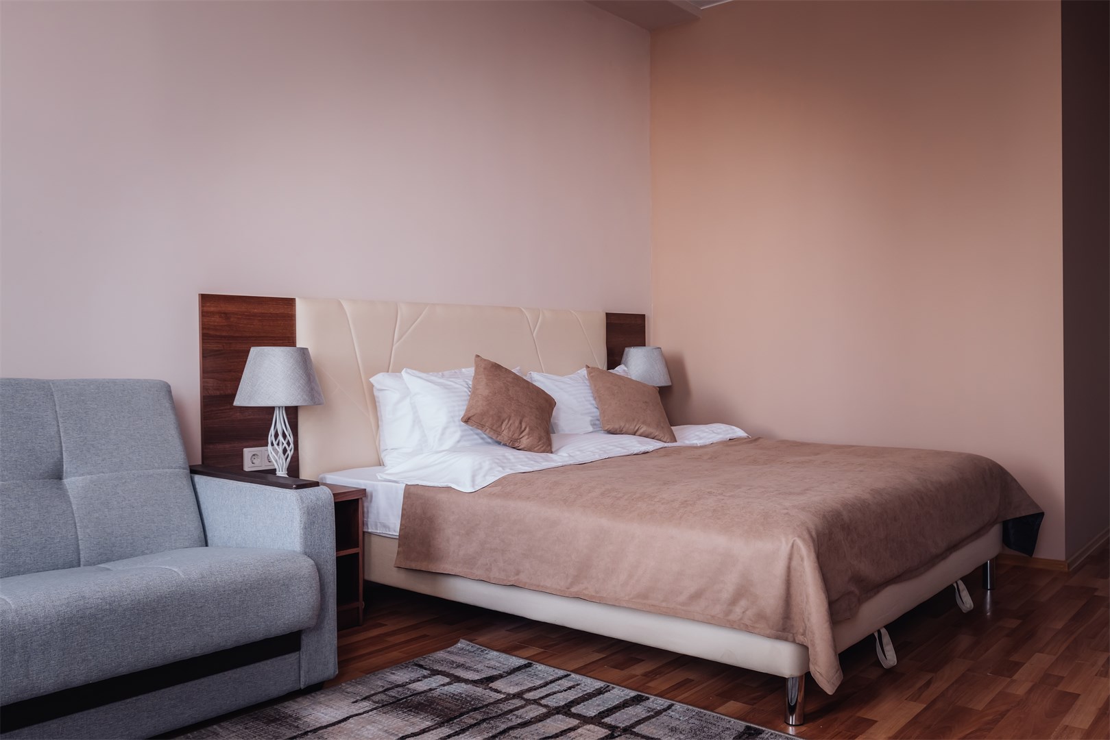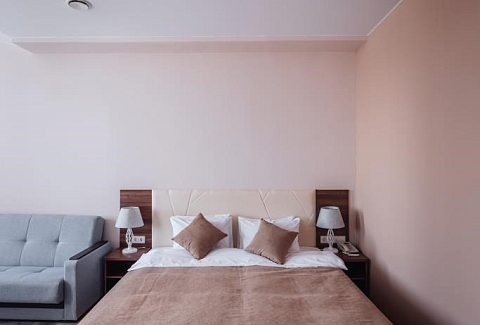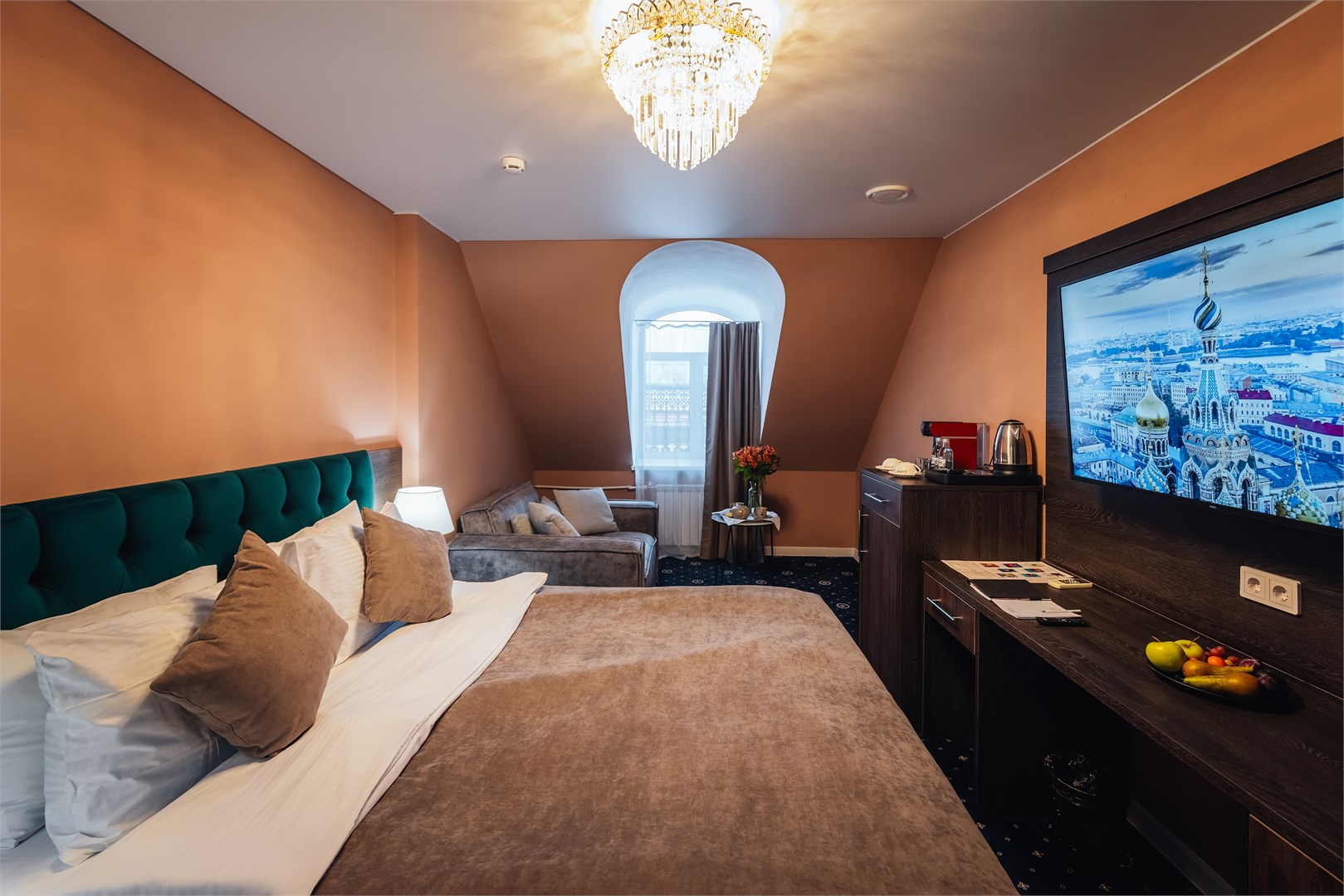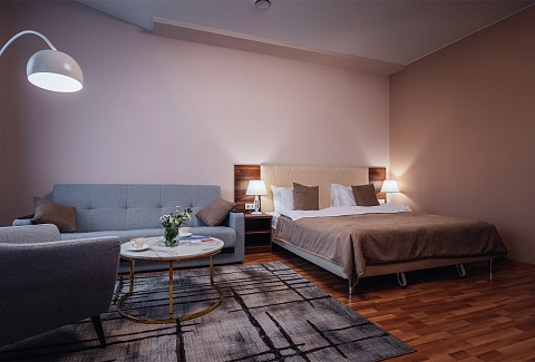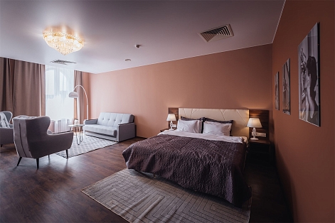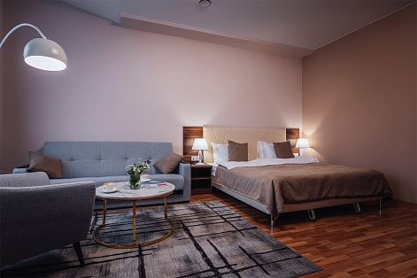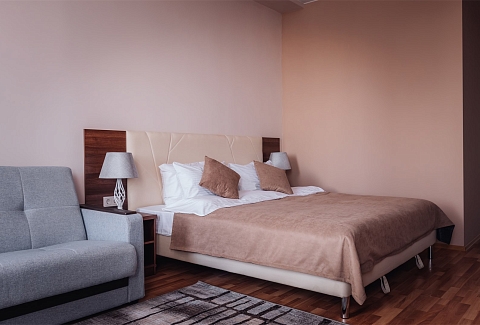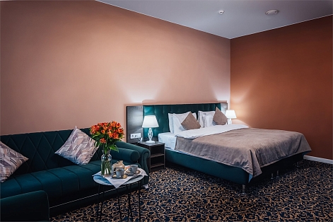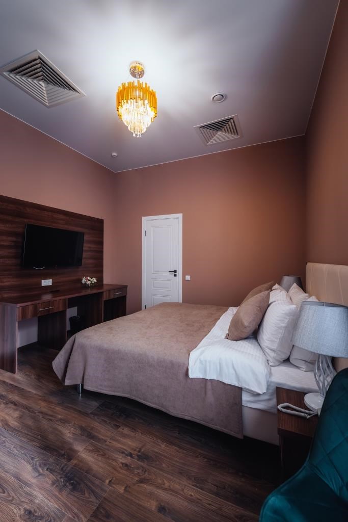 В номере: диван, зеркало, кровать двуспальная, прикроватные тумбочки, стол, стулья, шкаф, кофемашина, мини-холодильник, сейф, сплит-система, телевизор, телефон, чайный набор посуды, электрочайник