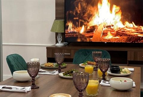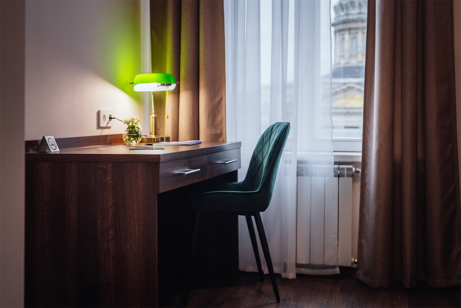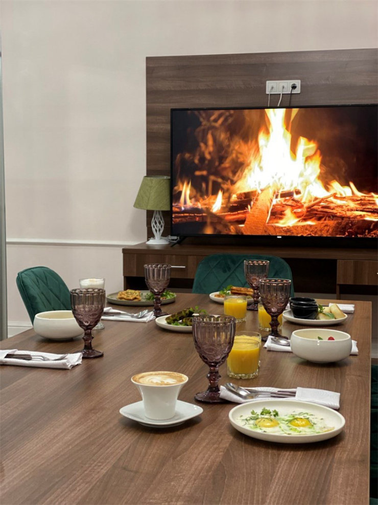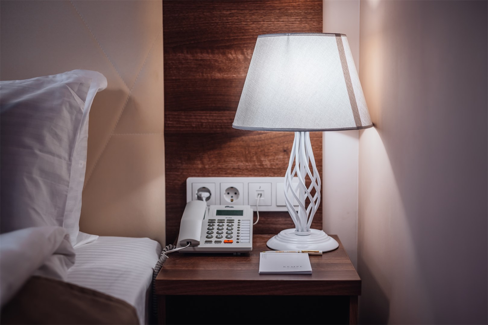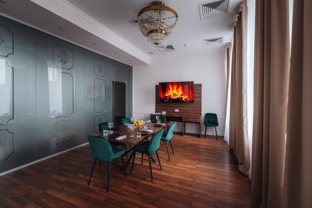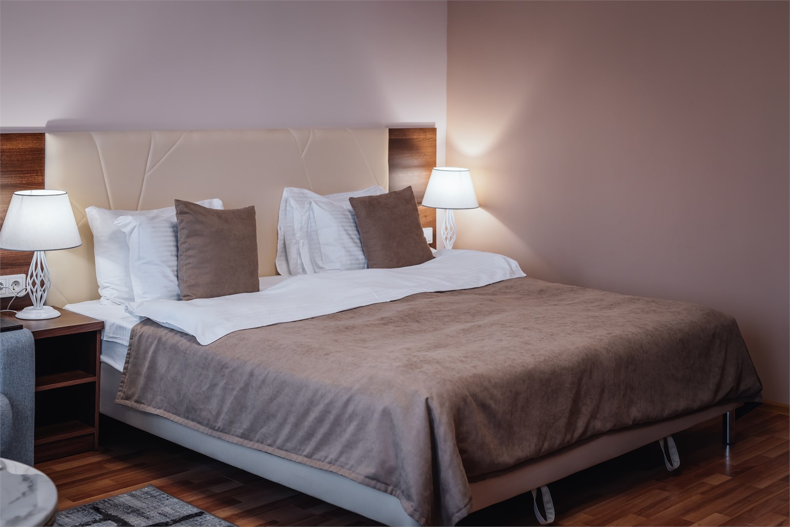 В номере: диван, зеркало, кровать двуспальная, прикроватные тумбочки, стол, стулья, шкаф, кофемашина, мини-холодильник, сейф, сплит-система, телевизор, телефон, чайный набор посуды, электрочайник