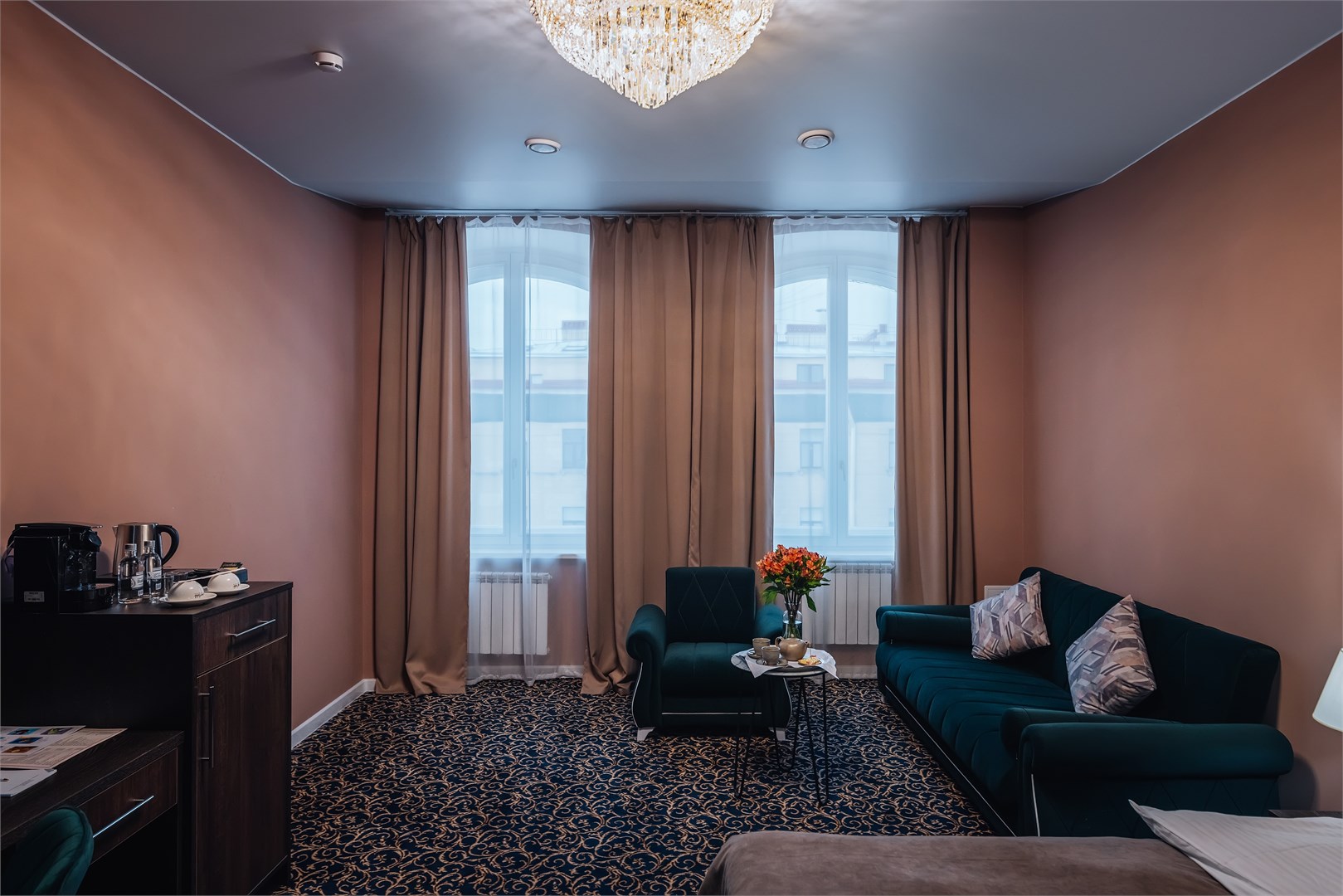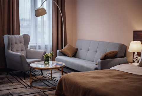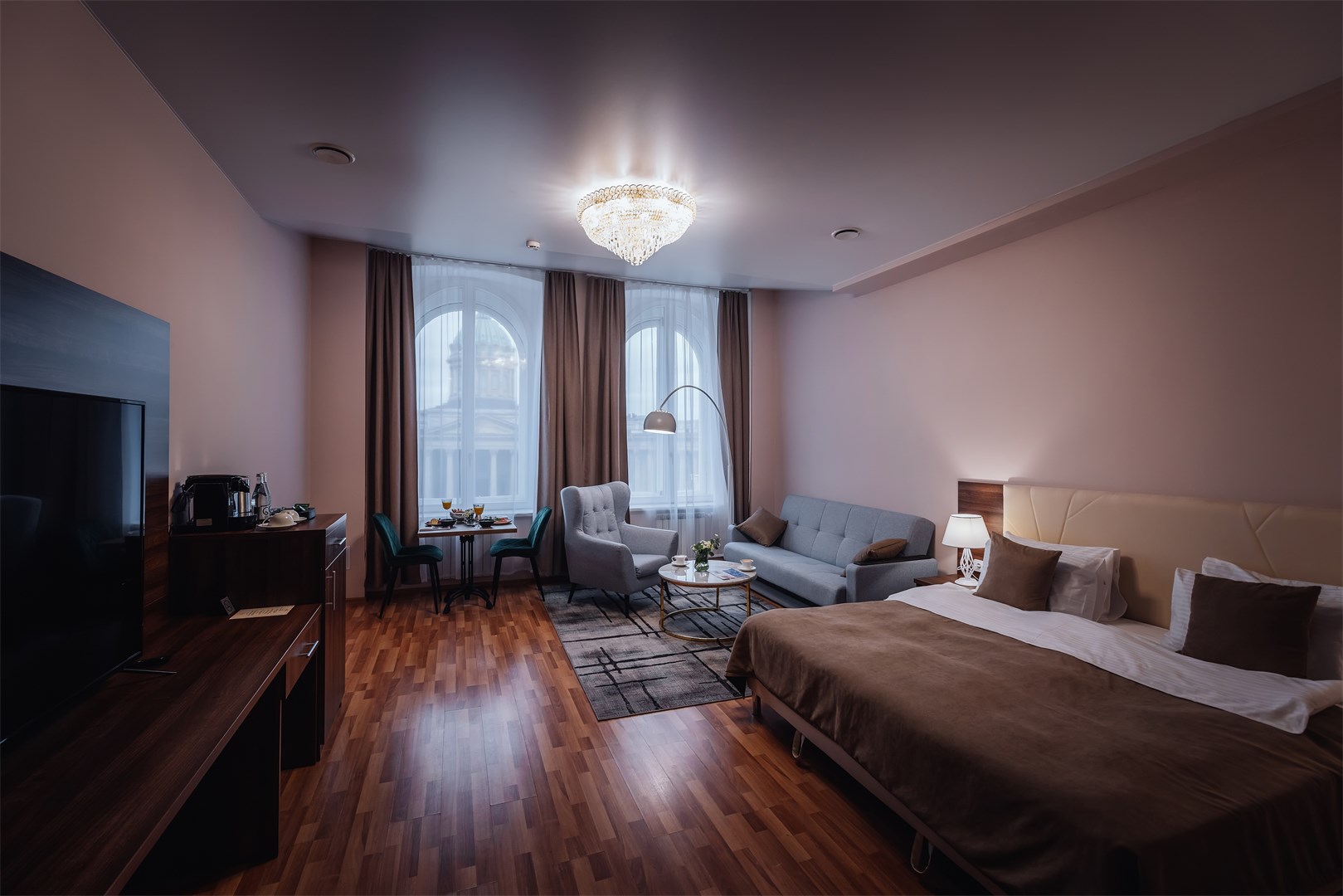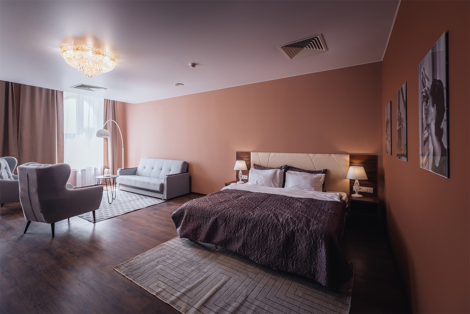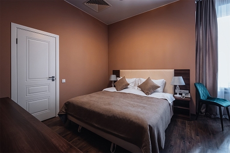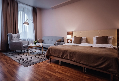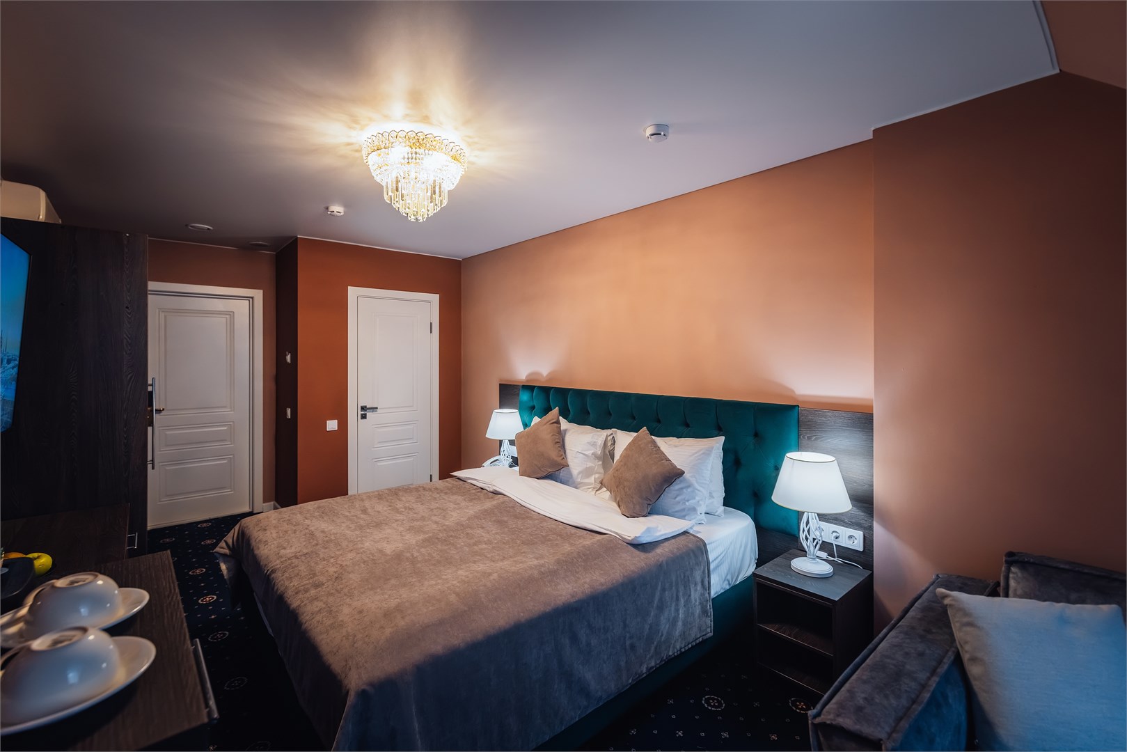 В номере: диван, зеркало, кресла, кровать двуспальная, прикроватные тумбочки, стол, стулья, шкаф, кофемашина, мини-холодильник, сейф, сплит-система, телевизор, телефон, чайный набор посуды, электрочайник