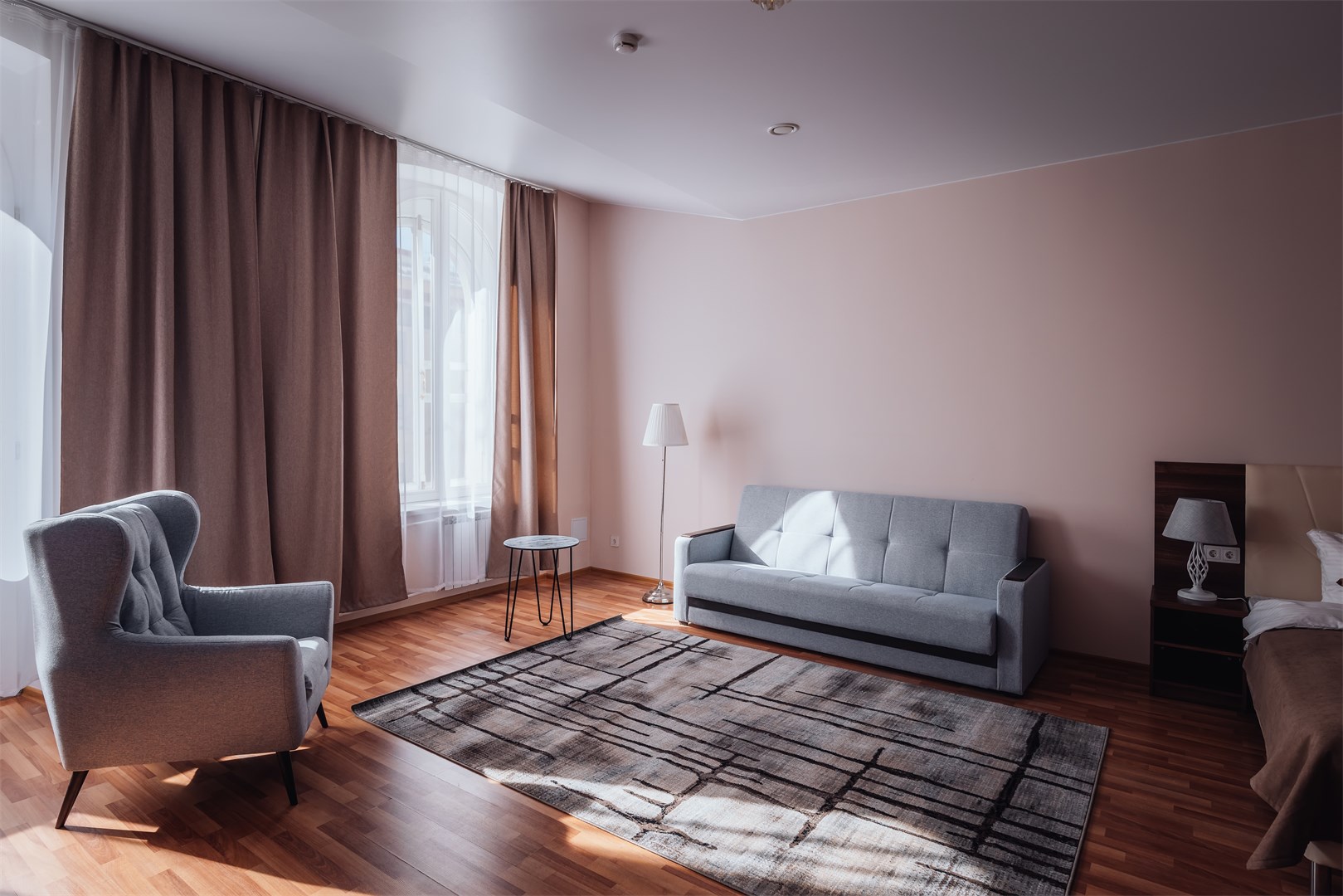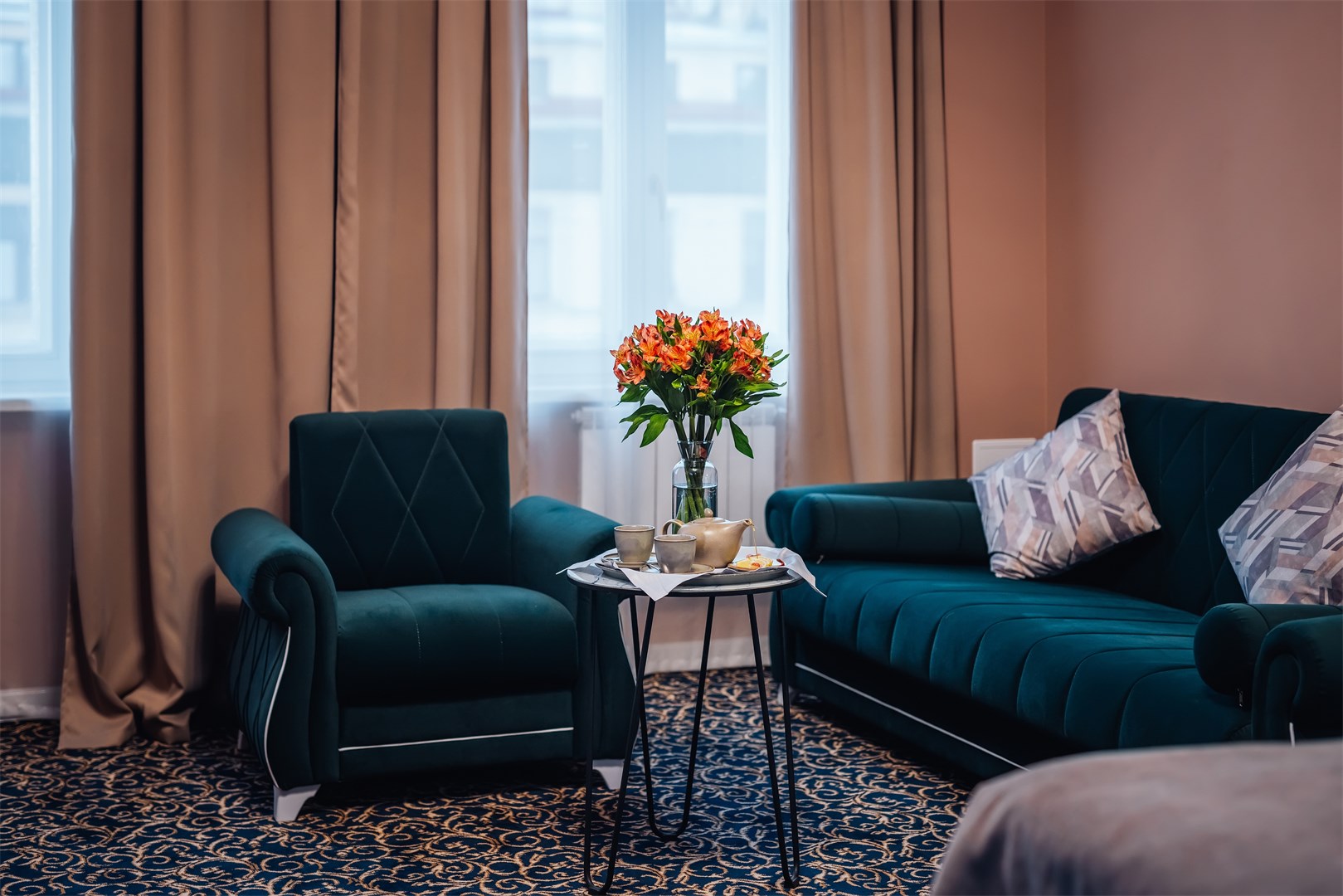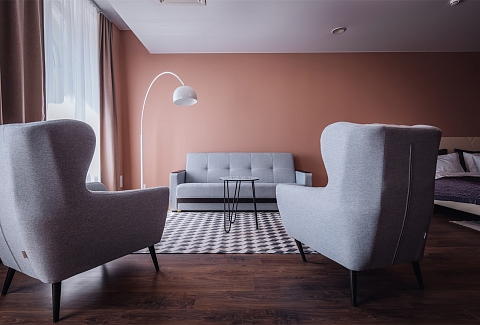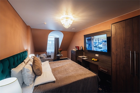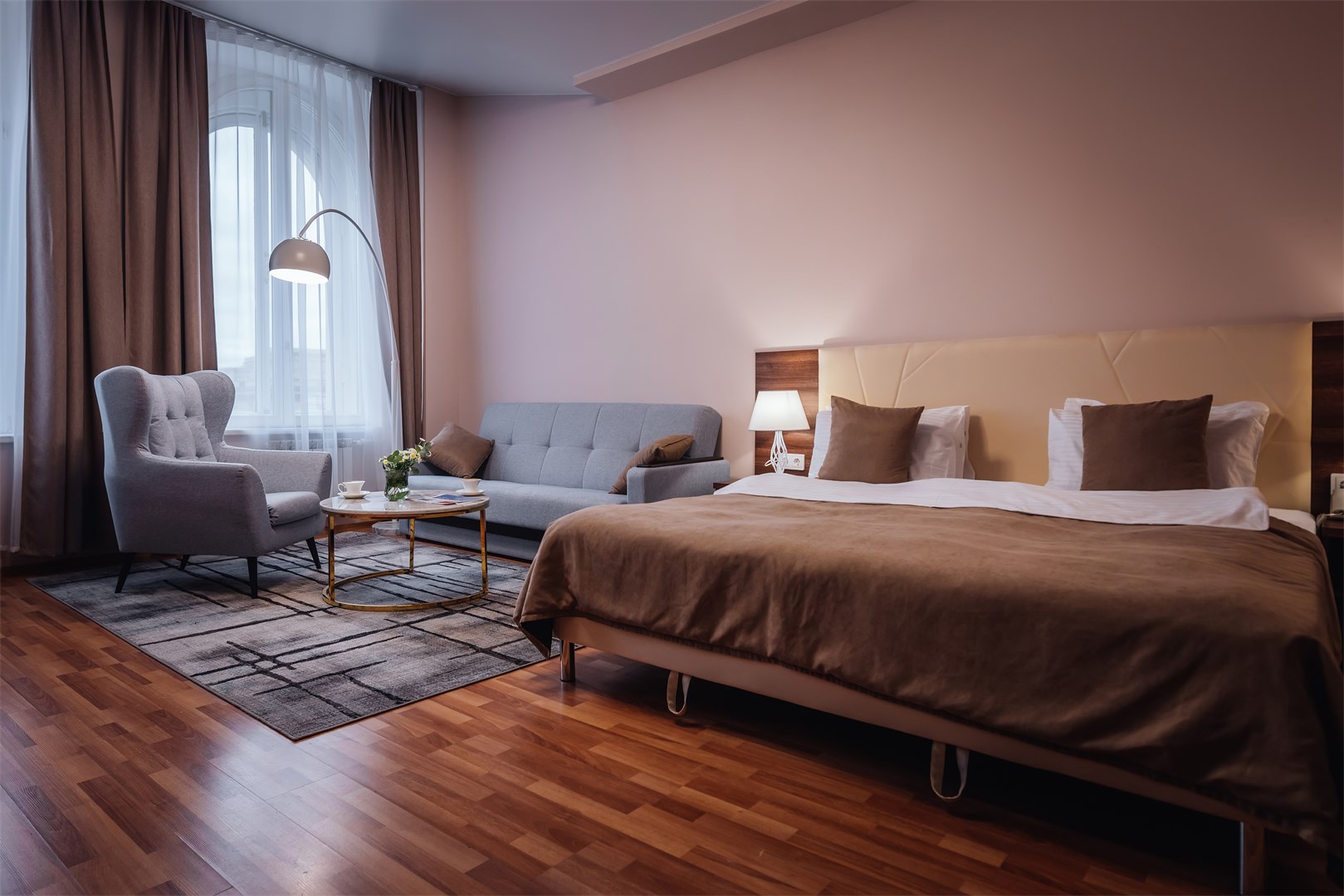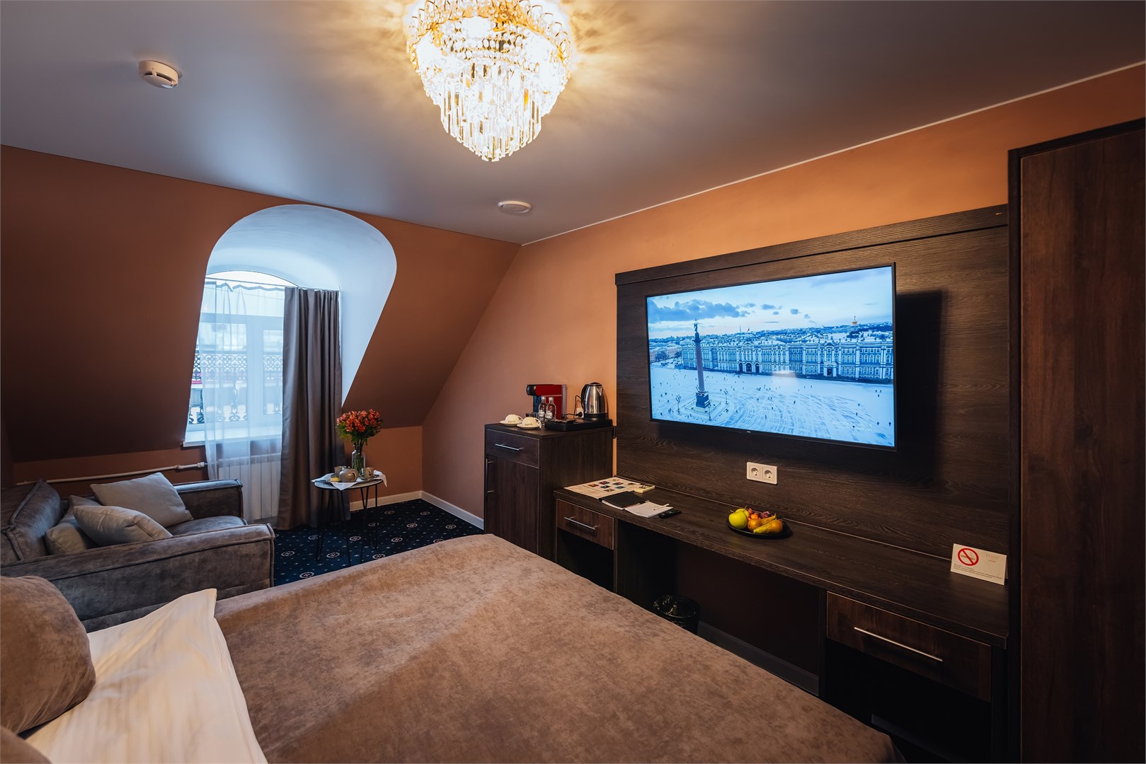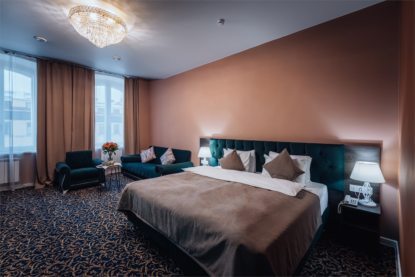 В номере: диван, зеркало, кресла, кровать двуспальная, прикроватные тумбочки, стол, стулья, шкаф, кофемашина, мини-холодильник, сейф, сплит-система, телевизор, телефон, чайный набор посуды, электрочайник