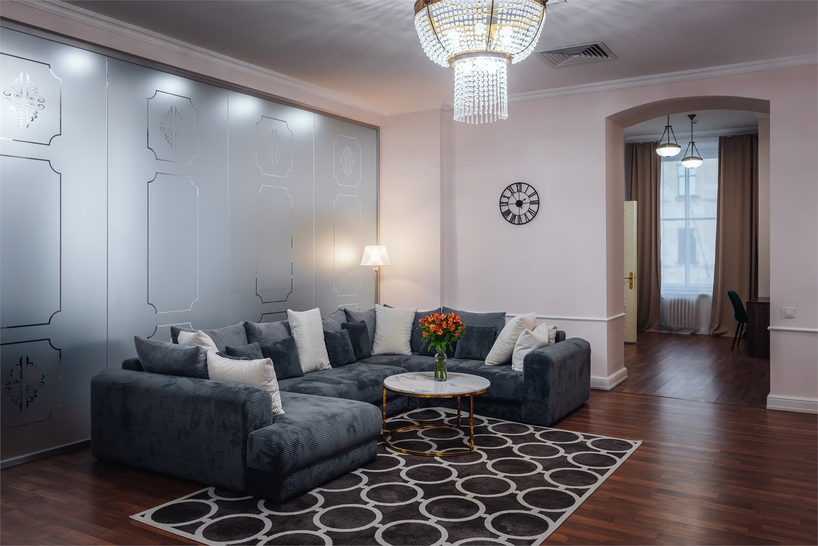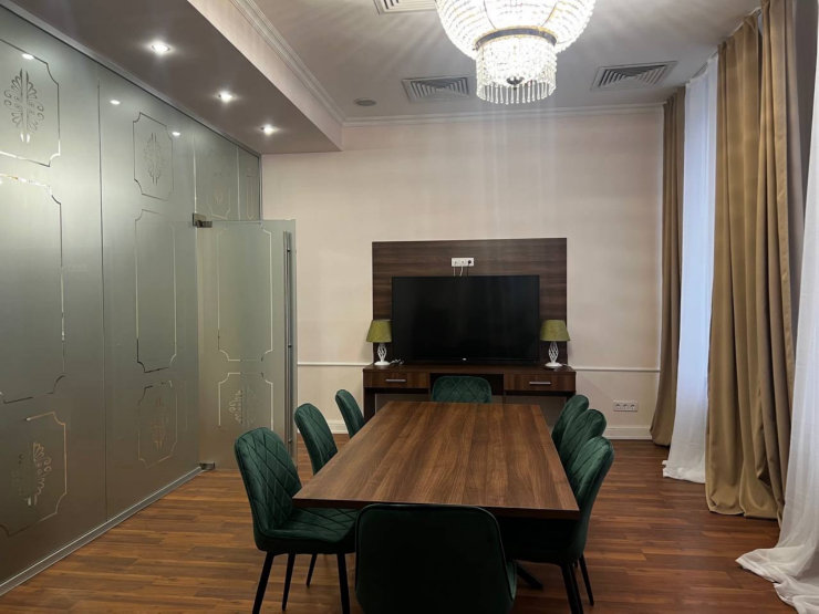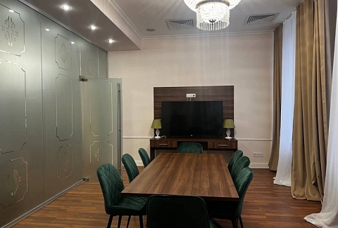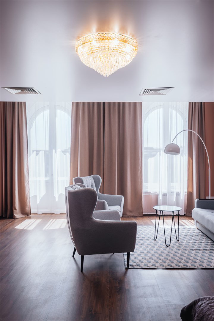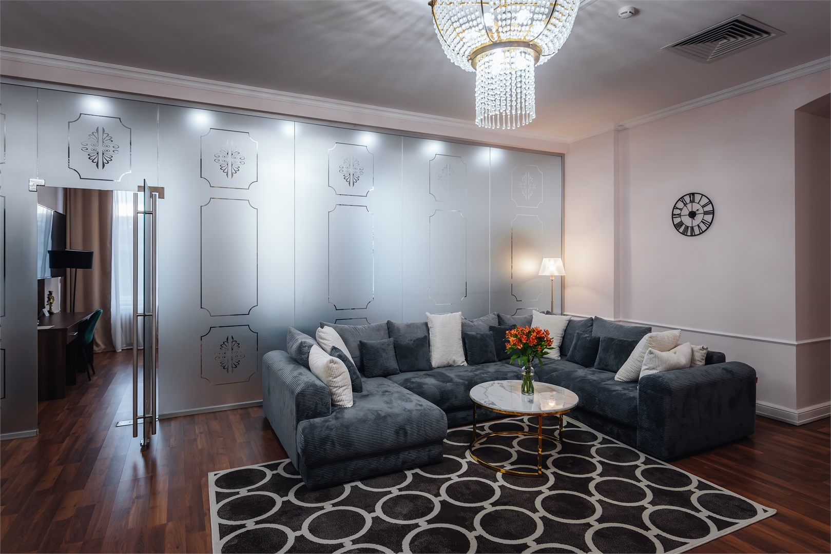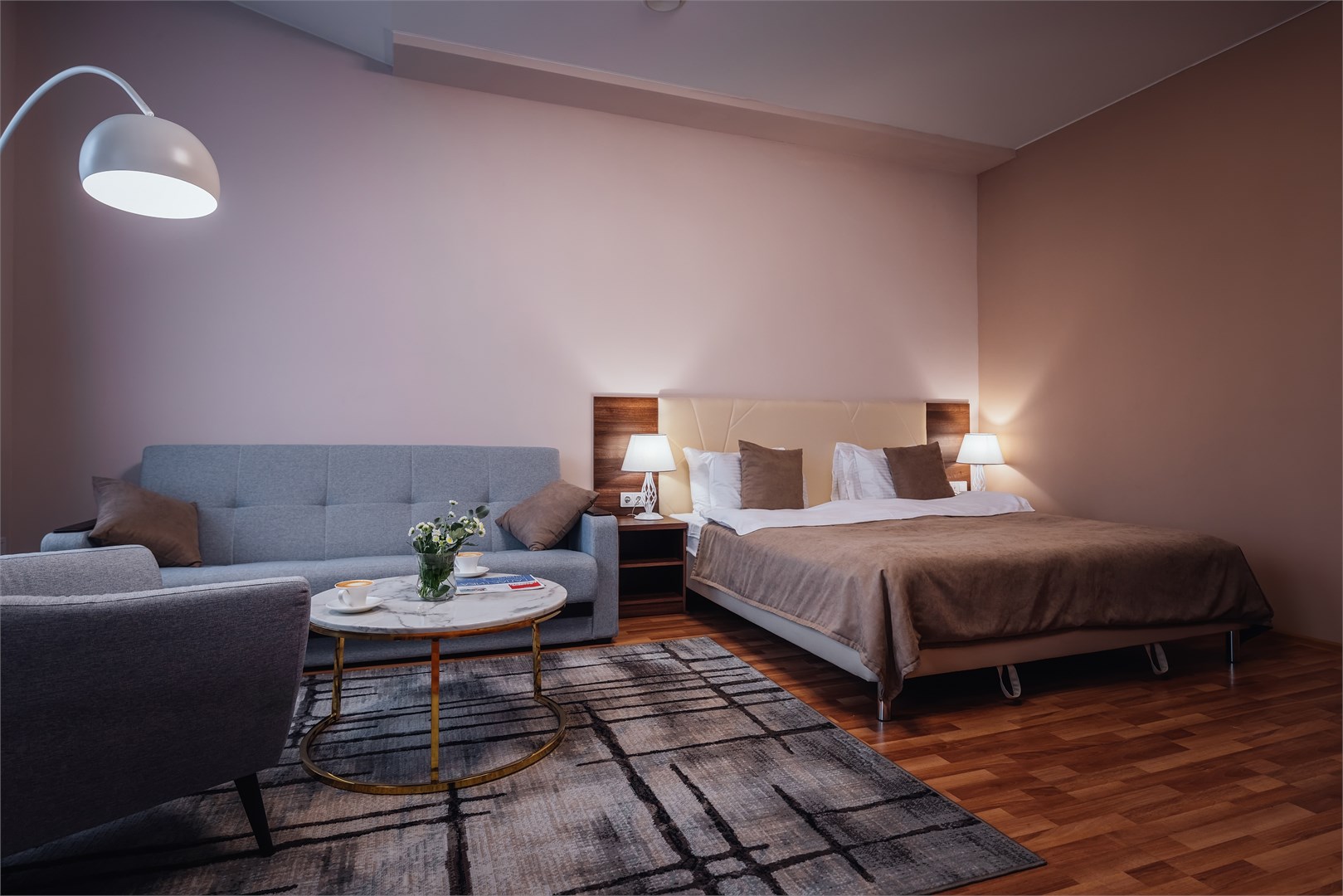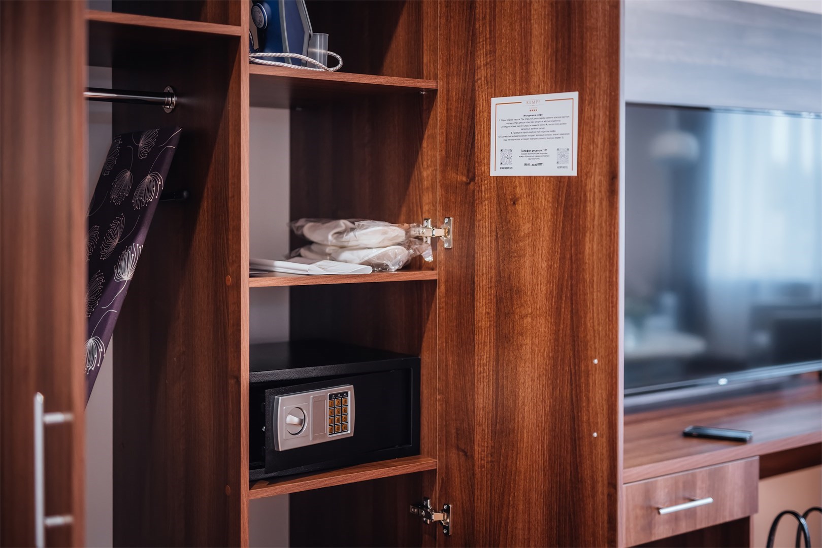 В номере: вешалка, диван раскладной, зеркало, кровать двуспальная, прикроватные тумбочки, стол, стулья, шкаф, гладильная доска, кондиционер, кофемашина, мини-холодильник, сейф, телевизор, телефон, утюг, чайная станция, чайный набор посуды, электрочайник