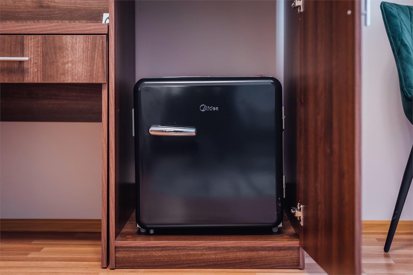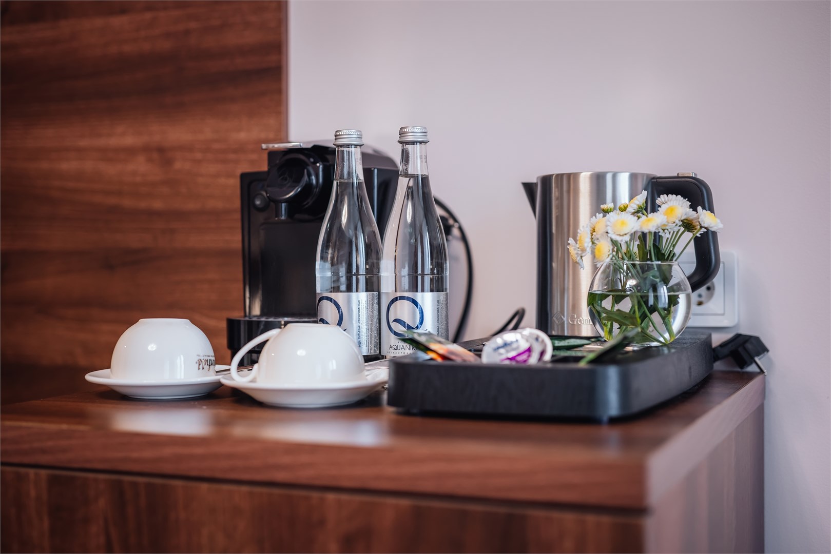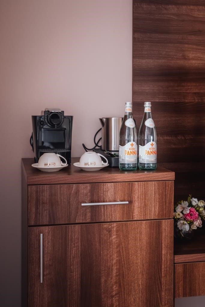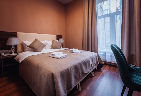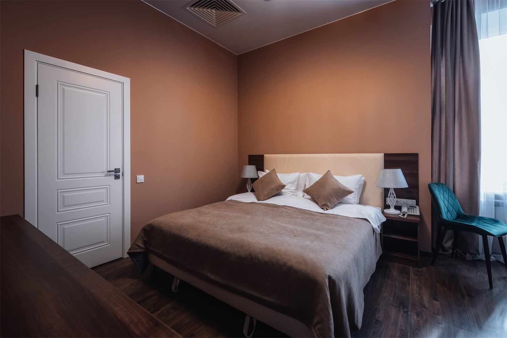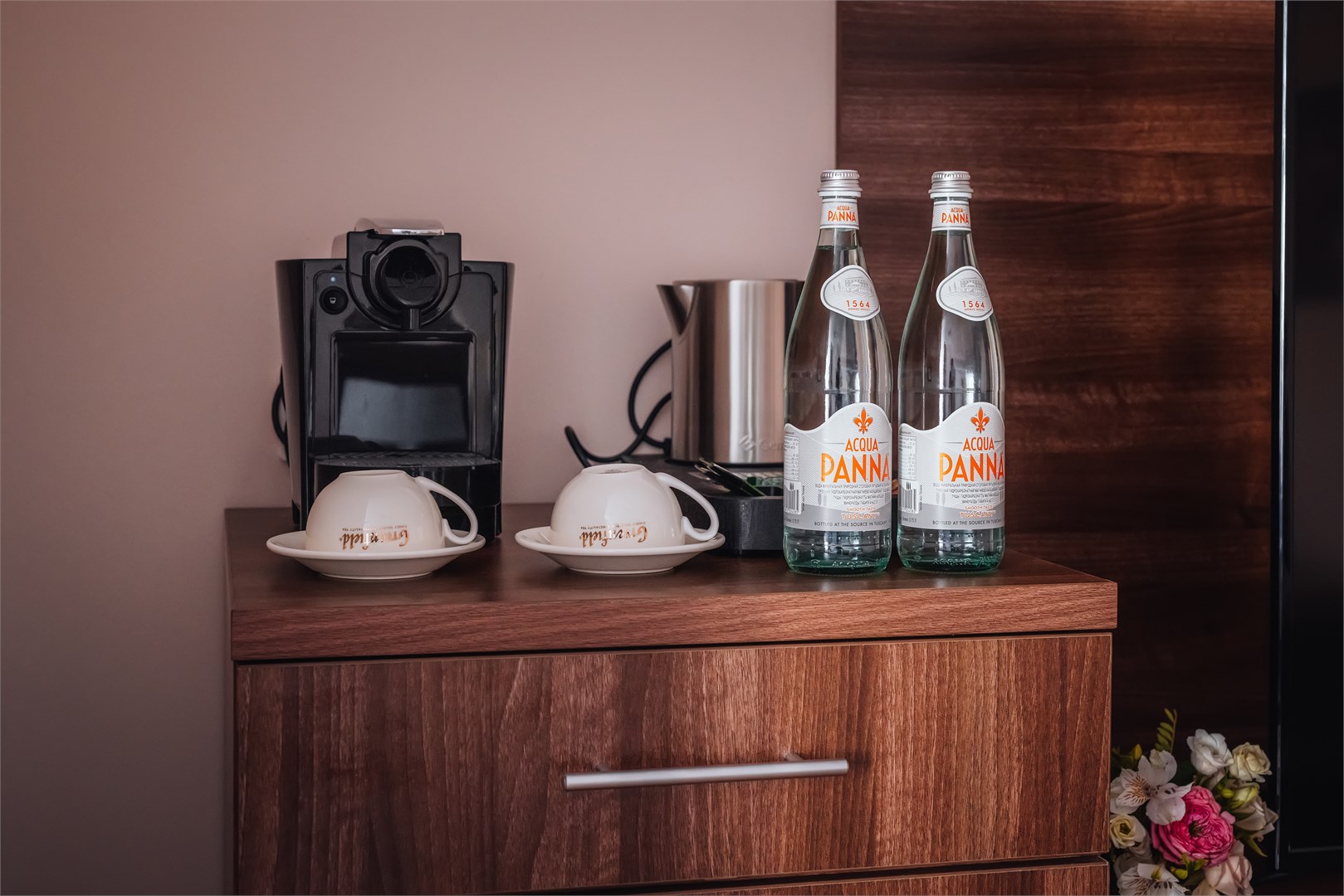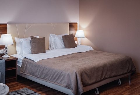В номере: зеркало, кровать двуспальная, прикроватные тумбочки, стол, стулья, шкаф, кофемашина, мини-холодильник, сейф, сплит-система, телевизор, телефон, чайный набор посуды, электрочайник