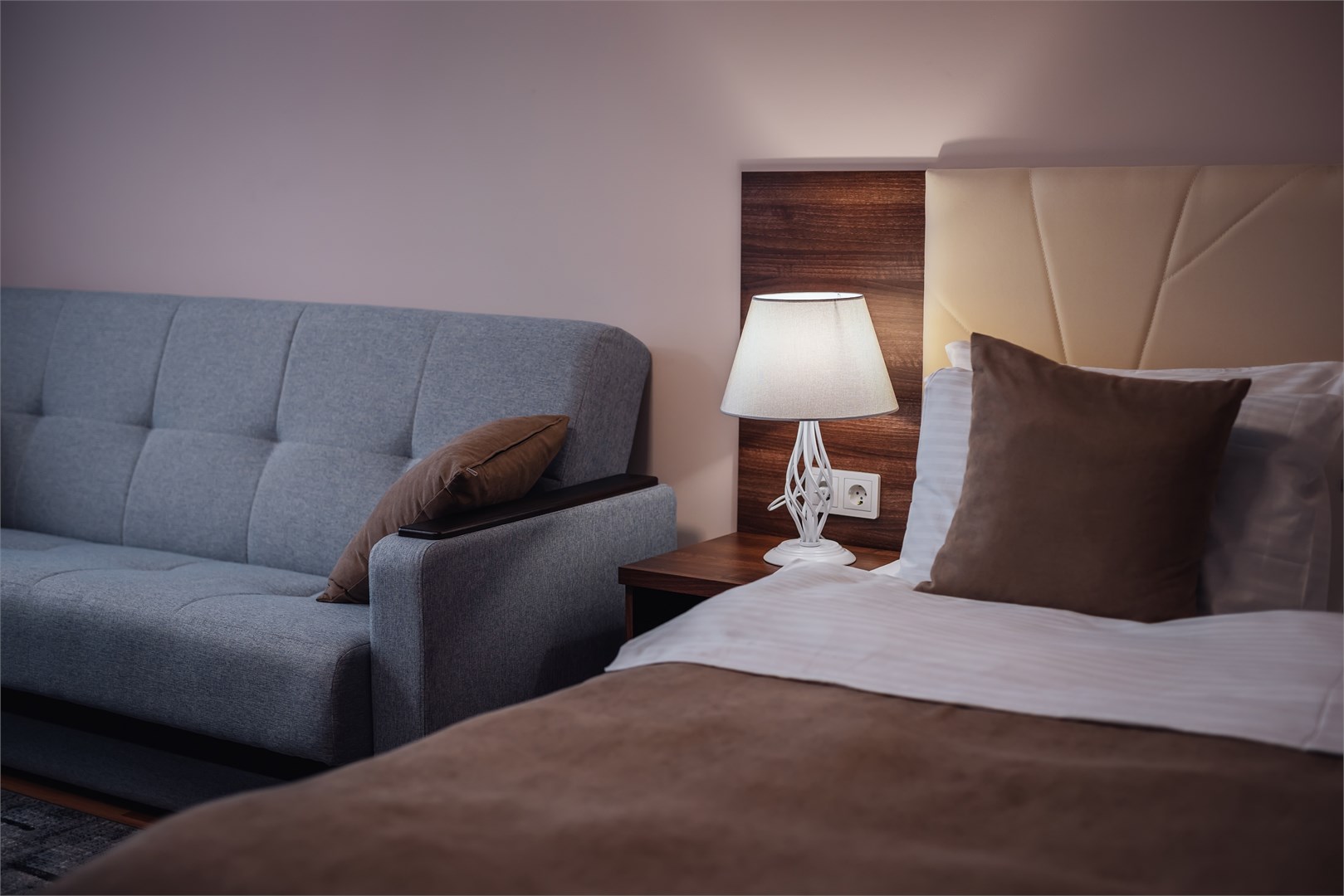 В номере: диван, зеркало, кровати односпальные, кровать двуспальная, прикроватные тумбочки, стол, стулья, шкаф, кофемашина, мини-холодильник, сейф, сплит-система, телевизор, телефон, чайный набор посуды, электрочайник