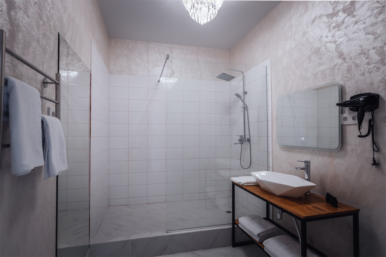 Санузел: с душем, тапочки, туалетные принадлежности, фен