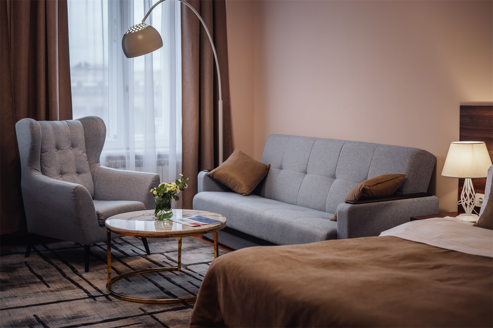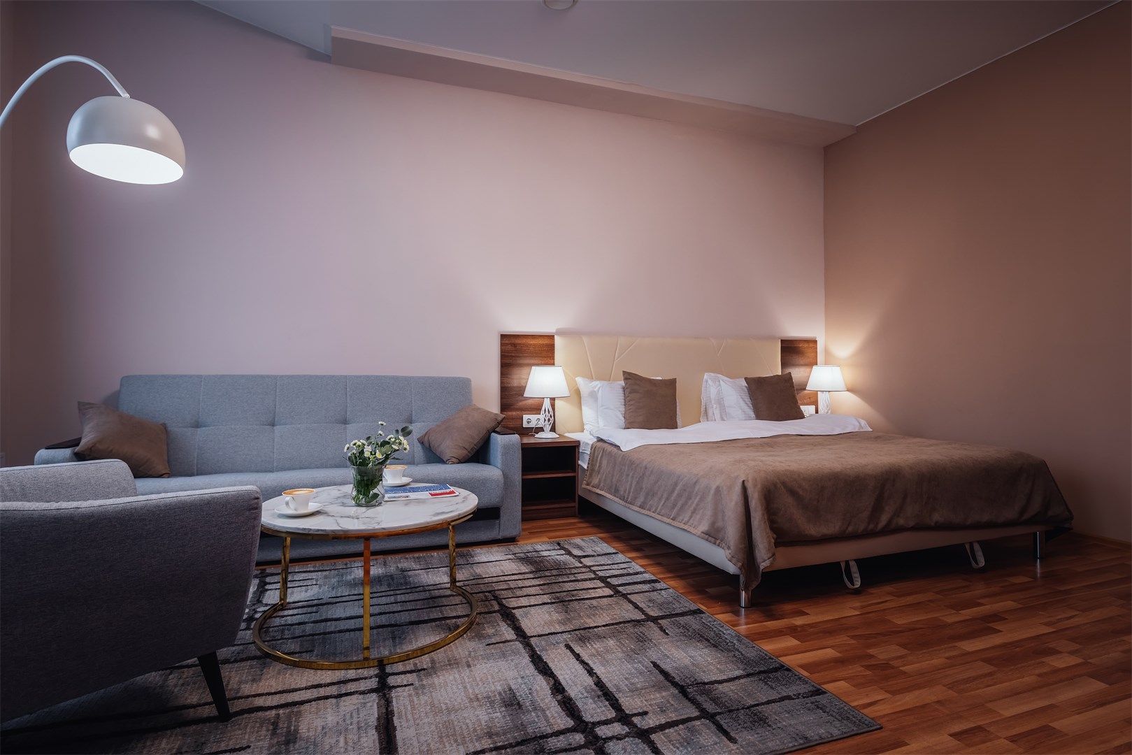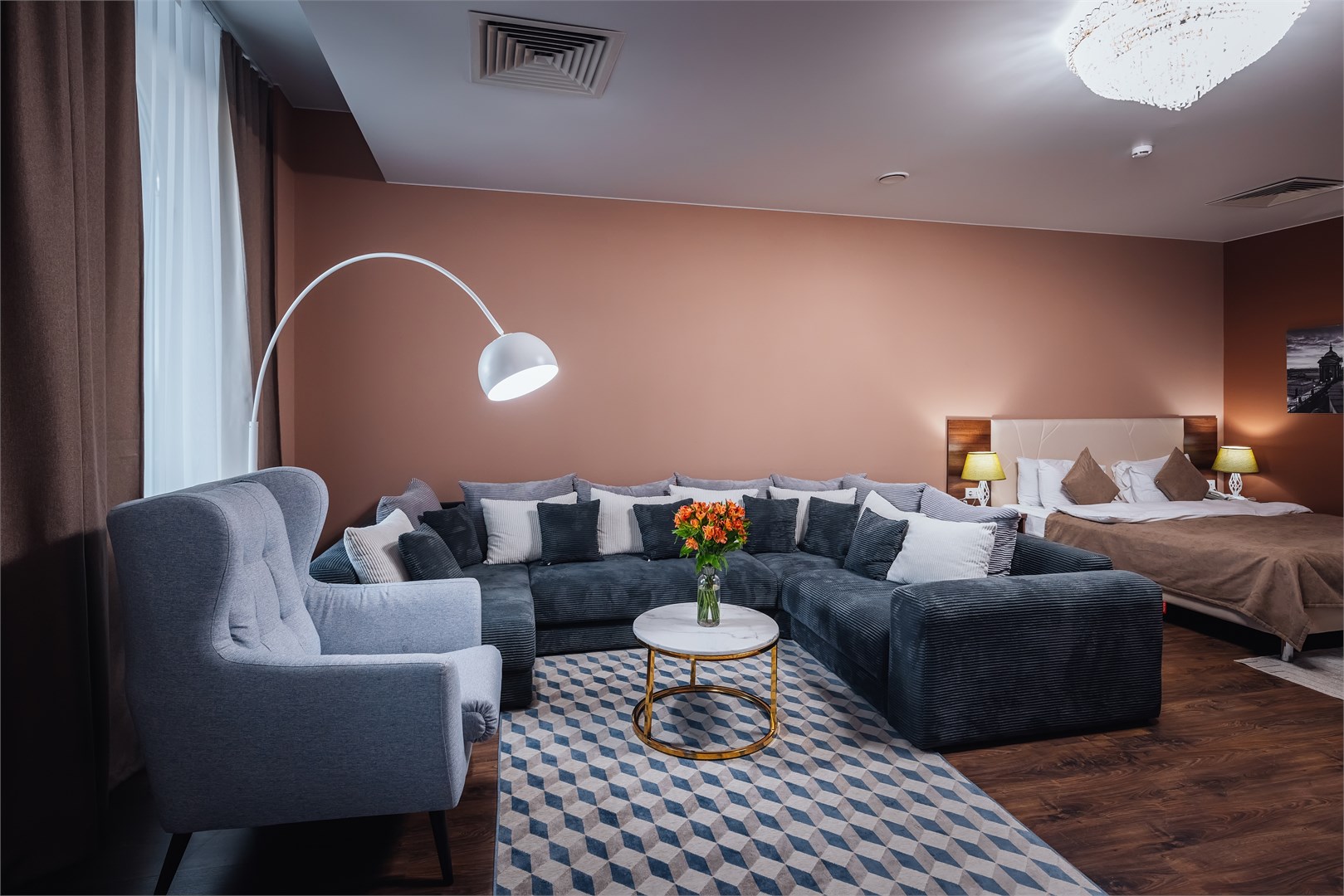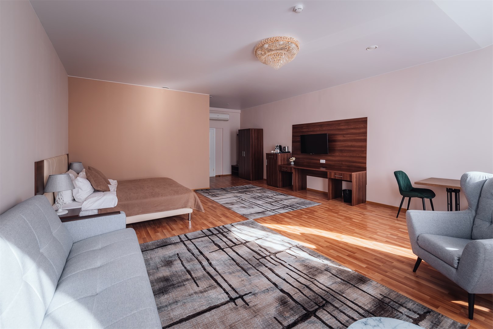 В номере: диван раскладной, кровать двуспальная, прикроватные тумбочки, стол, стулья, шкаф, гладильная доска, кондиционер, кофемашина, мини-холодильник, сейф, телевизор, телефон, утюг, чайный набор посуды, электрочайник