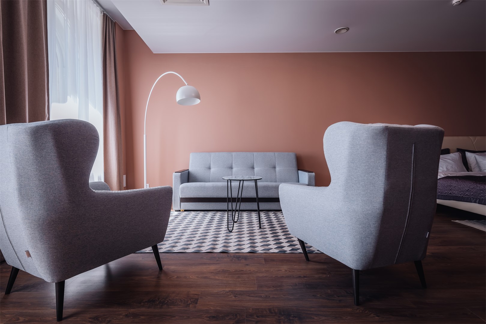 В номере: диван, зеркало, кресла, кровать двуспальная, набор мягкой мебели, прикроватные тумбочки, стол, стулья, шкаф, гладильная доска, кондиционер, кофемашина, мини-холодильник, сейф, телевизор, телефон, утюг, чайный набор посуды