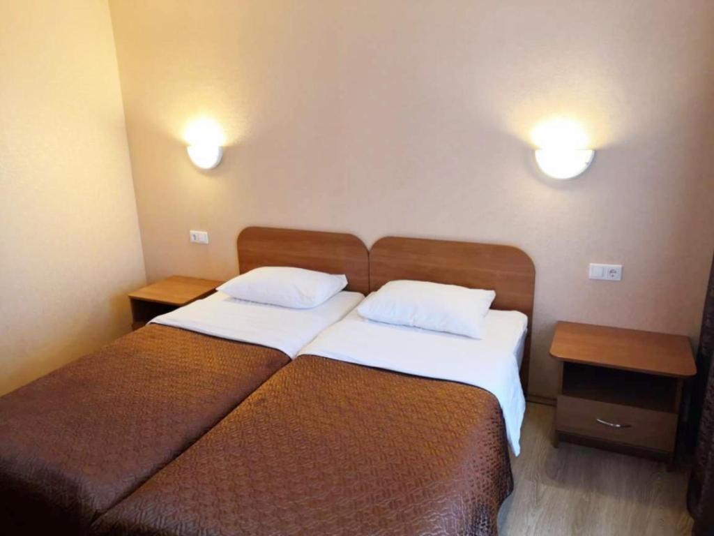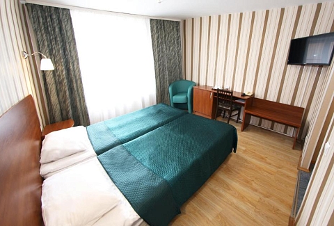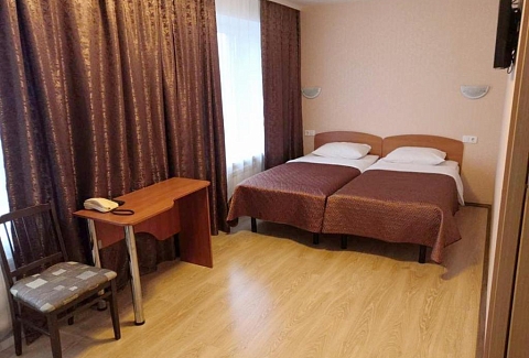 В номере: вешалка, зеркало, кровати односпальные, прикроватные тумбочки, стол, стулья, шкаф, телевизор, телефон, холодильник