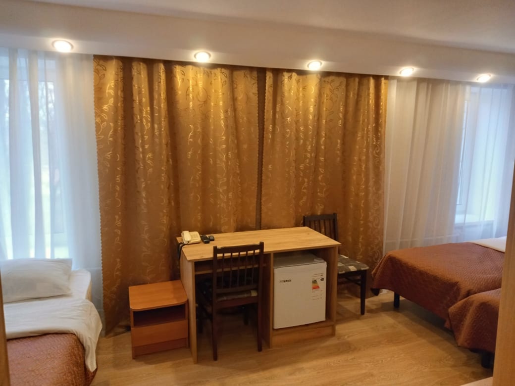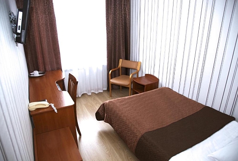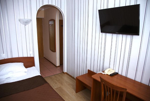 В номере: вешалка, зеркало, кровать полутороспальная, прикроватные тумбочки, стол, стул, шкаф, телевизор, телефон, холодильник