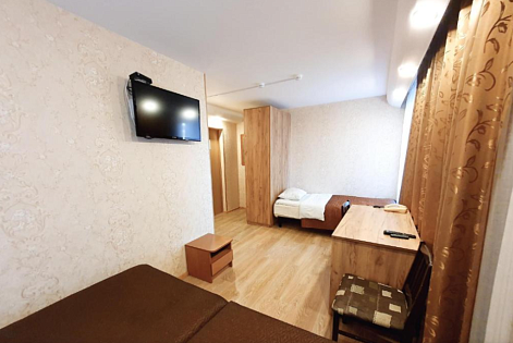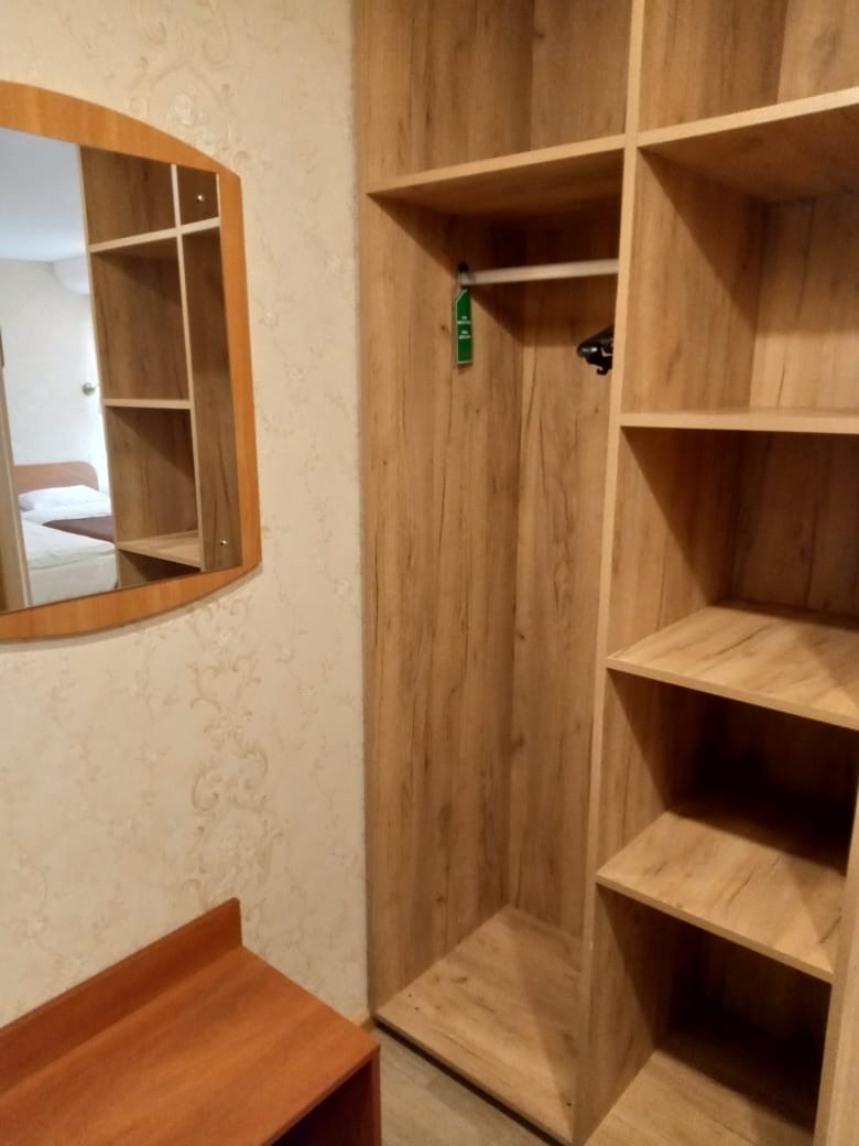 В номере: вешалка, зеркало, кровати односпальные, прикроватные тумбочки, стол, стулья, шкаф, телевизор, телефон