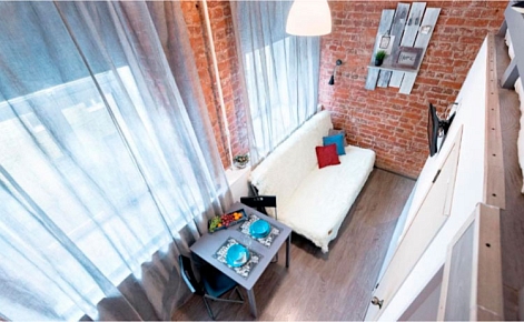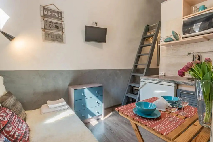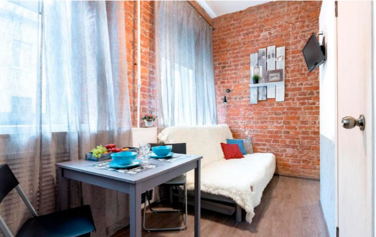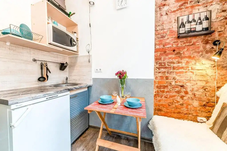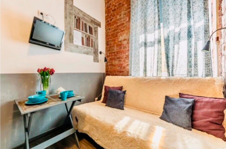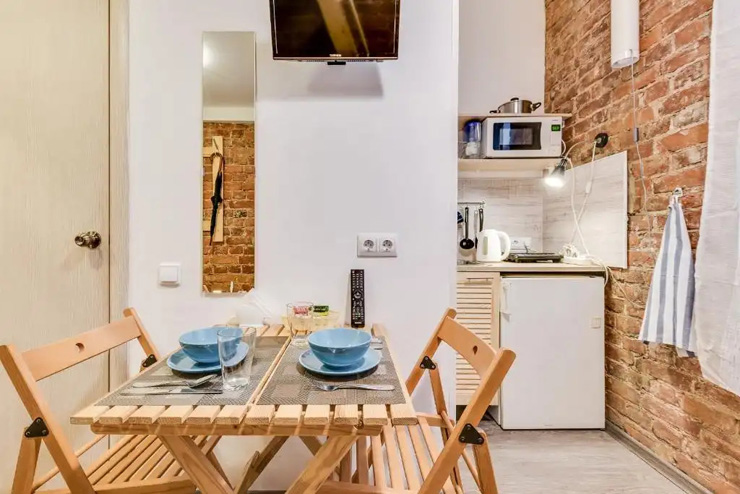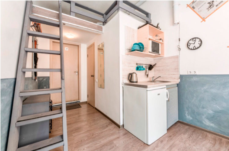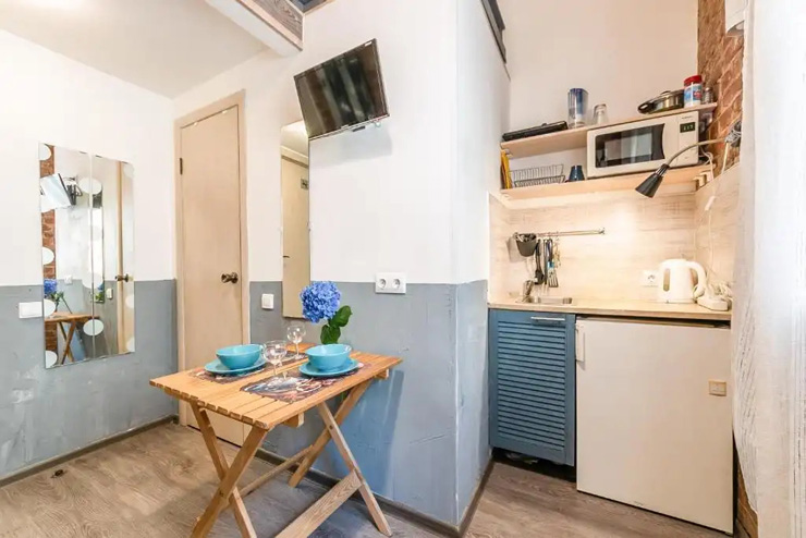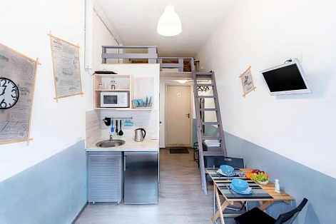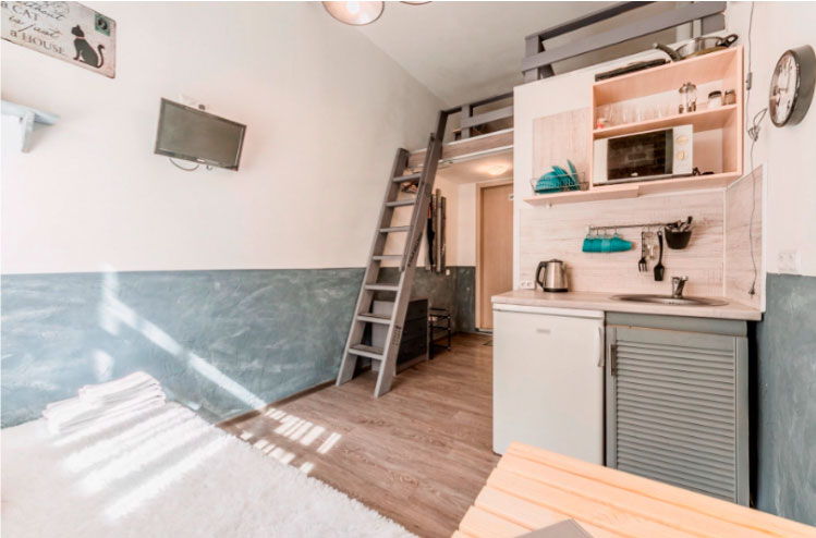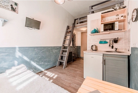 В номере: вешалка, диван раскладной, зеркало, комод, кровать двуспальная, стол, микроволновая печь, мини-холодильник, набор посуды, плита электрическая, телевизор, электрочайник
