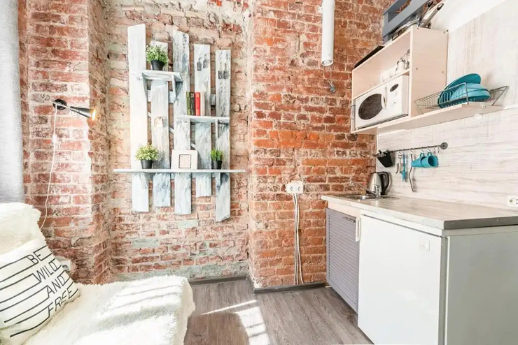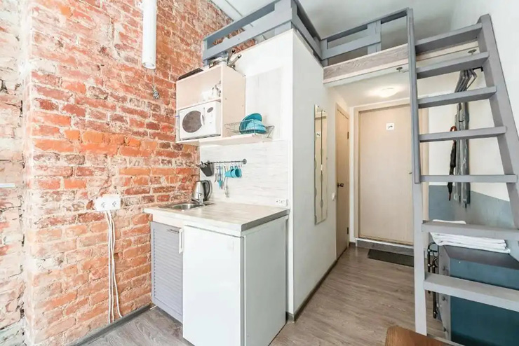 В номере: вешалка, диван, зеркало, комод, кровать двуспальная, стол, микроволновая печь, мини-холодильник, набор посуды, плита электрическая, телевизор, электрочайник