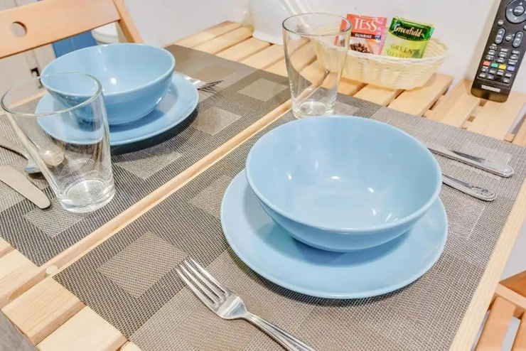 В номере: вешалка, диван раскладной, зеркало, комод, кровать двуспальная, стол, стулья, микроволновая печь, мини-холодильник, набор посуды, плита электрическая, телевизор, электрочайник
