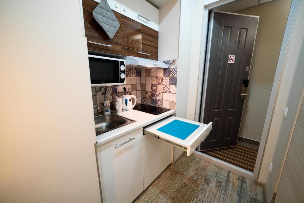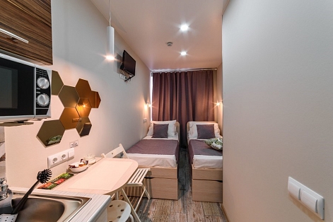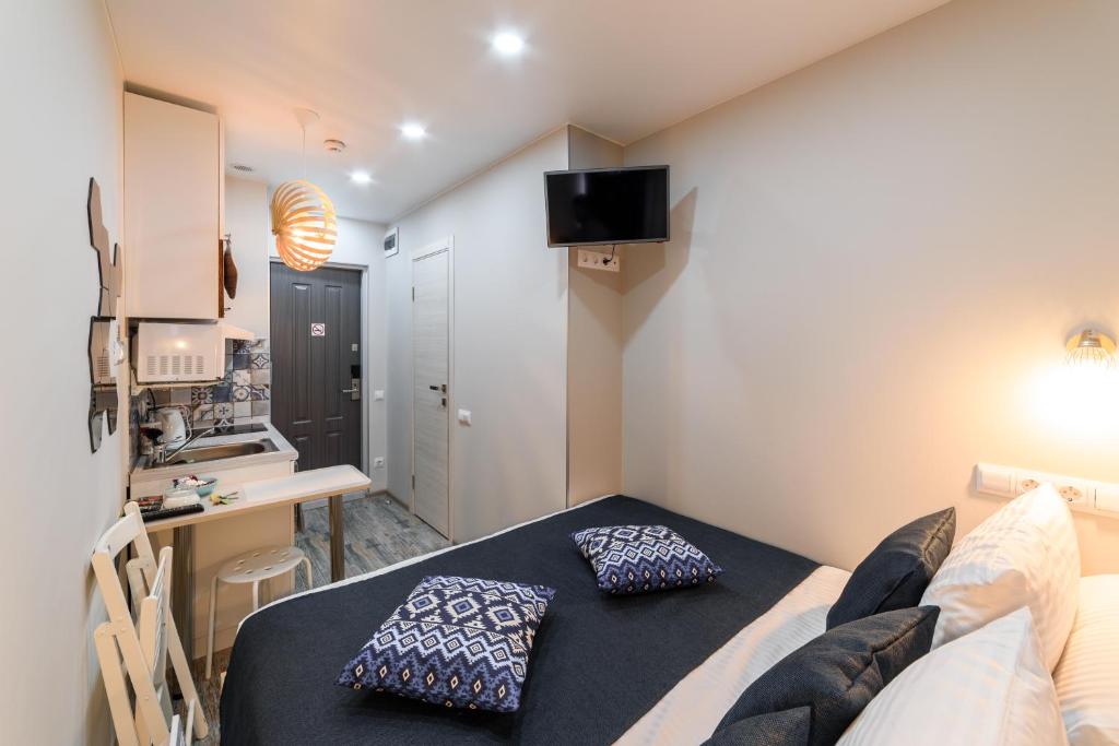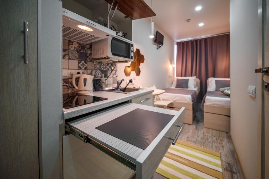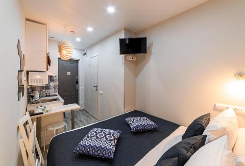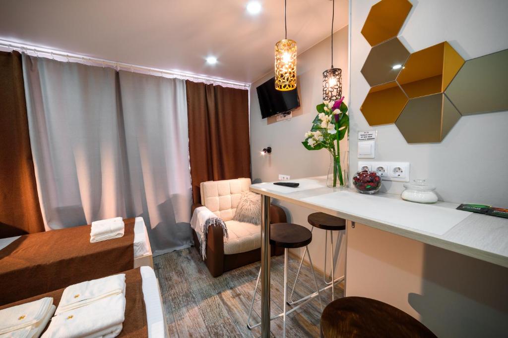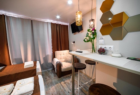 В распоряжении гостей уютный квартиры-студии, оборудованные собственной мини-кухней. В номерах есть плазменный телевизор, вентилятор, санузел с душем, где отдыхающих ожидают тапочки и наборы косметических принадлежностей.При наличии свободных мест автовладельцам доступна парковка, также на всей территории отеля доступен беспроводной интернет.
