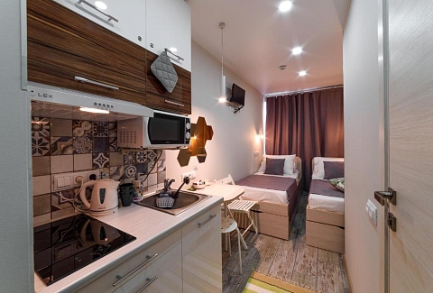 В номере: кресло-кровать, кровати односпальные /одна двуспальная кровать, кухонная мебель, стол, стулья, шкаф, вентилятор, микроволновая печь, набор посуды, плита электрическая, телевизор ЖК, холодильник, электрочайник