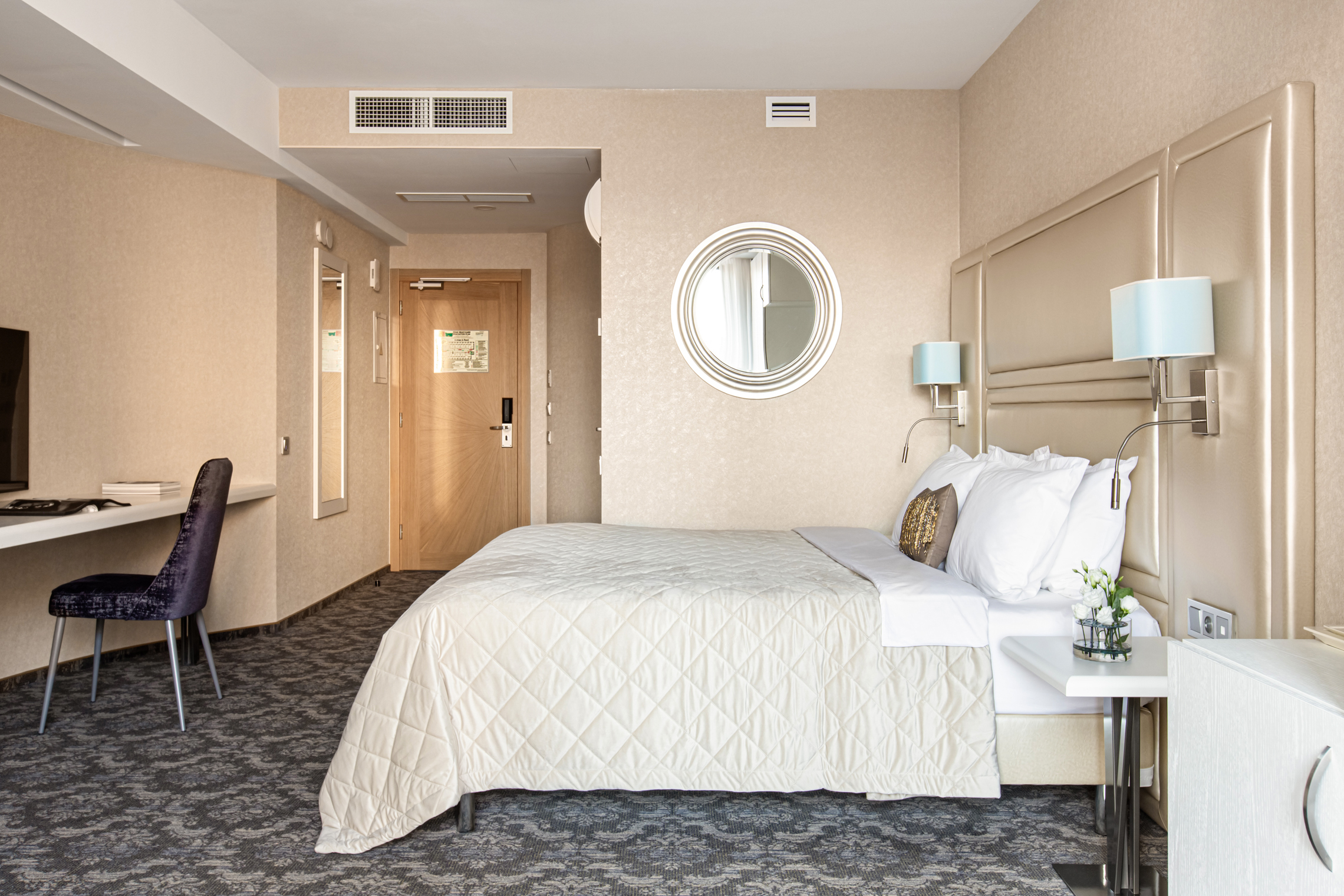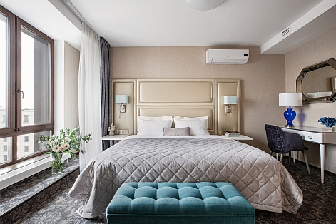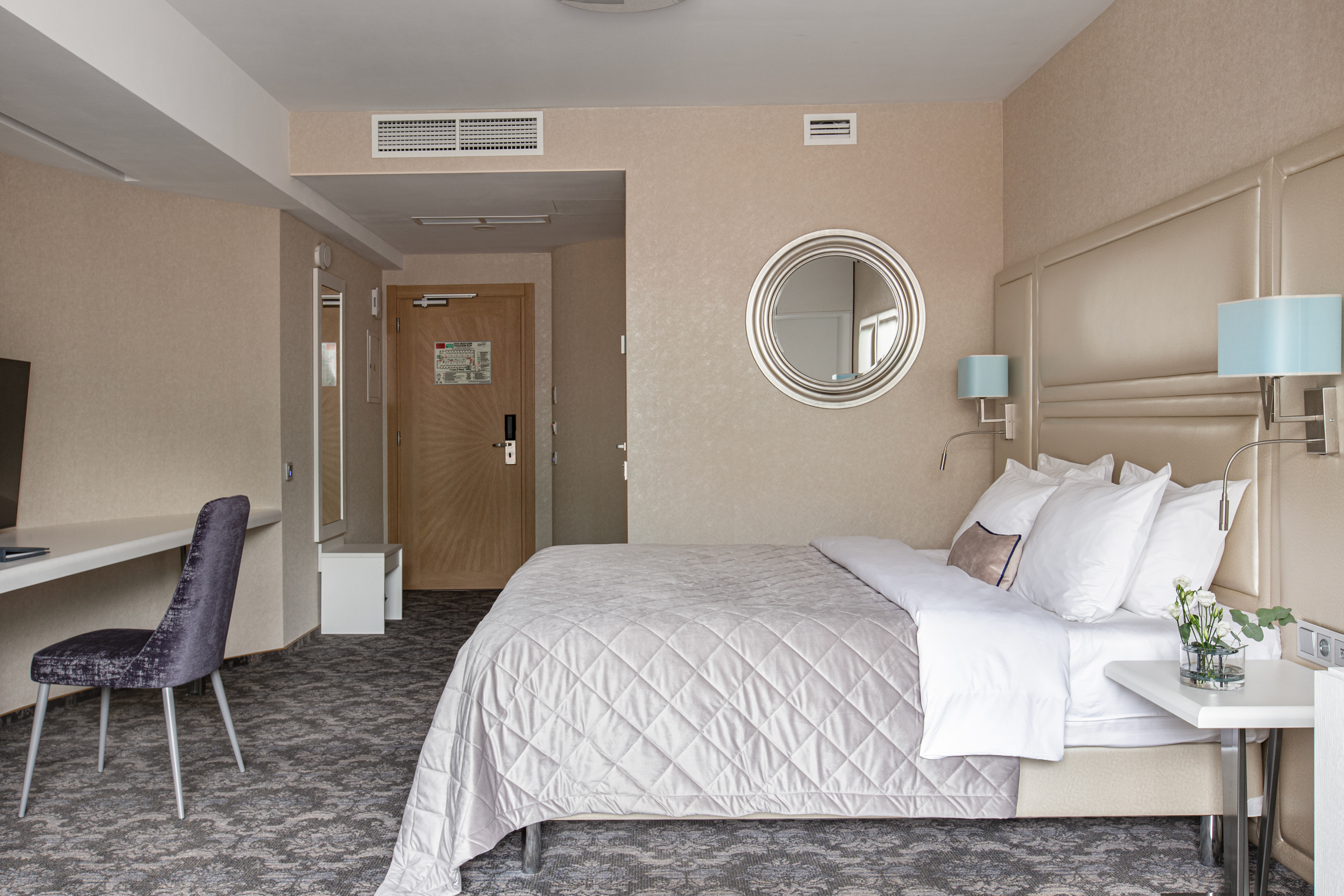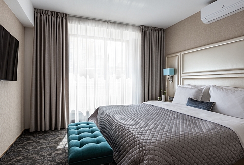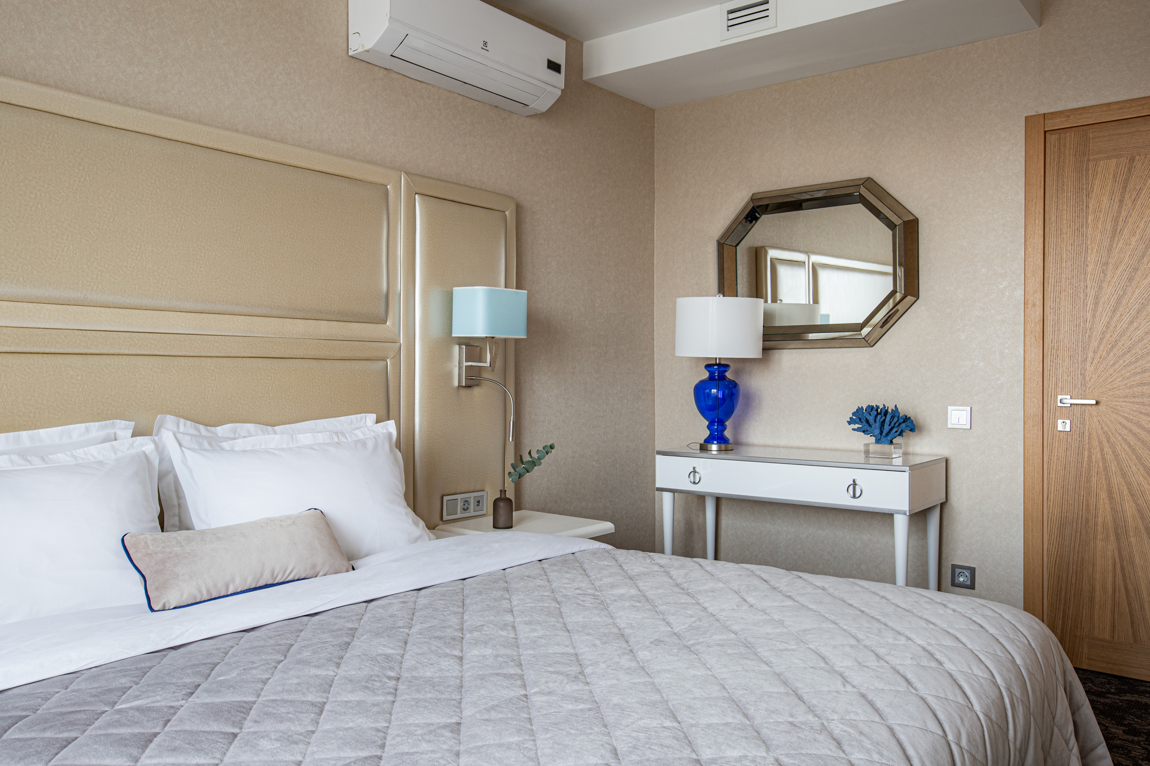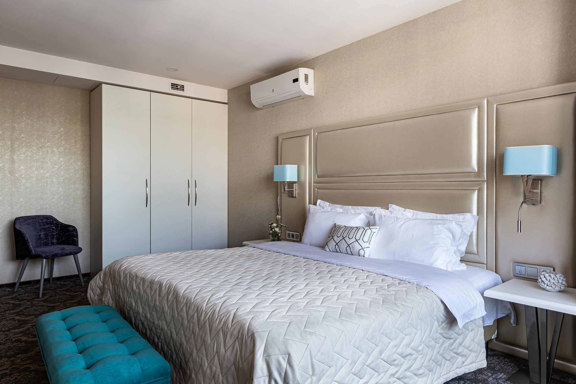 В номере: вешалка, диван, зеркало, кровать двуспальная, прикроватные тумбочки, стол, стулья, шкаф, кондиционер, мини-холодильник, сейф, телевизор, телефон, чайный набор посуды, электрочайник