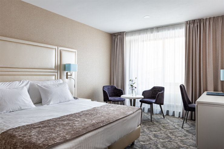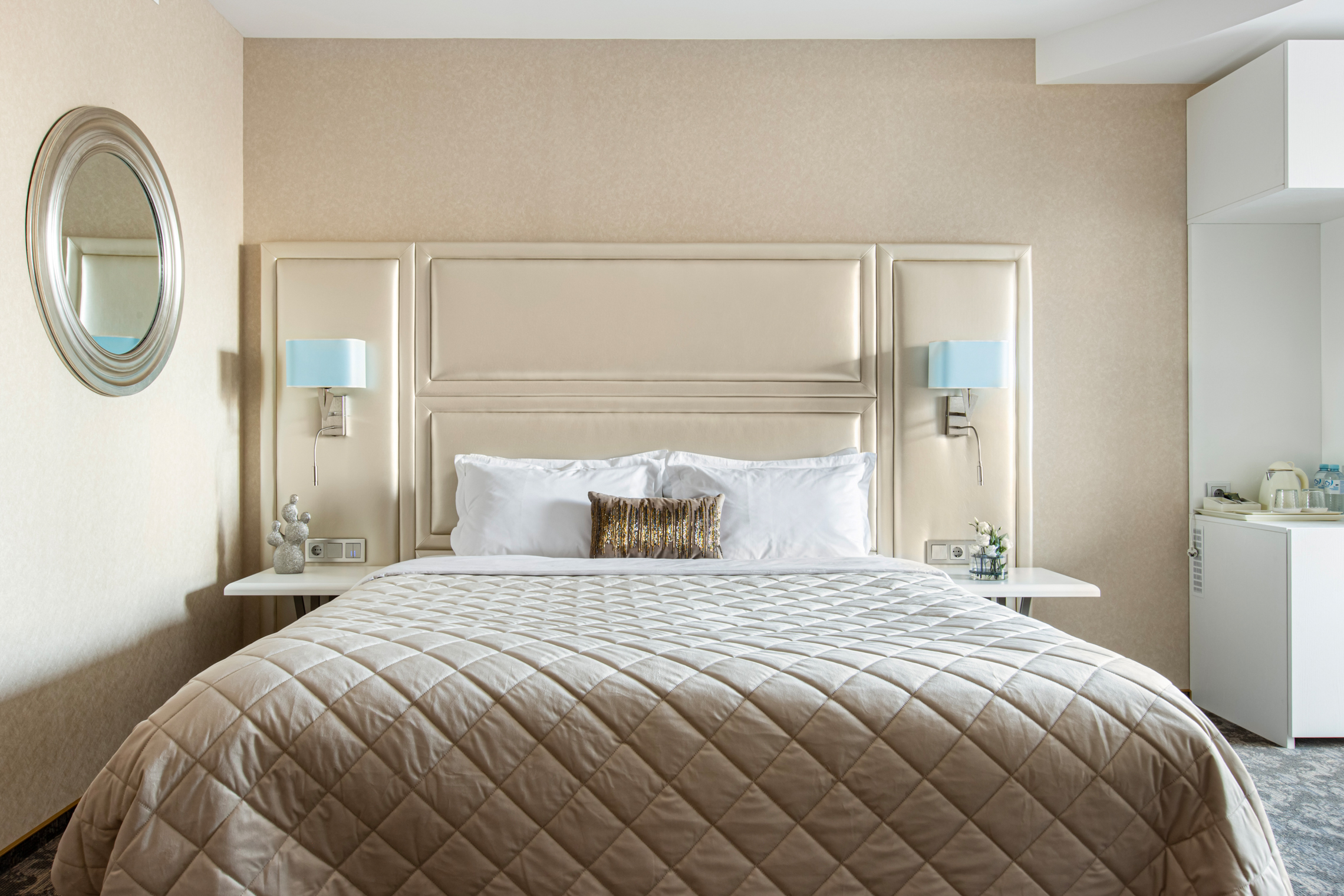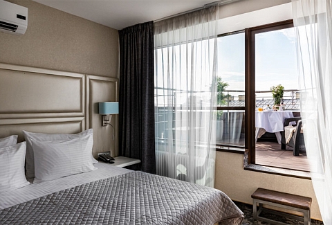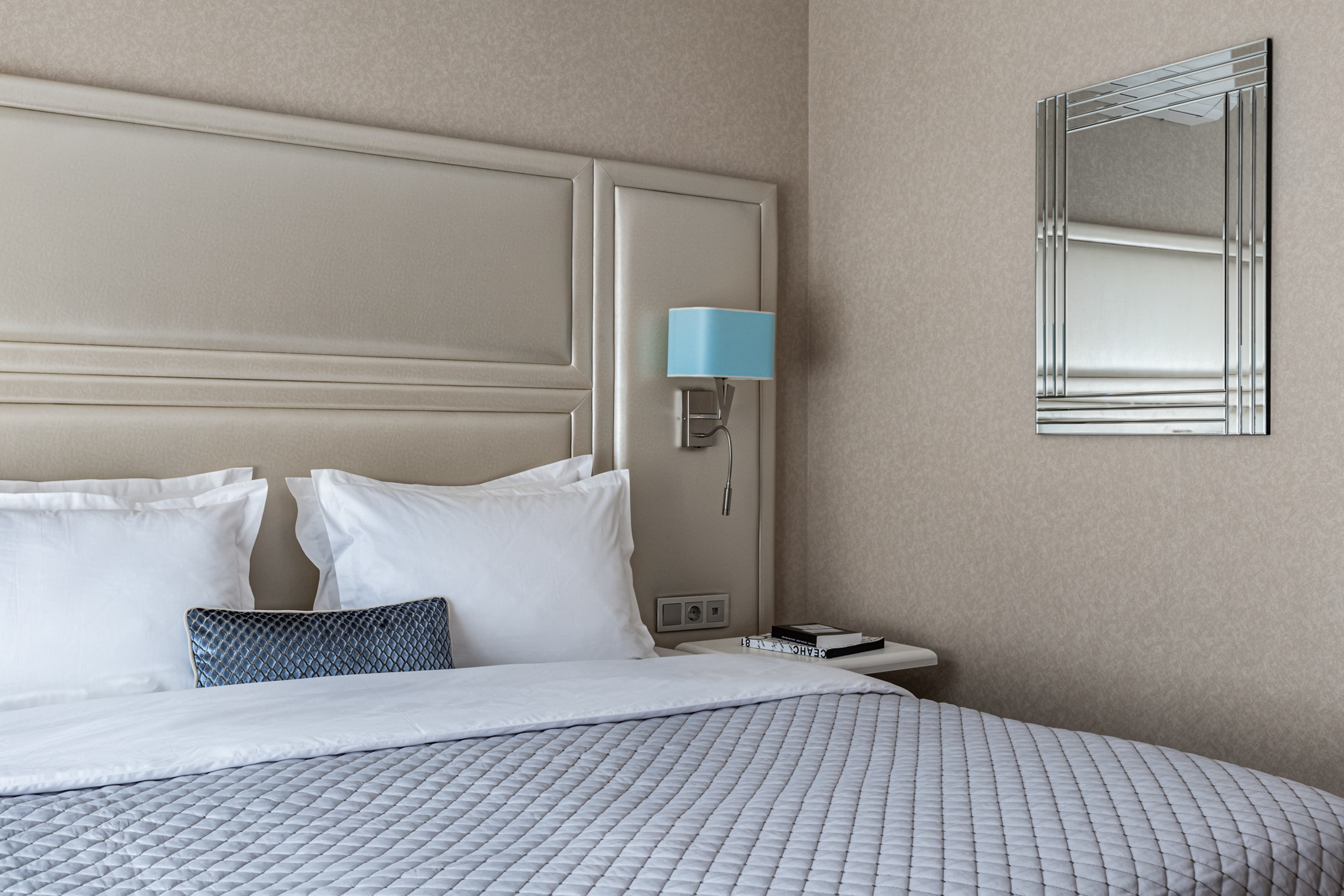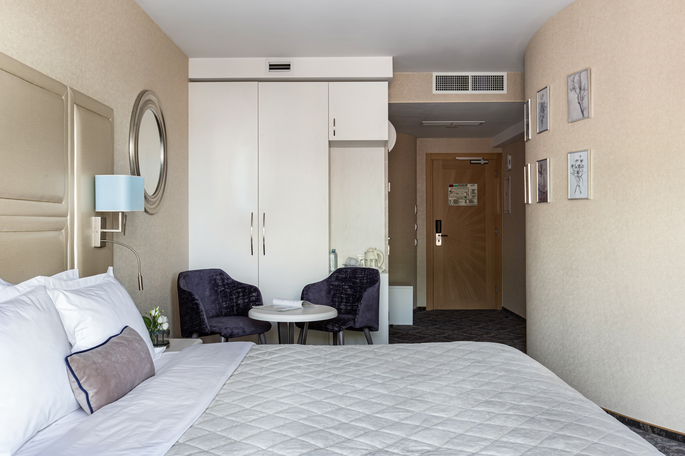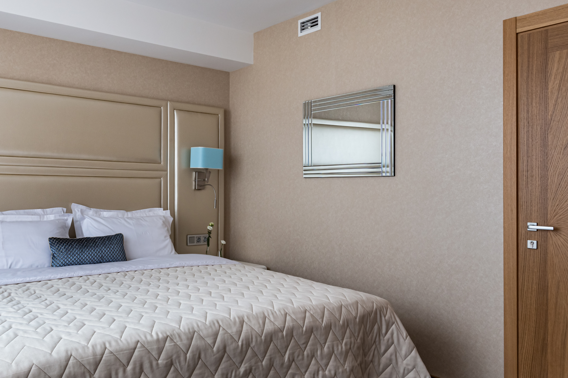 В номере: вешалка, диван, зеркало, кровать двуспальная, прикроватные тумбочки, стол, стулья, шкаф, кондиционер, мини-холодильник, сейф, телевизор, телефон, чайный набор посуды, электрочайник