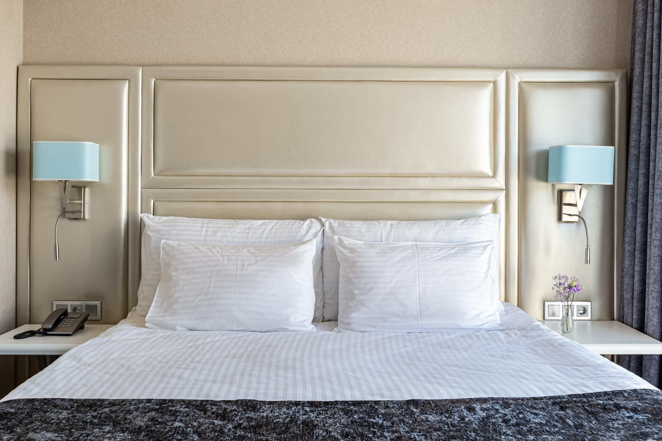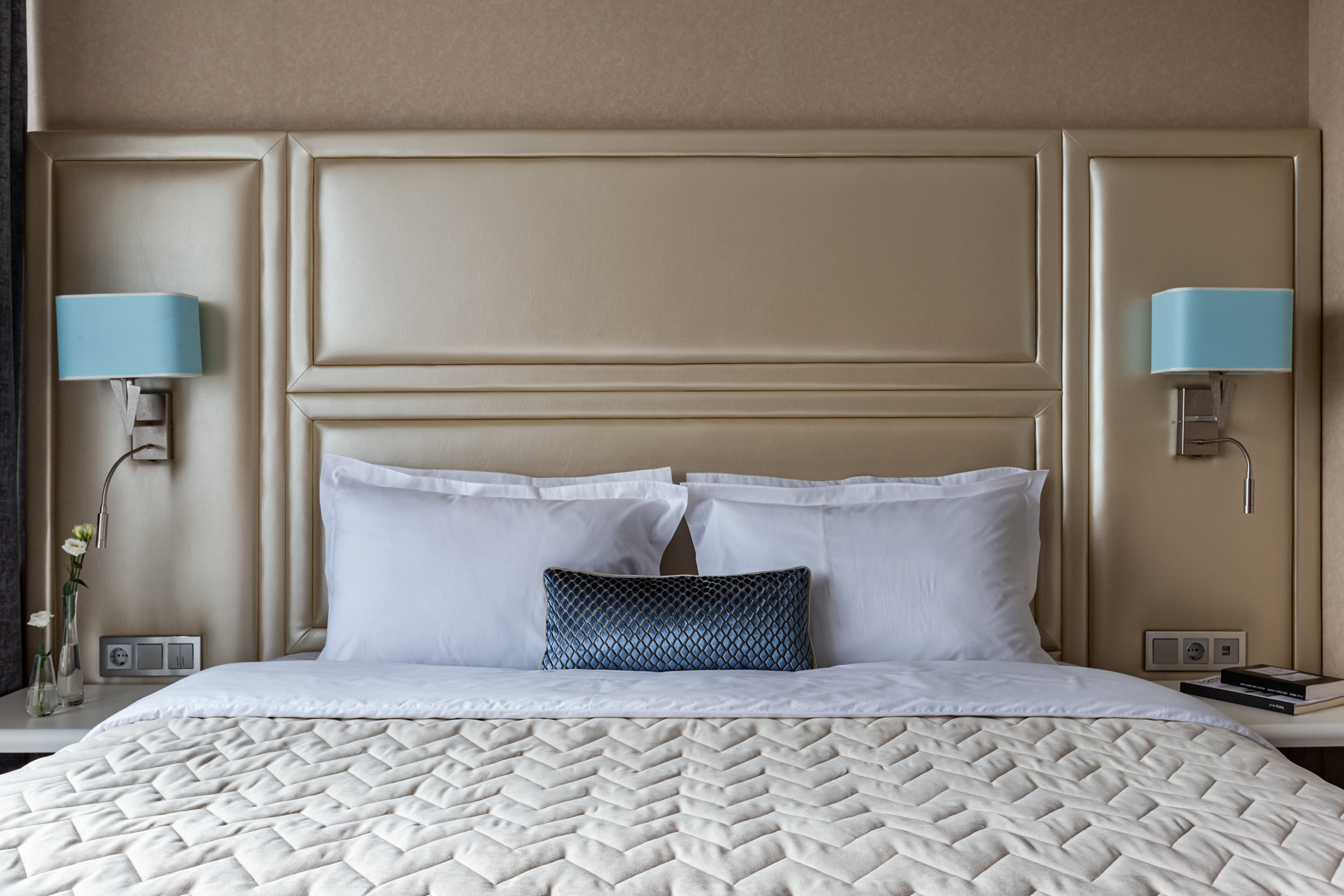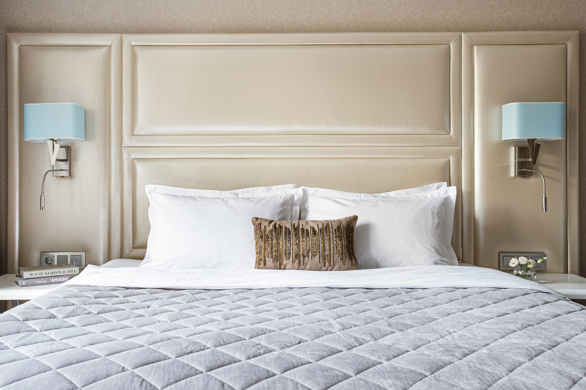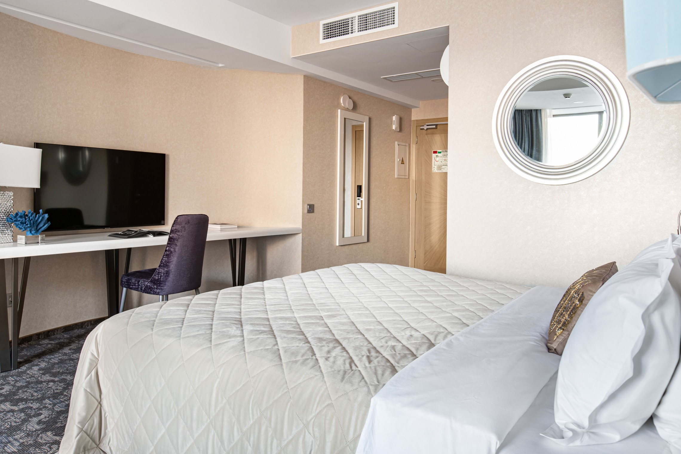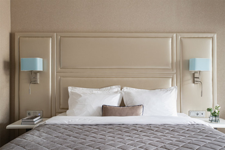 В номере: вешалка, диван, зеркало, кровать двуспальная, прикроватные тумбочки, стол, стулья, шкаф, кондиционер, мини-холодильник, сейф, телевизор, телефон, чайный набор посуды, электрочайник