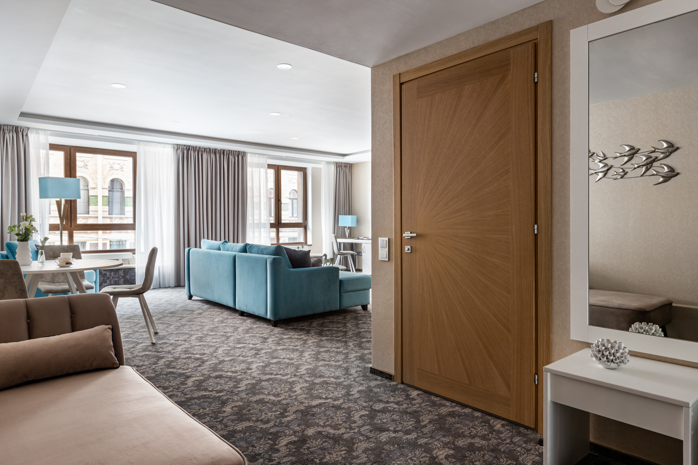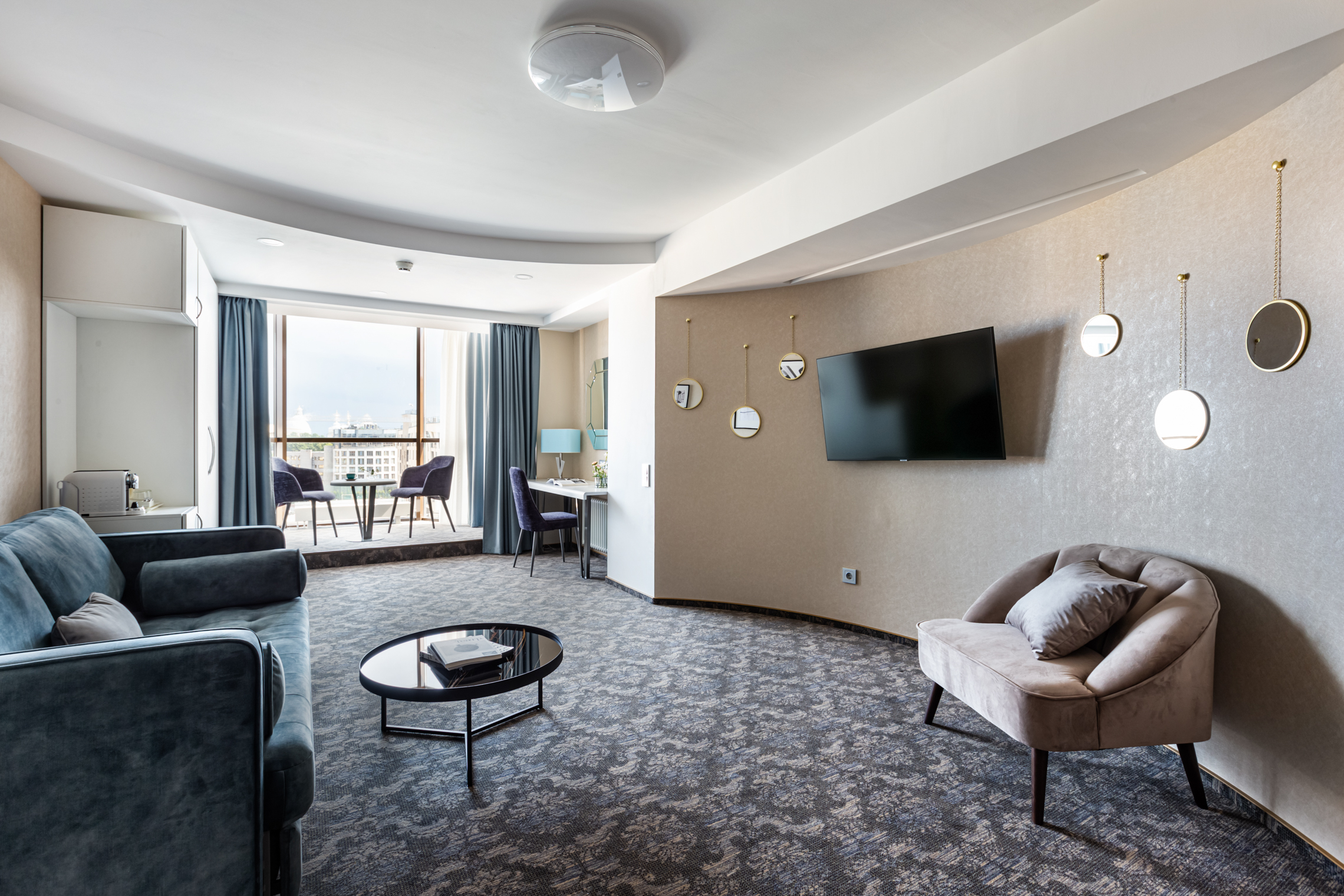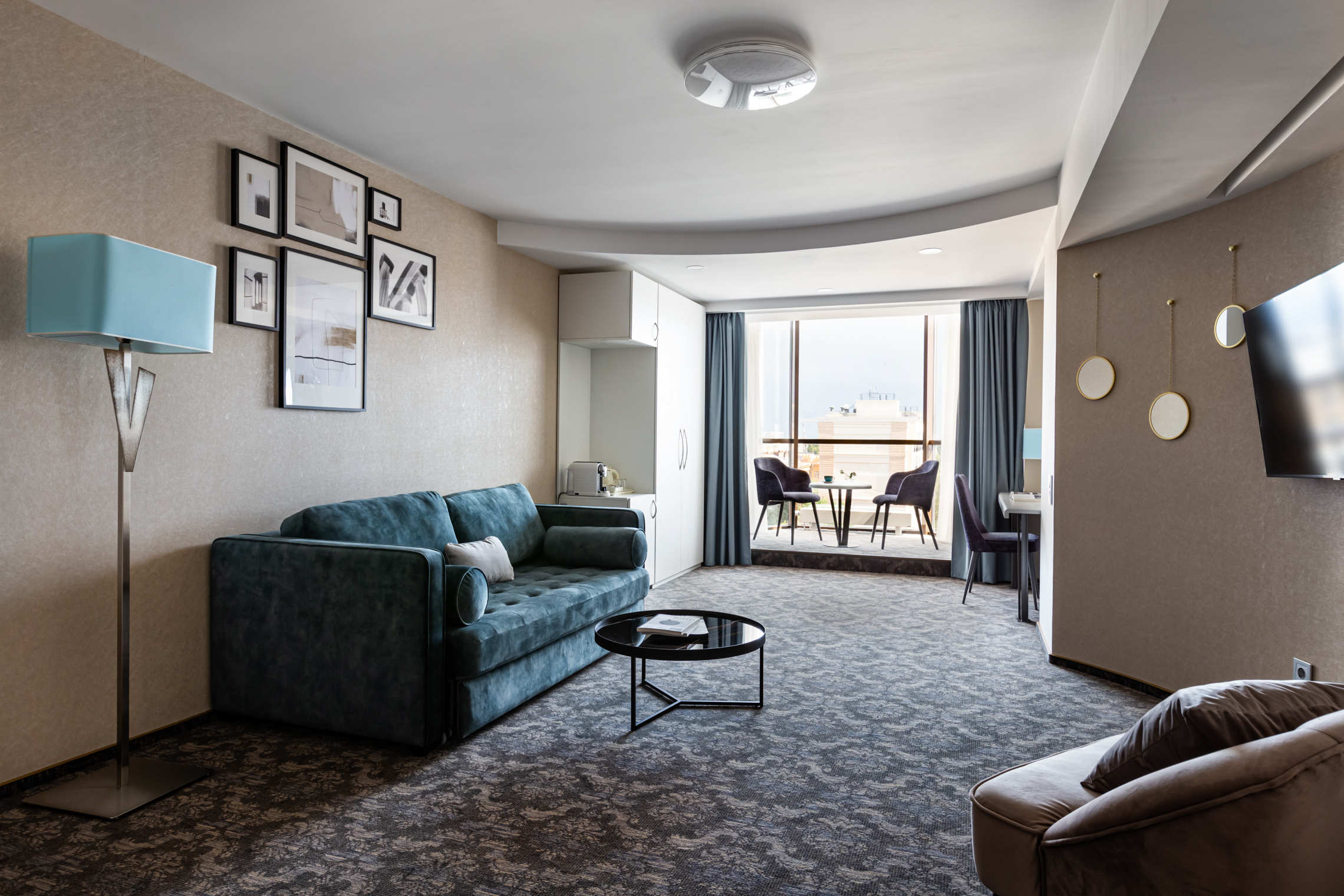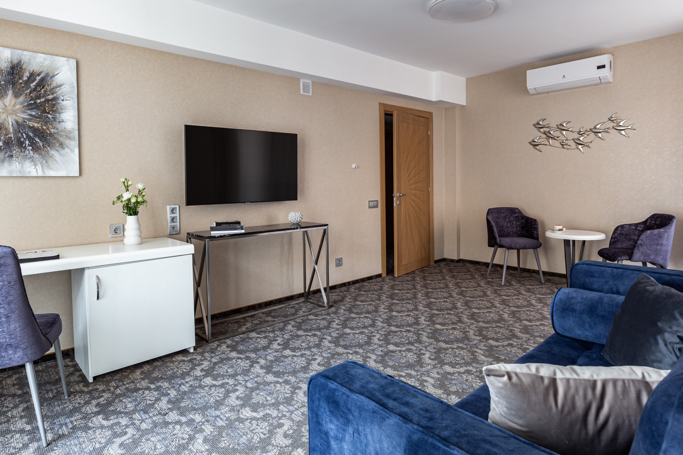 В номере: вешалка, диван раскладной, зеркало, кресла, кровать двуспальная, прикроватные тумбочки, стол, столик журнальный, стулья, шкаф, кондиционер, кофемашина, мини-холодильник, сейф, телевизор, телефон, чайная станция, чайный набор посуды, электрочайник