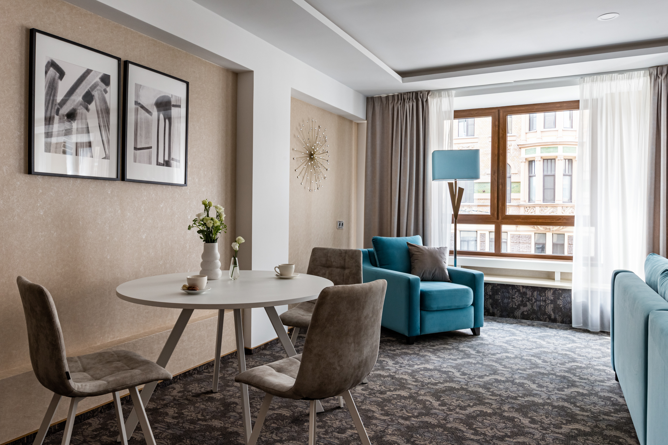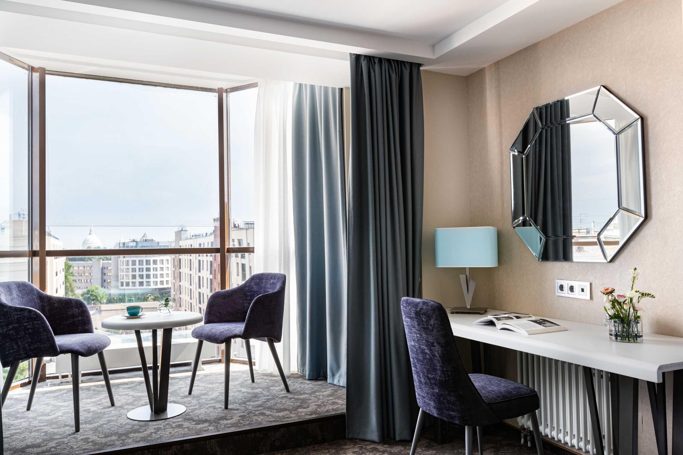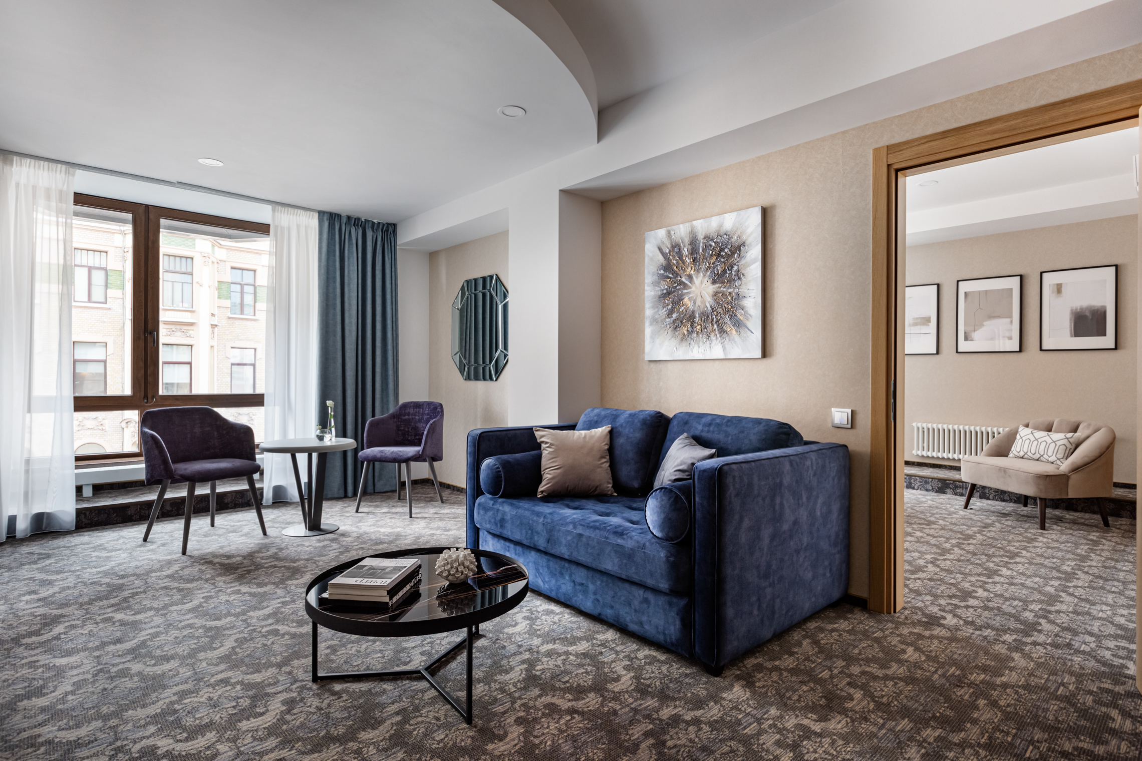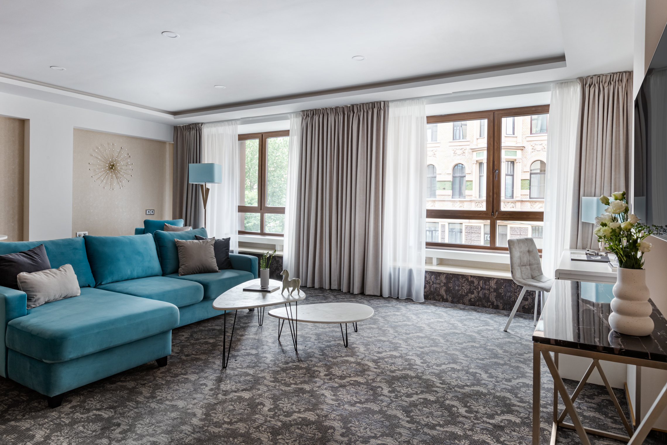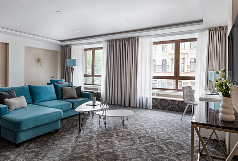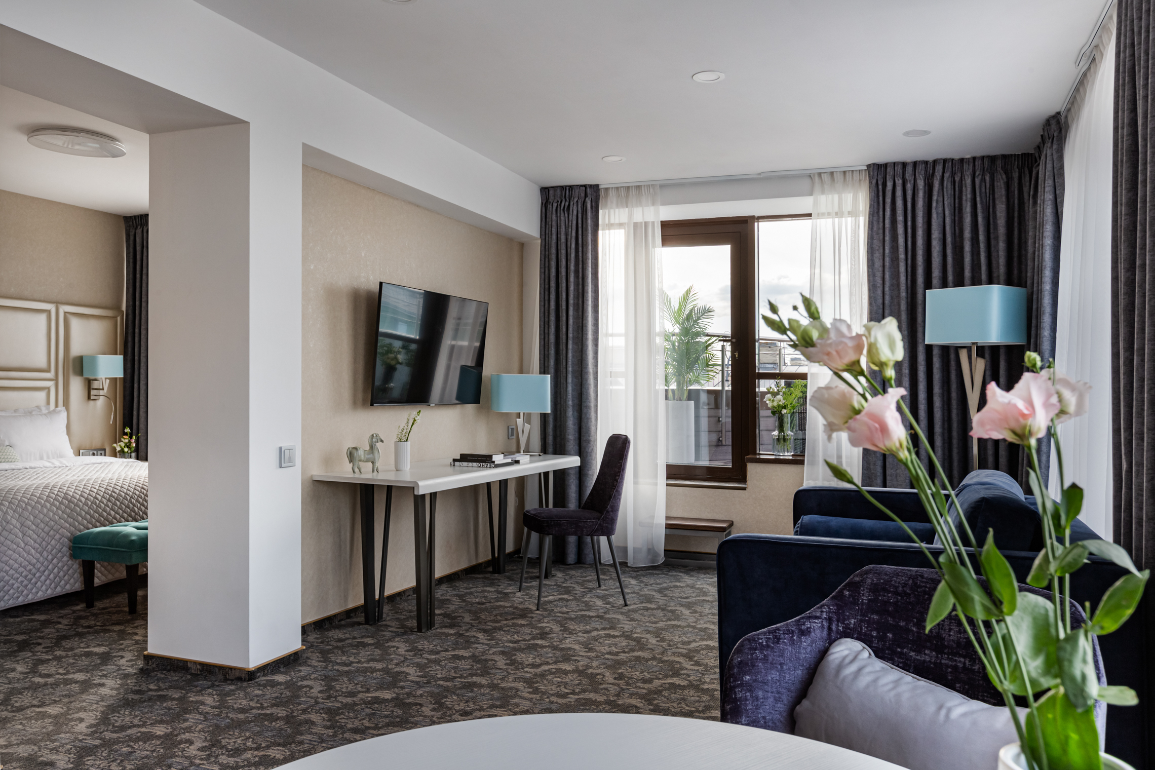 В номере: вешалка, диван раскладной, зеркало, кресла, кровать двуспальная, прикроватные тумбочки, стол, столик журнальный, стулья, шкаф, кондиционер, кофемашина, мини-холодильник, сейф, телевизор, телефон, чайная станция, чайный набор посуды, электрочайник