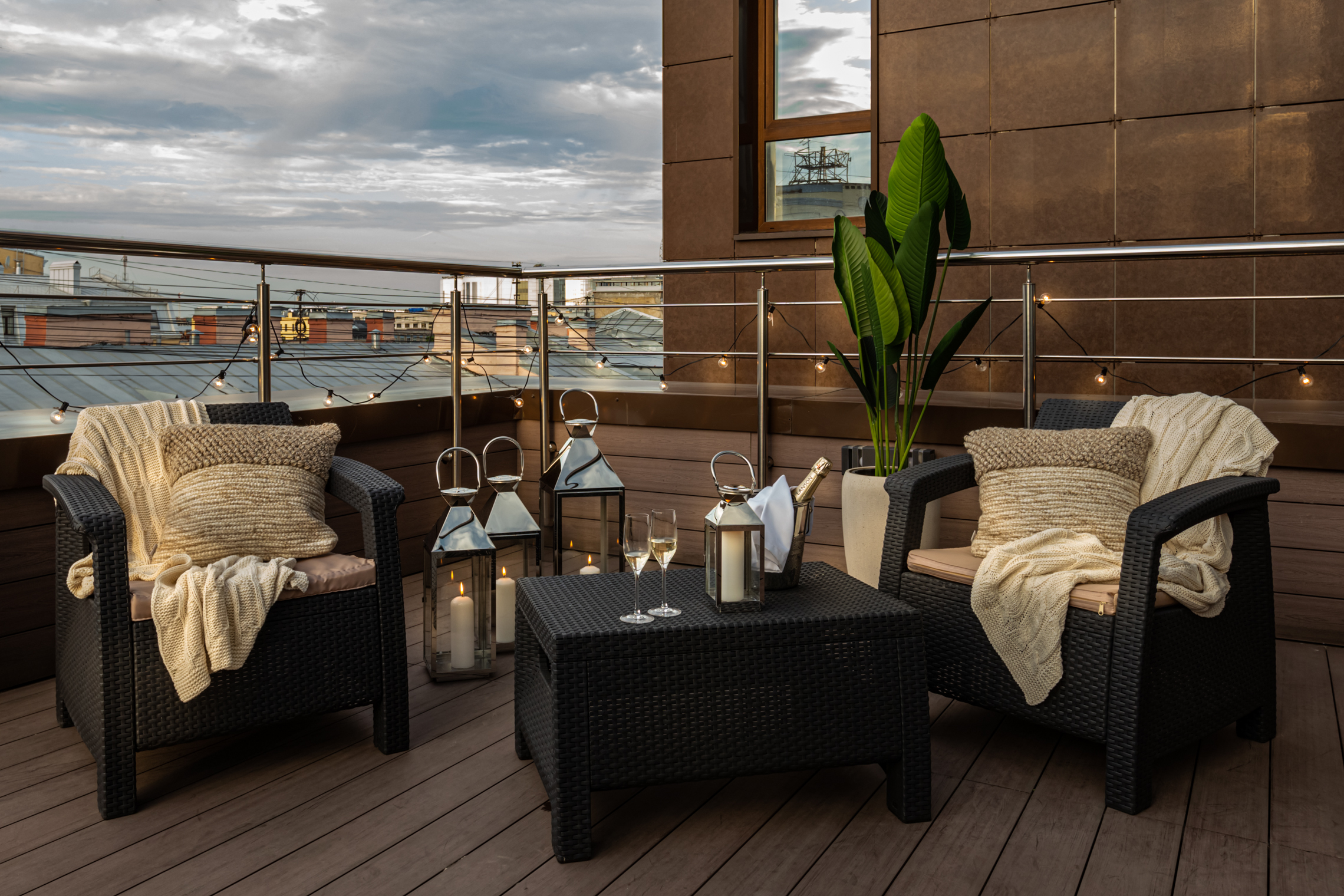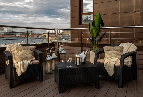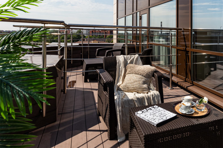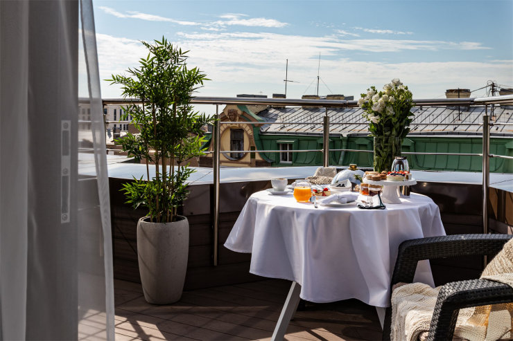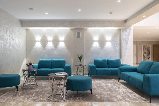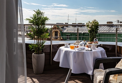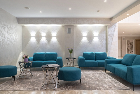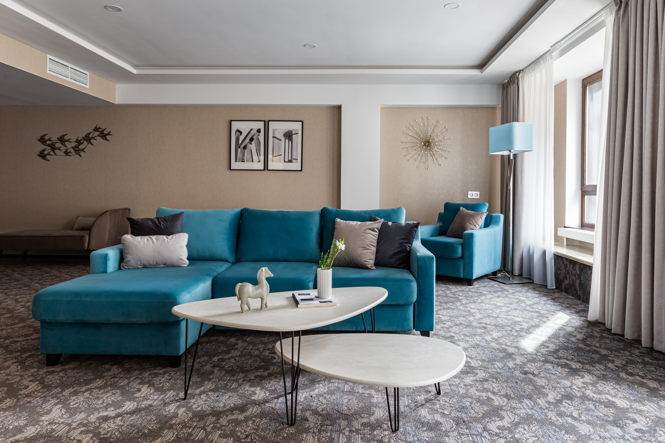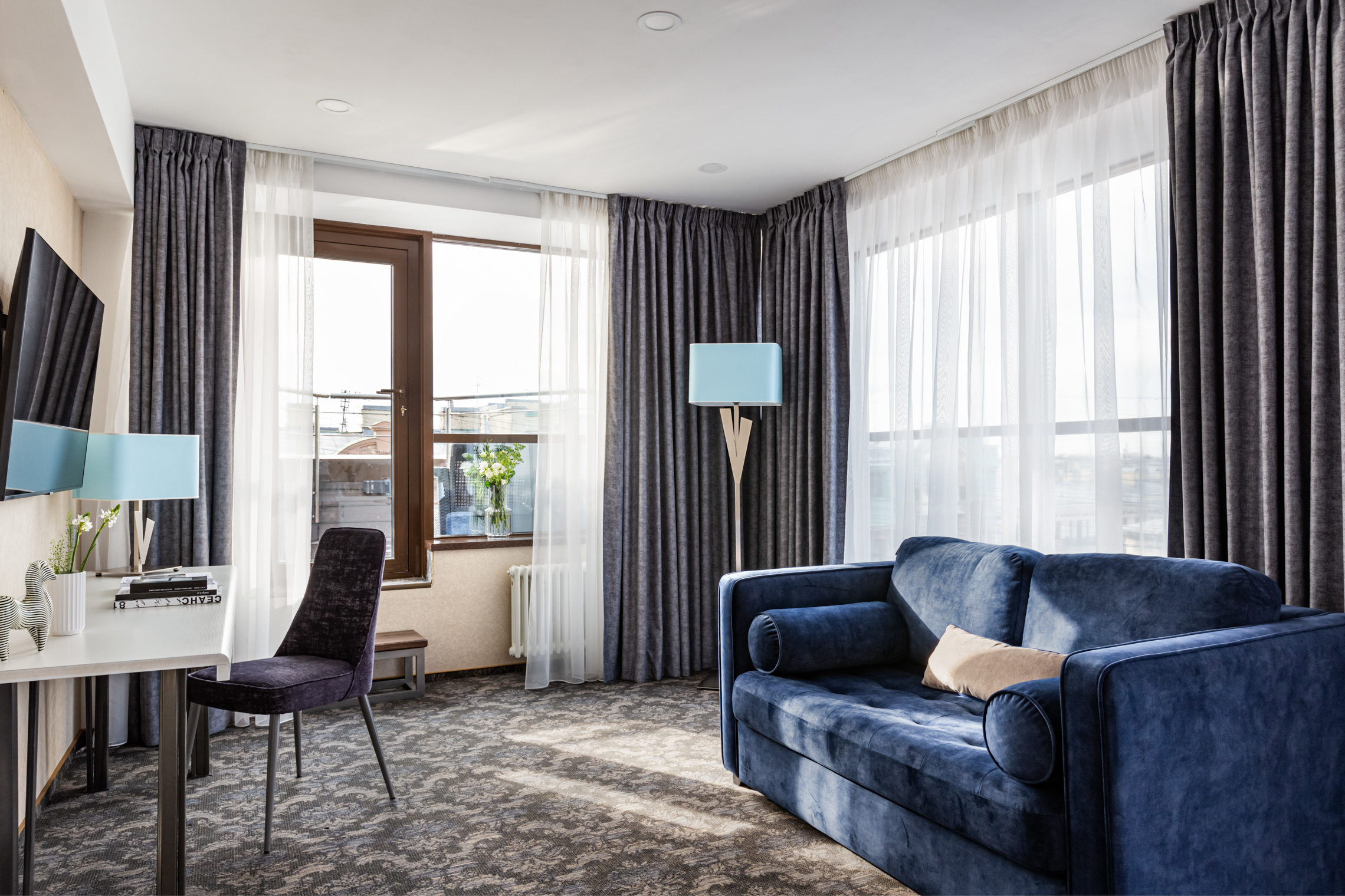 В номере: вешалка, диван раскладной, зеркало, кресла, кровать двуспальная, прикроватные тумбочки, стол, столик журнальный, стулья, шкаф, кондиционер, кофемашина, мини-холодильник, сейф, телевизор, телефон, чайная станция, чайный набор посуды, электрочайник