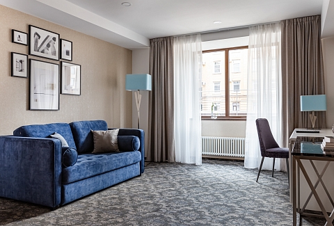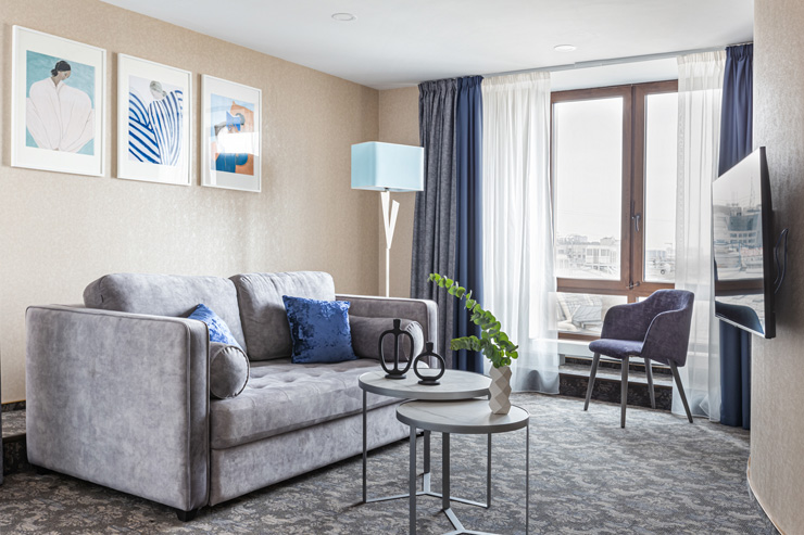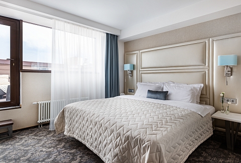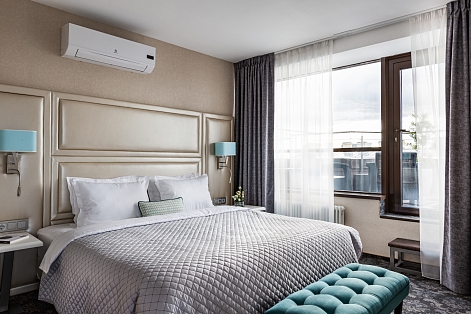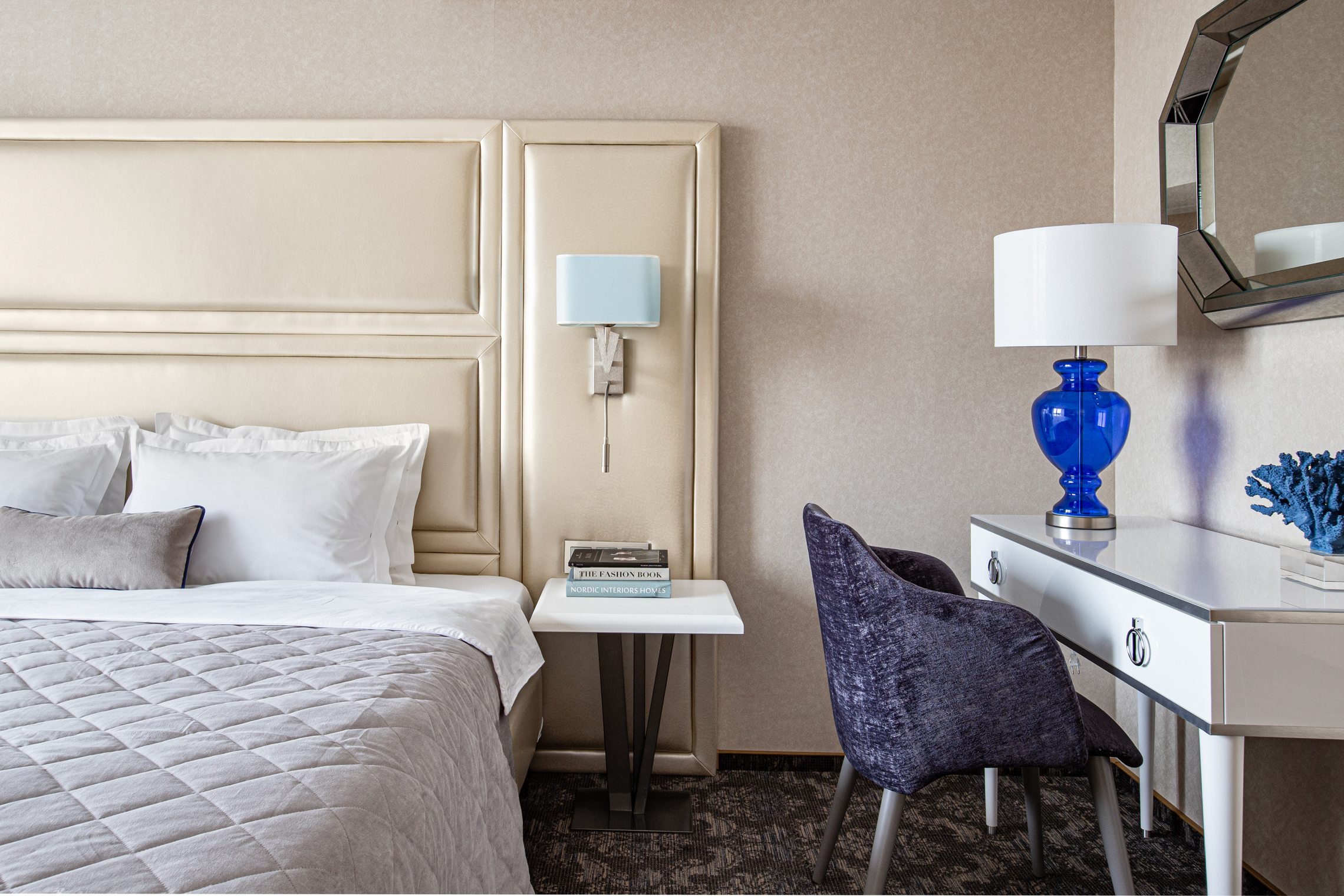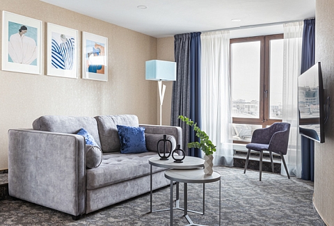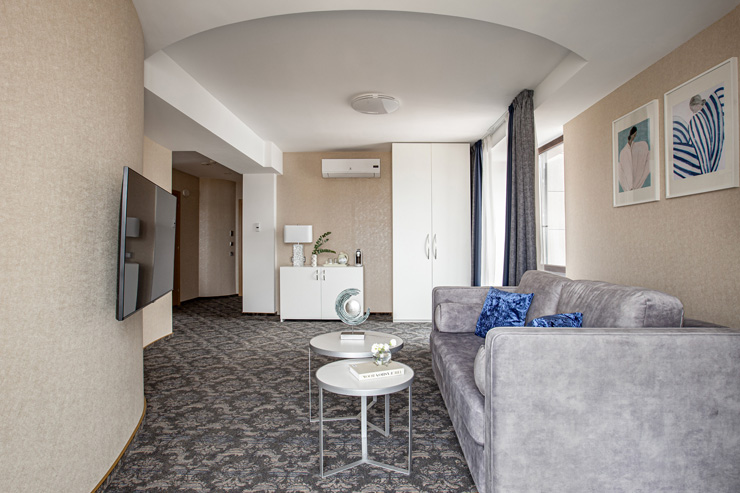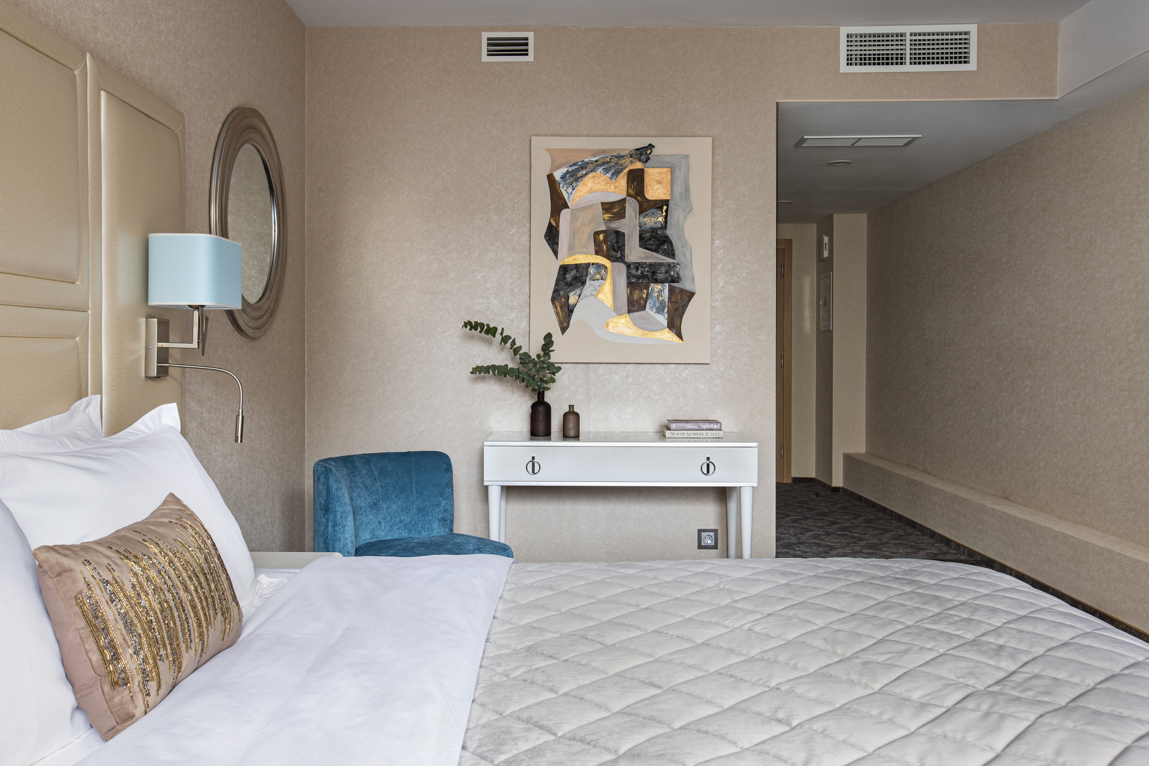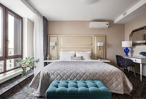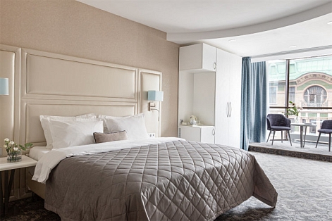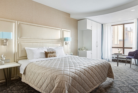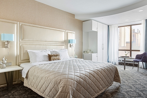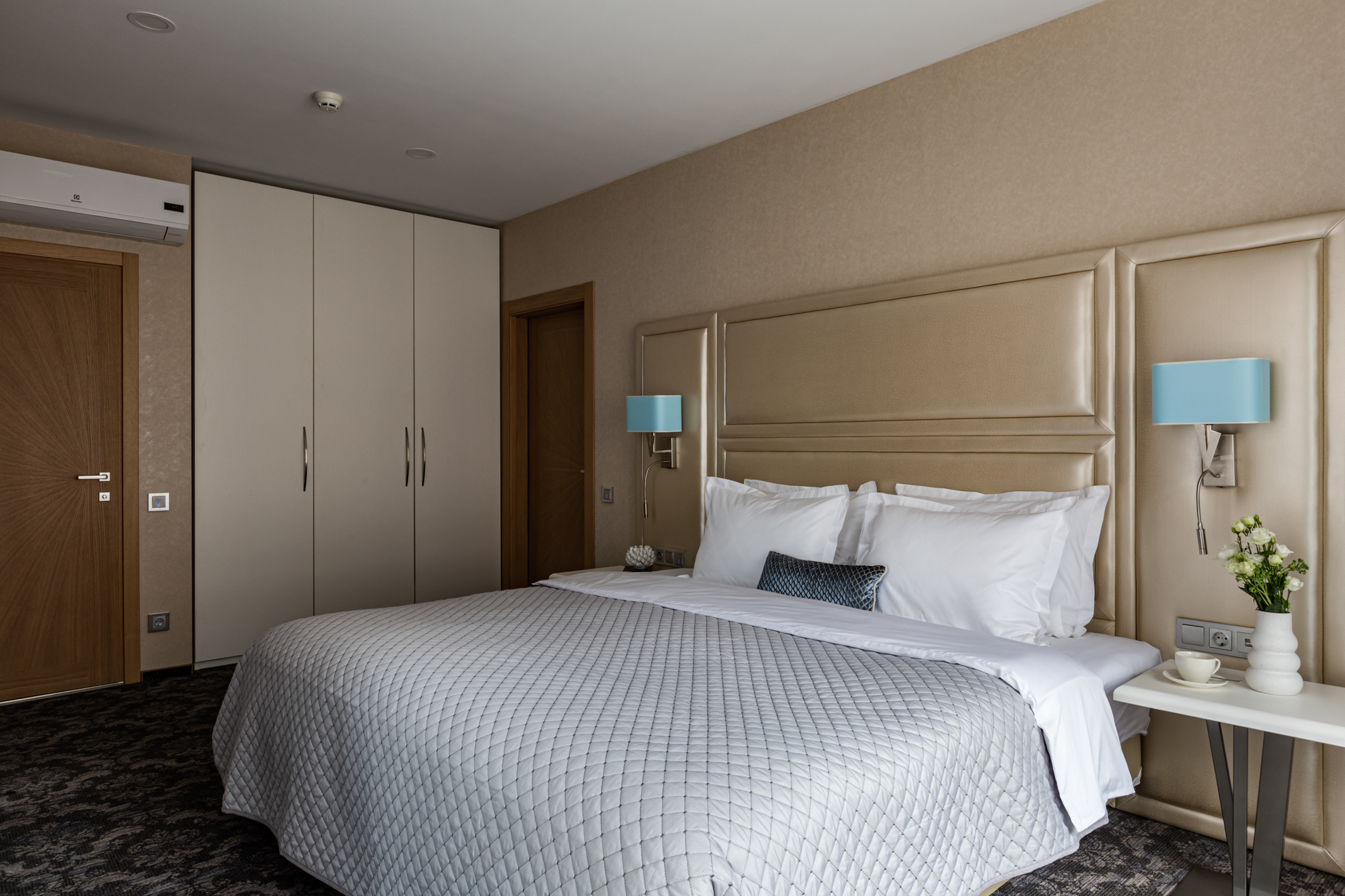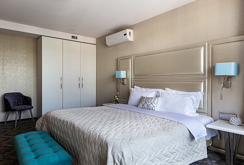 В номере: вешалка, диван, зеркало, кровать двуспальная, прикроватные тумбочки, стол, стулья, шкаф, кондиционер, кофемашина, мини-холодильник, сейф, телевизор, телефон, чайный набор посуды, электрочайник