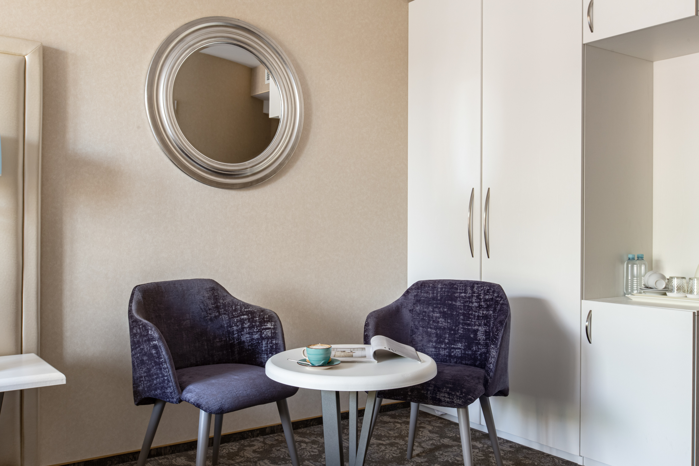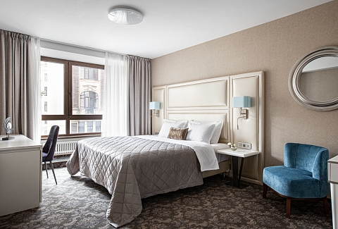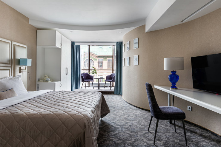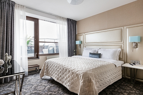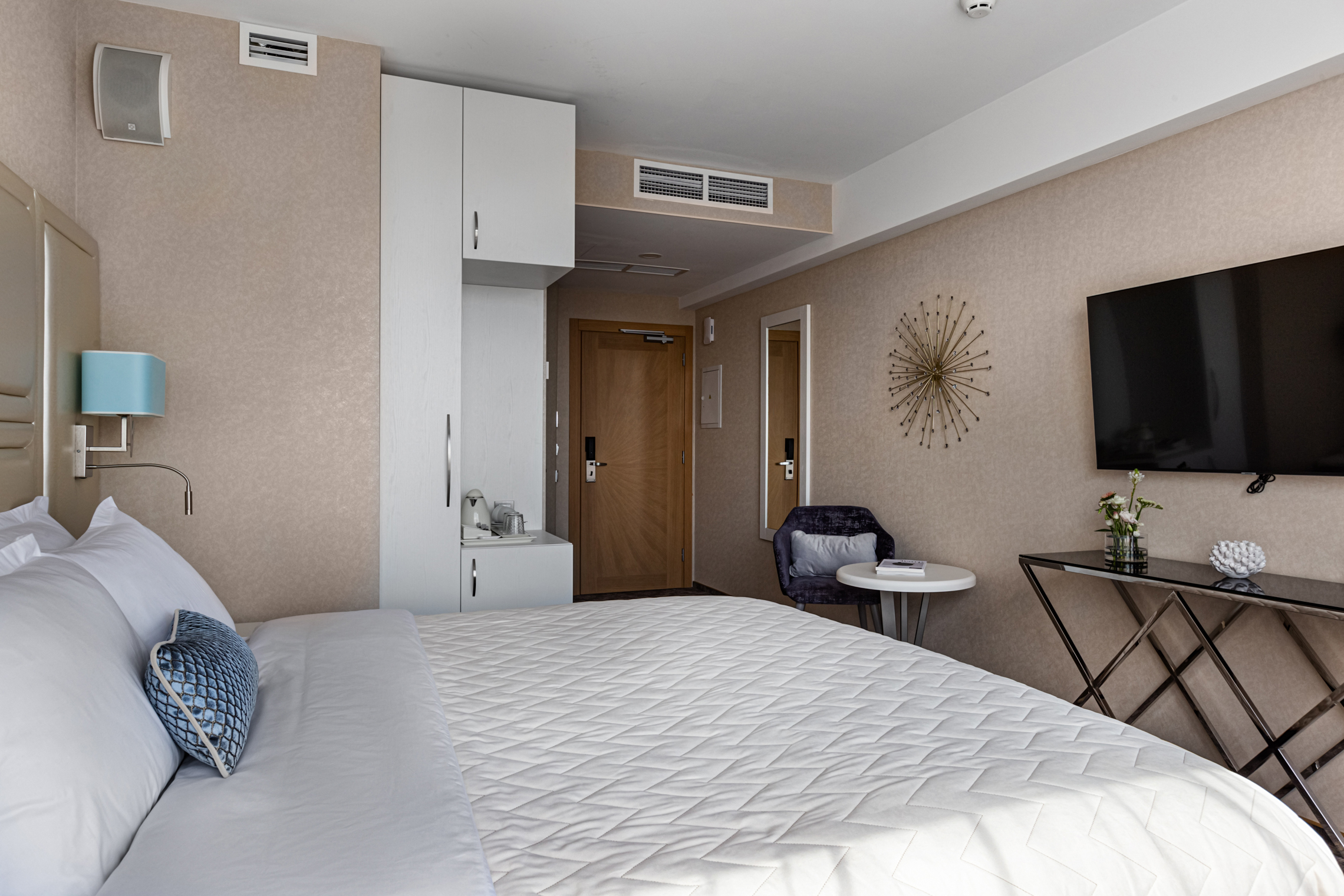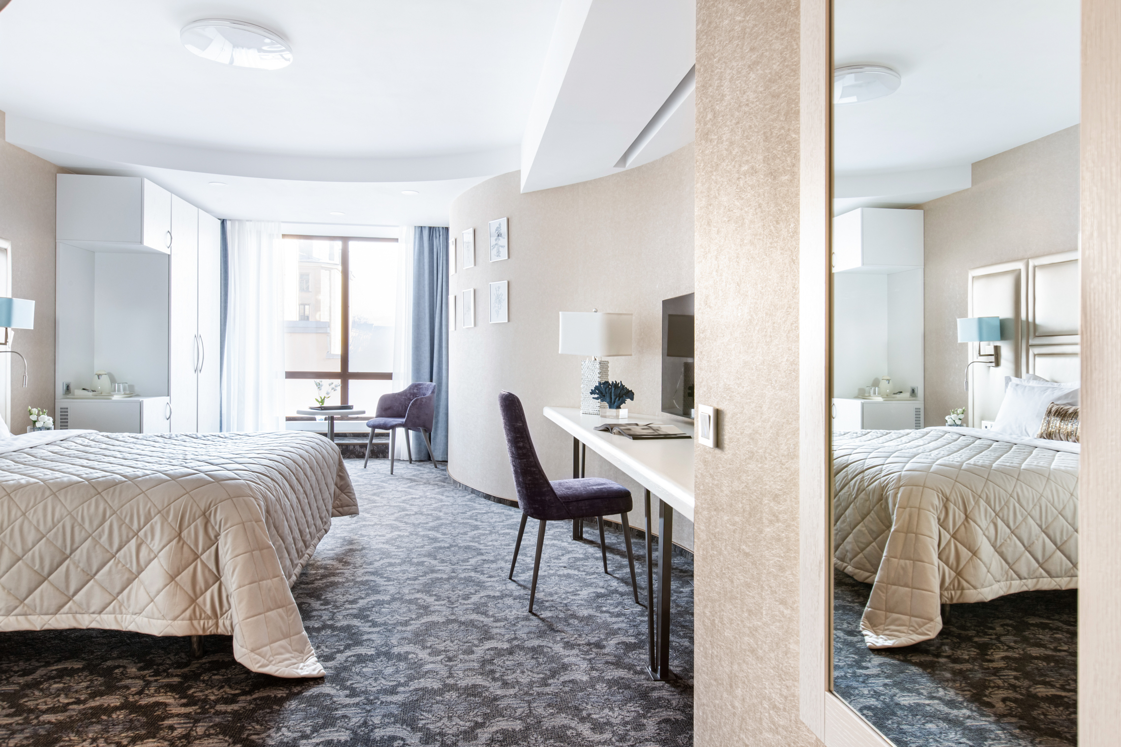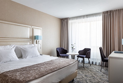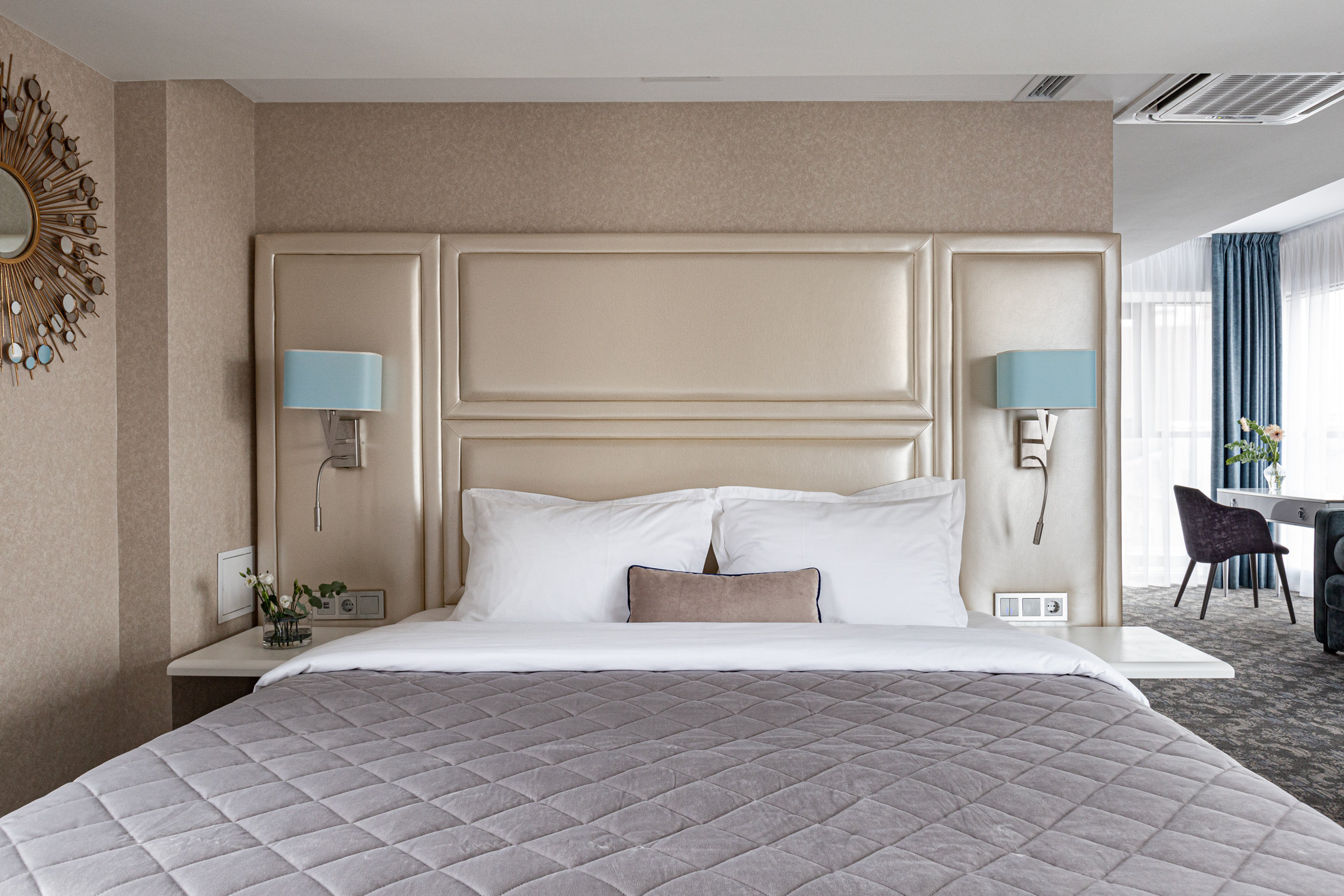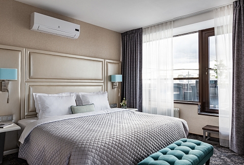В номере: вешалка, диван, зеркало, кровать двуспальная, прикроватные тумбочки, стол, стулья, шкаф, кондиционер, кофемашина, мини-холодильник, сейф, телевизор, телефон, чайный набор посуды, электрочайник