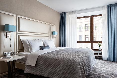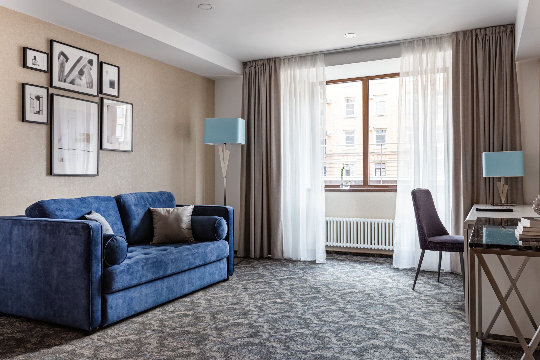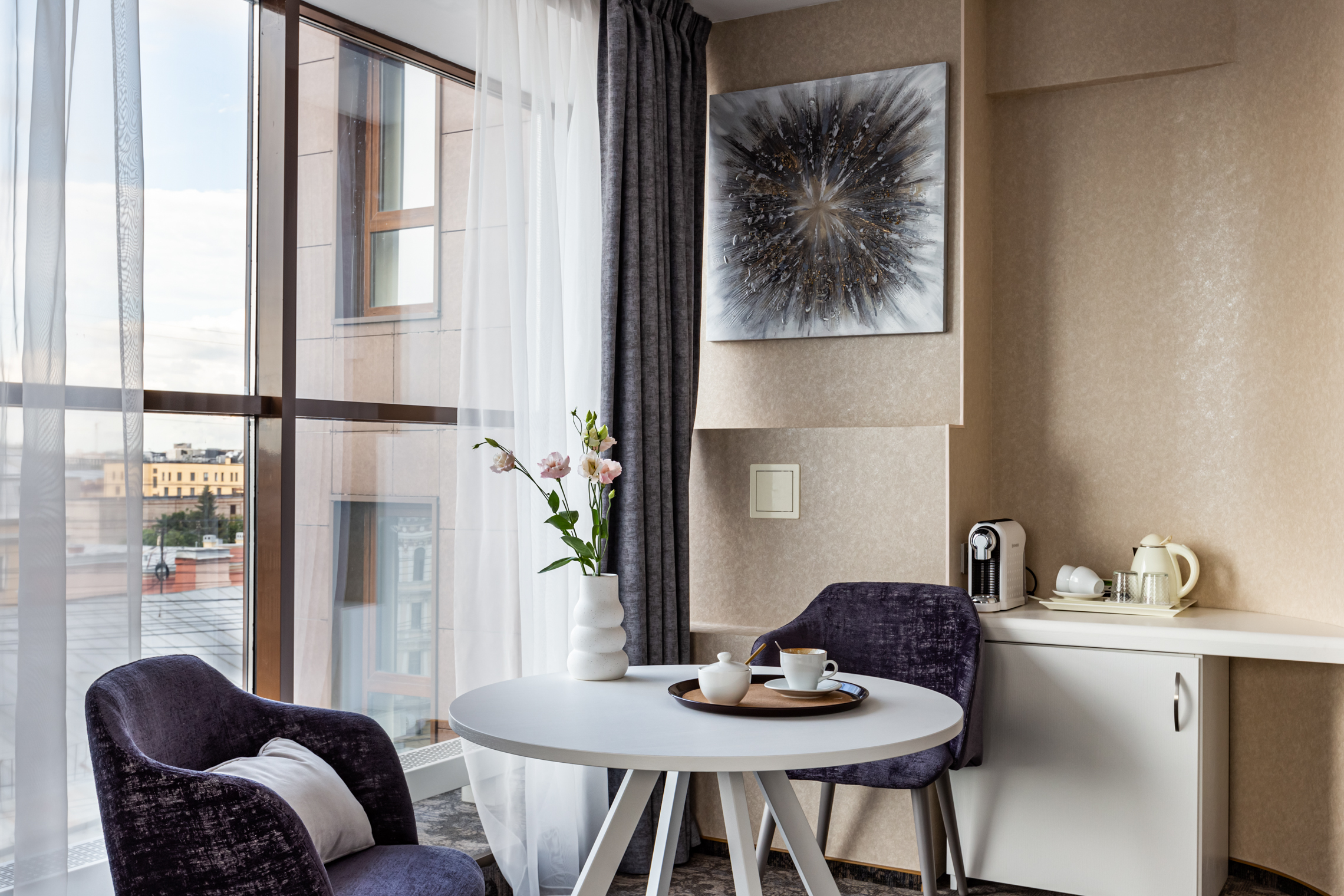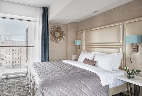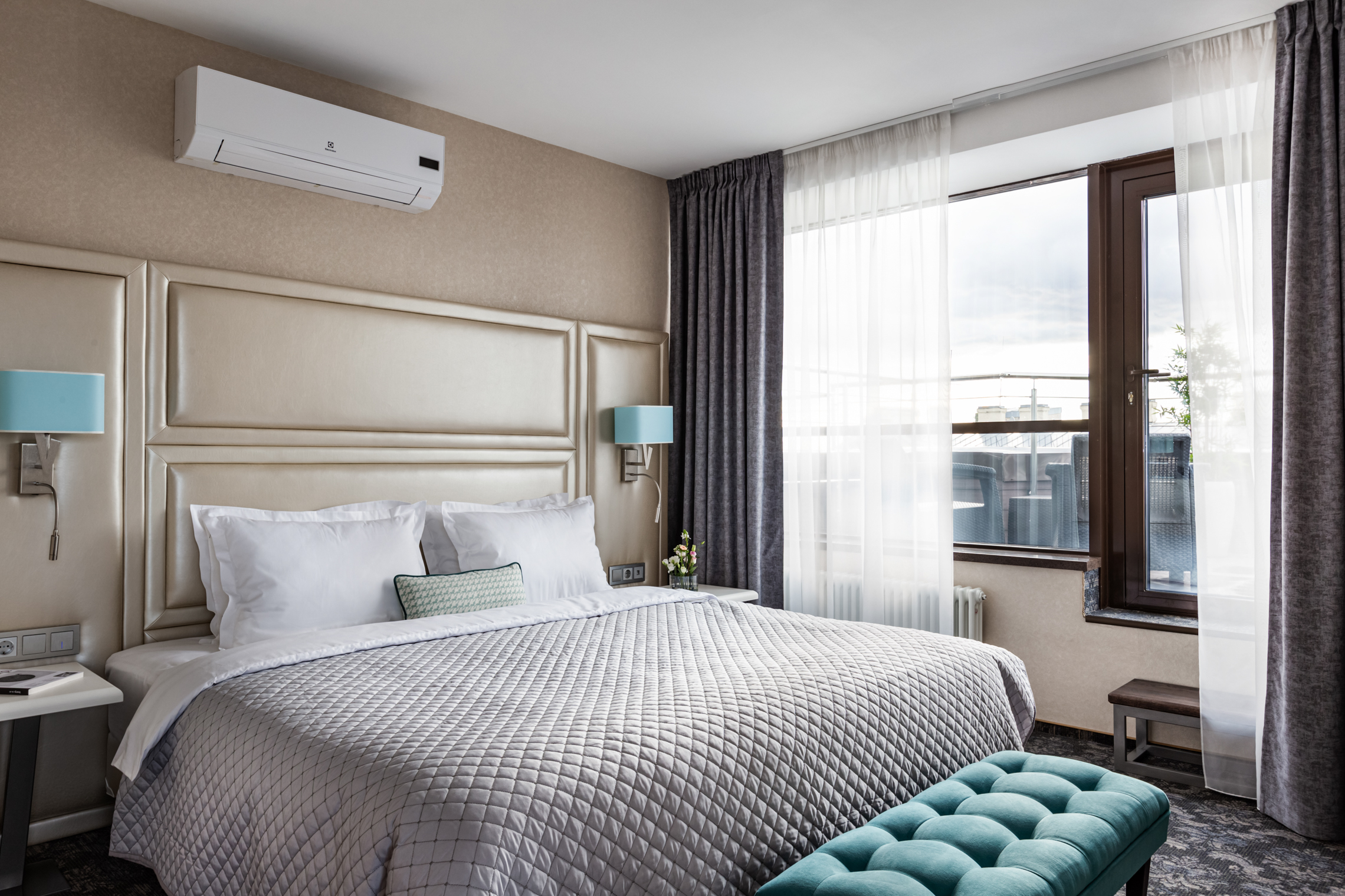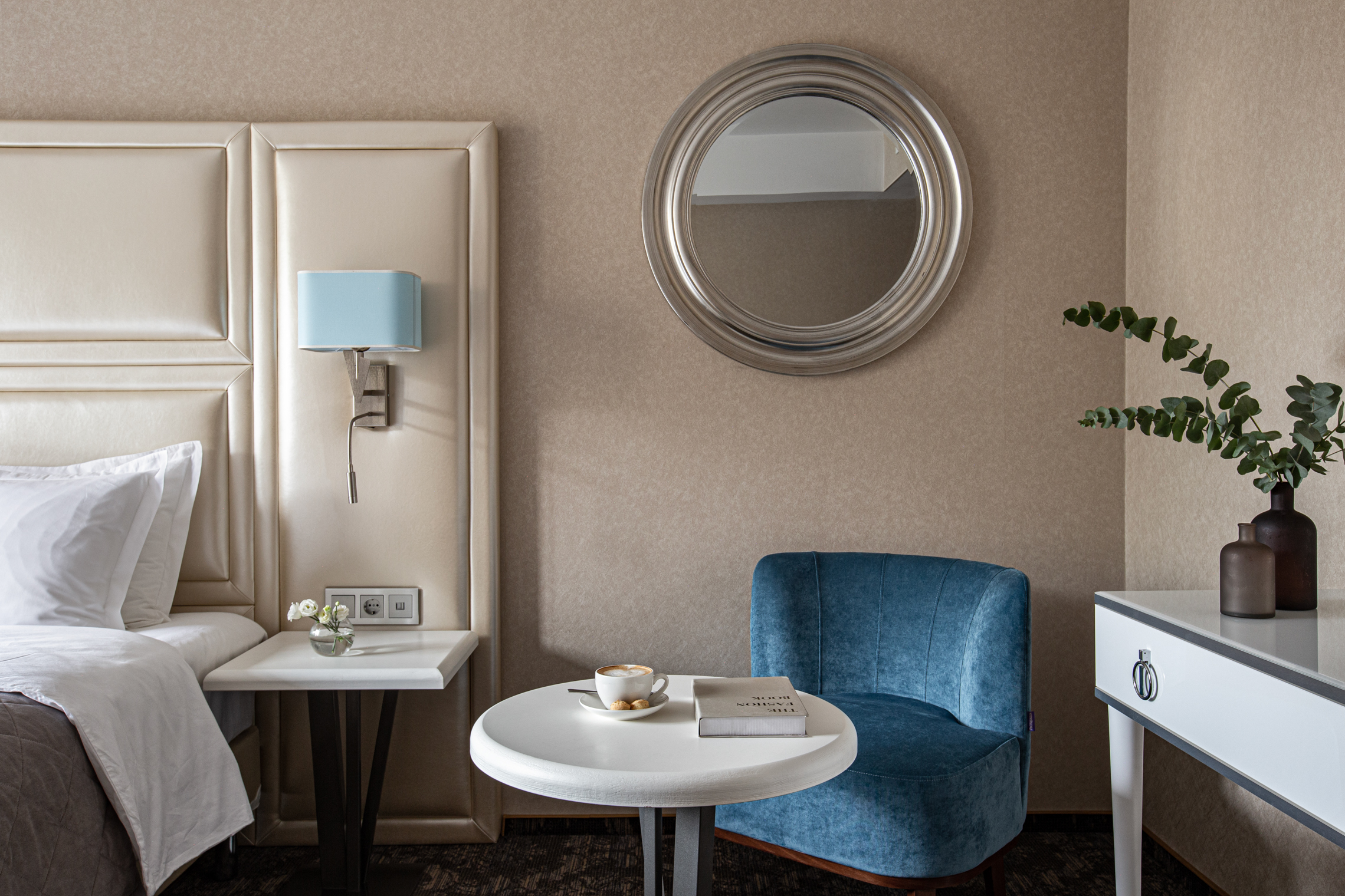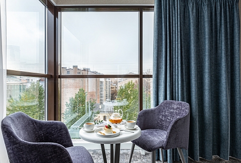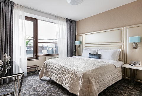 В номере: вешалка, диван, зеркало, кровать двуспальная, прикроватные тумбочки, стол, стулья, шкаф, кондиционер, кофемашина, мини-холодильник, сейф, телевизор, телефон, чайный набор посуды, электрочайник