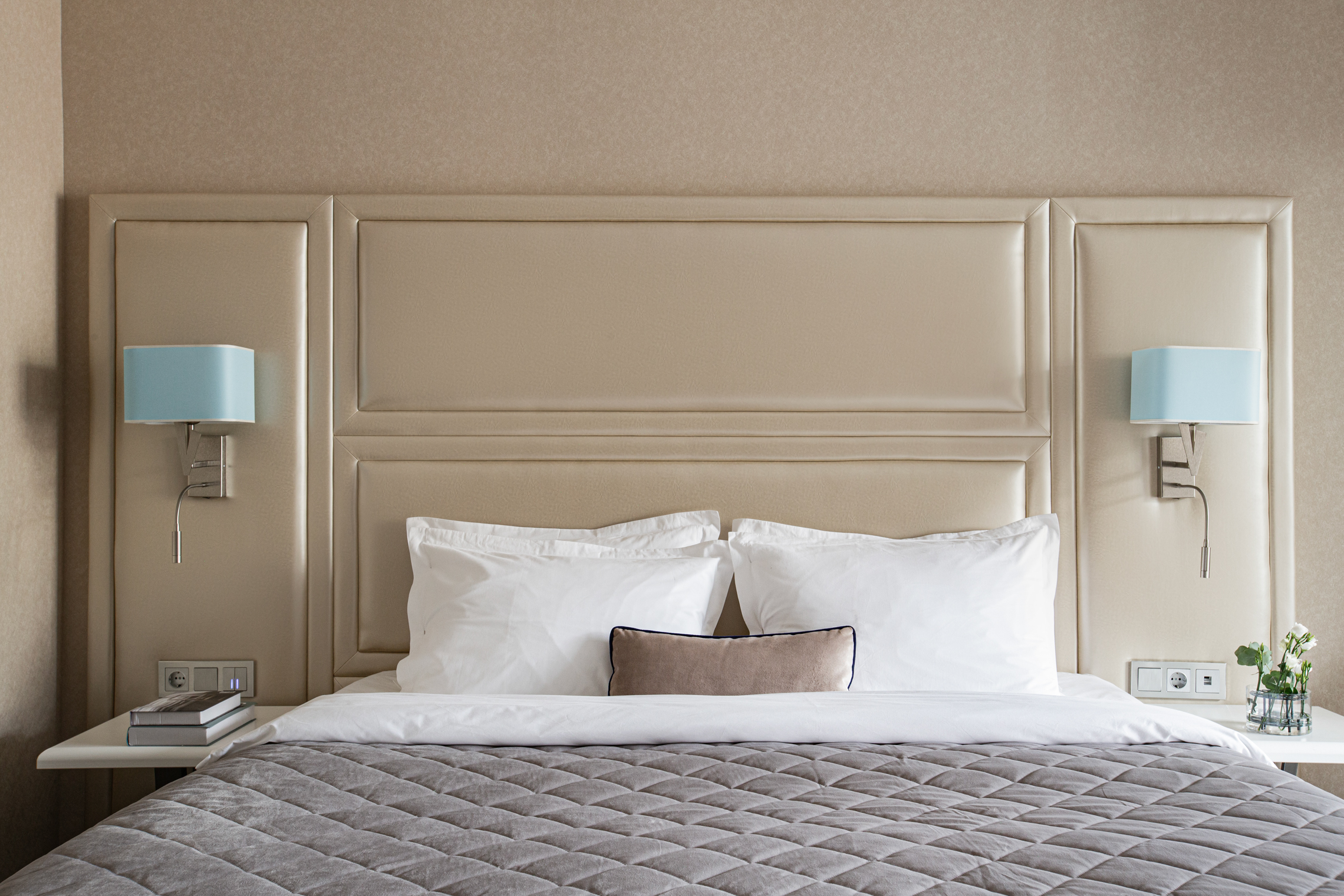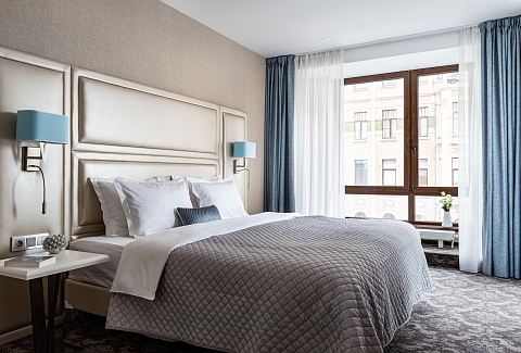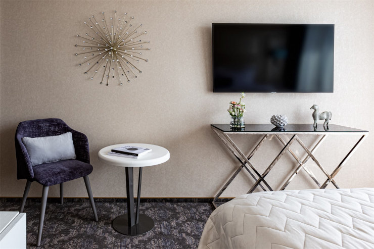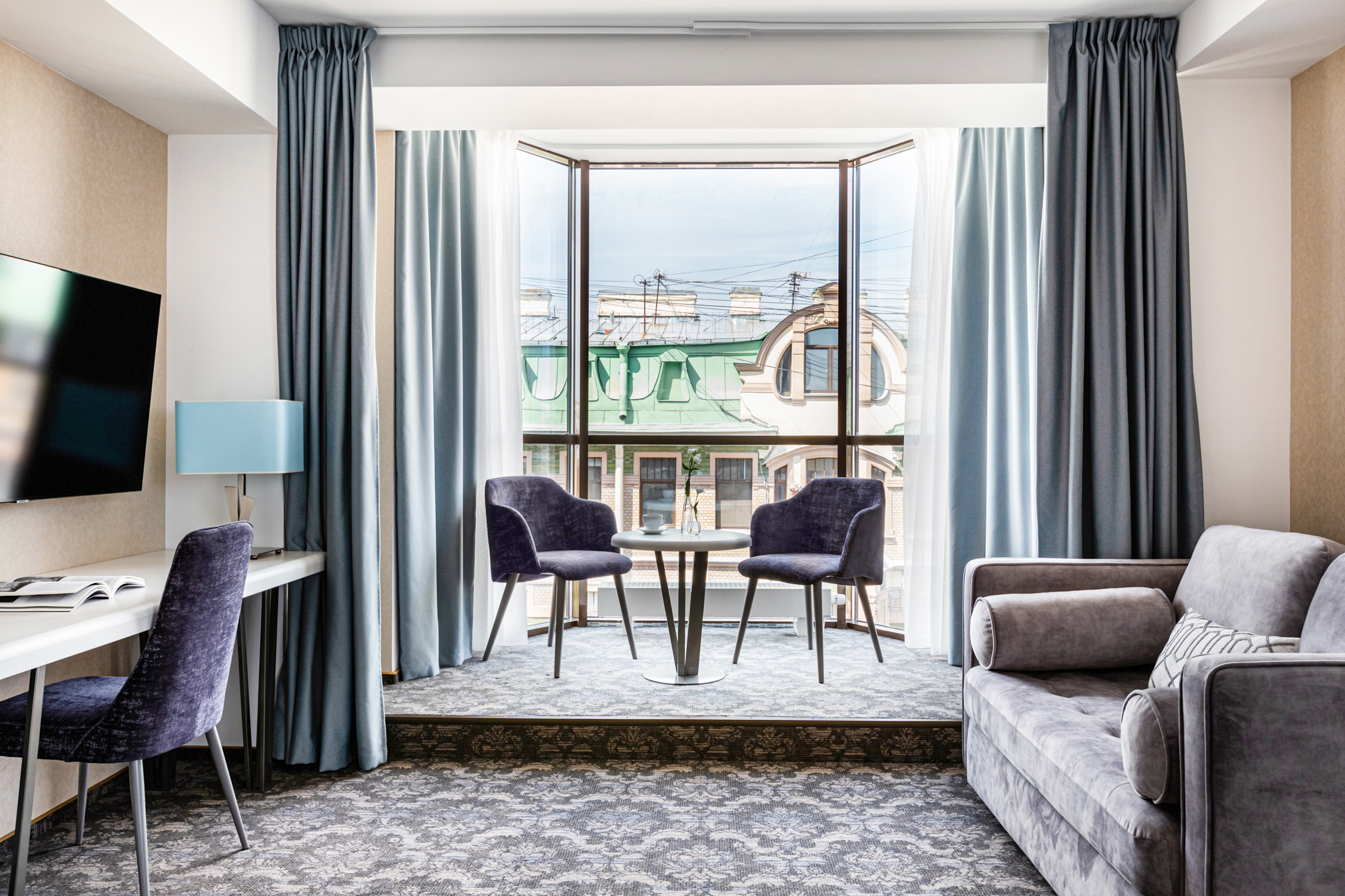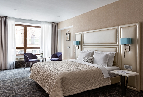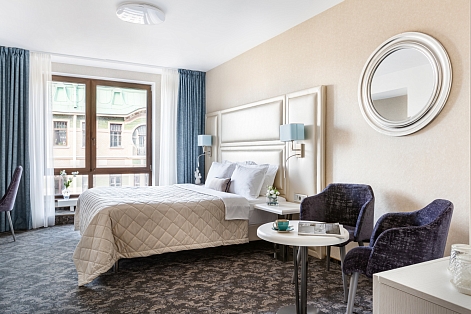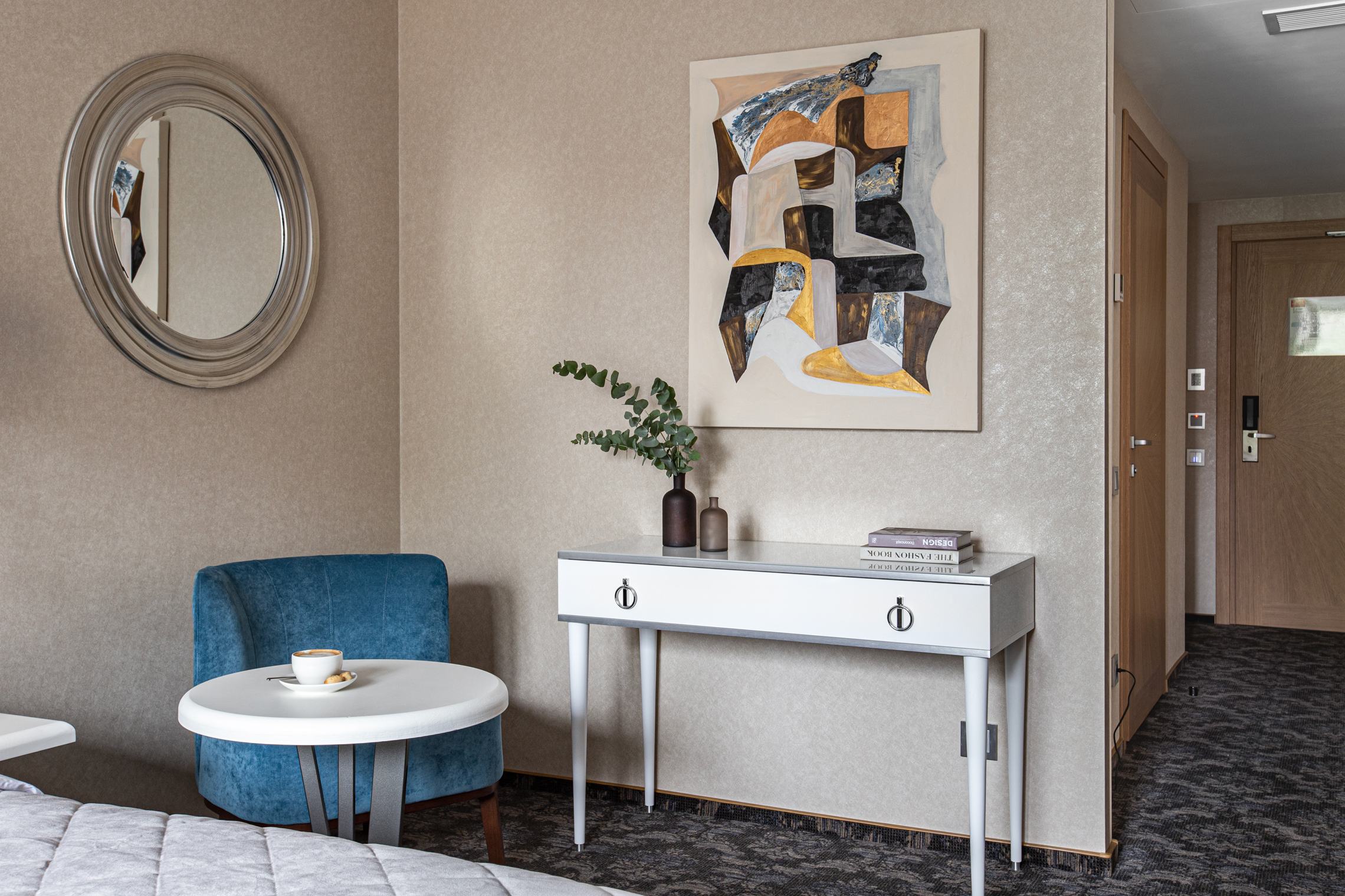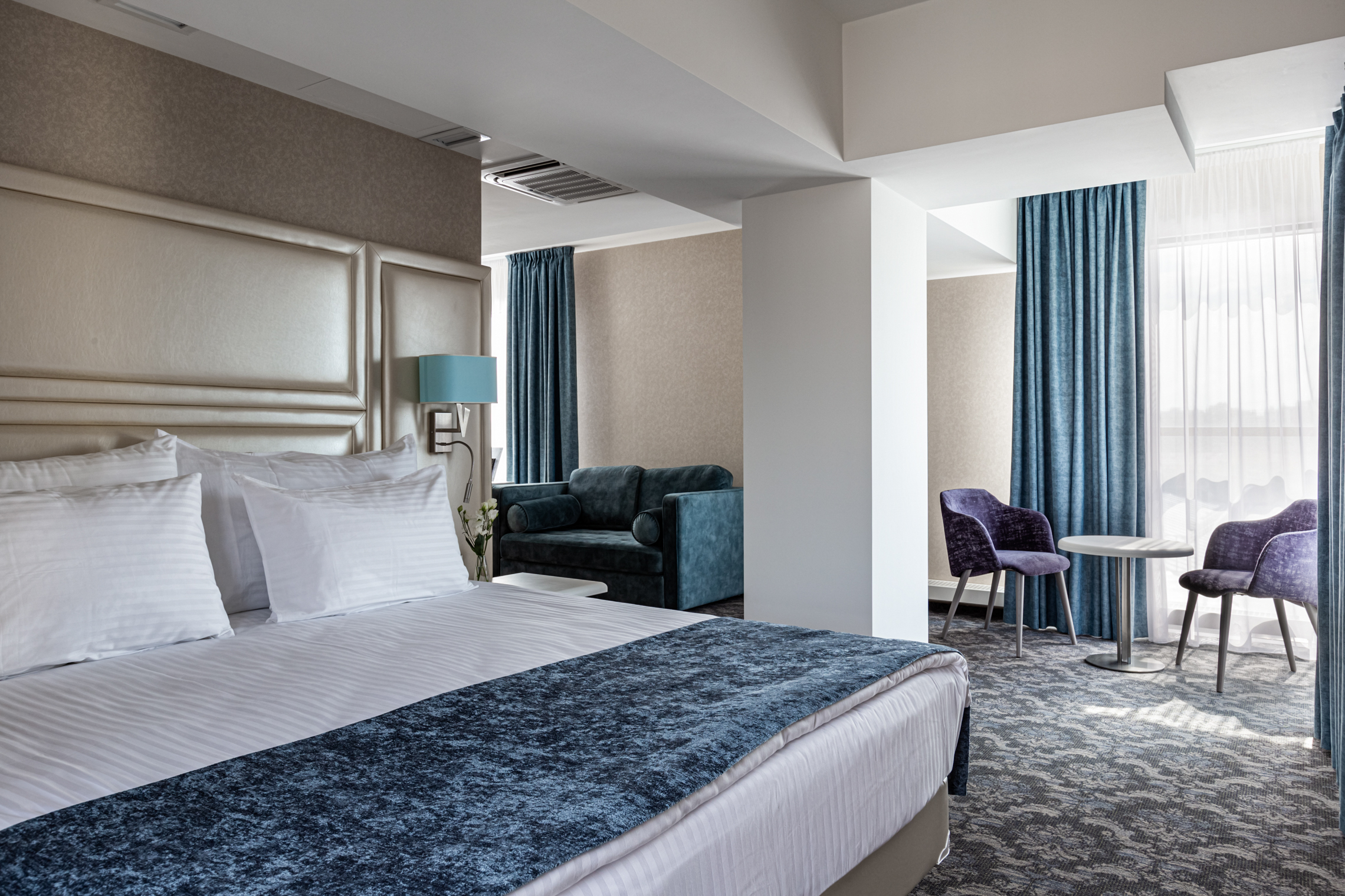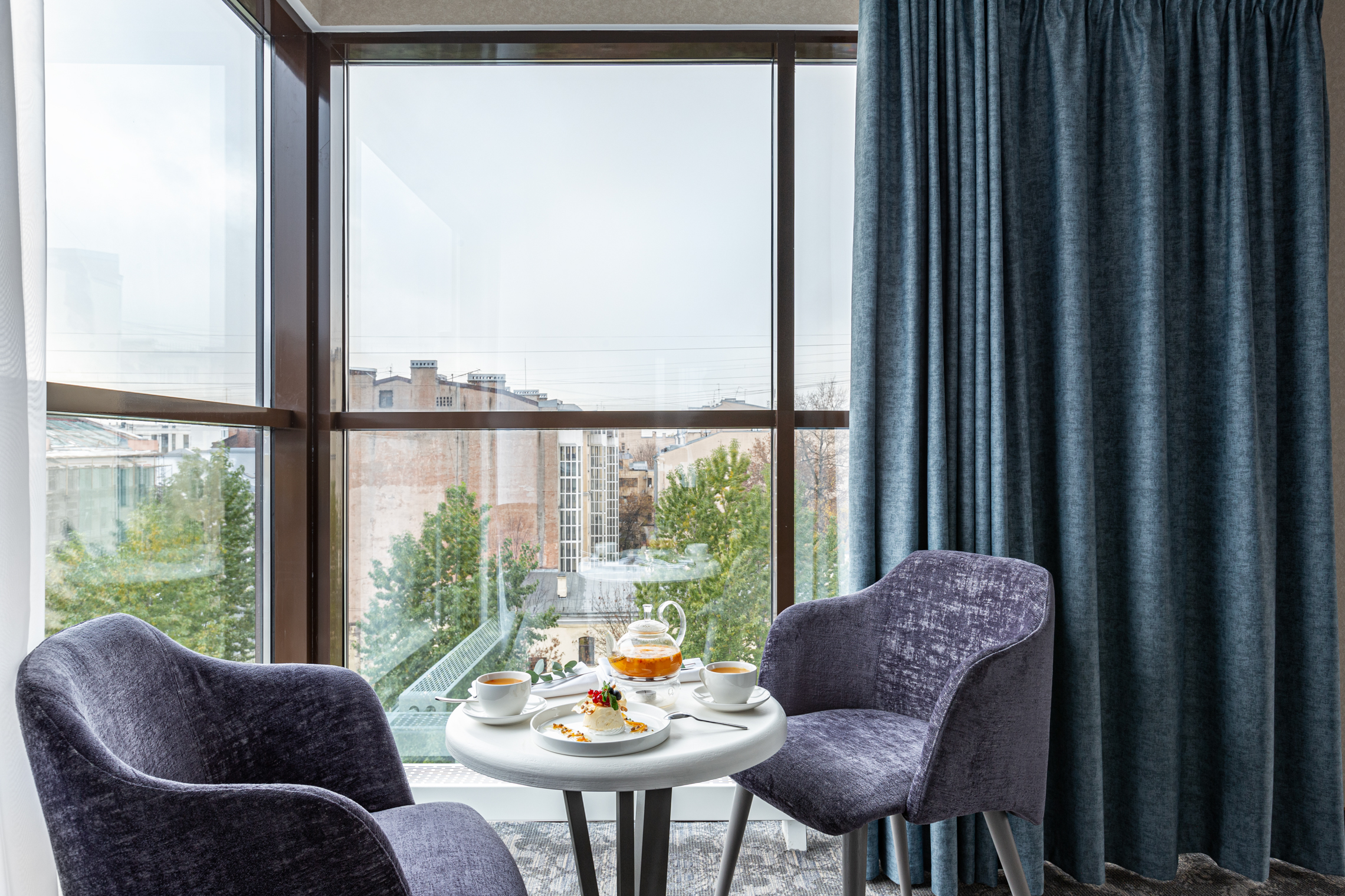 В номере: вешалка, диван, зеркало, кровать двуспальная, прикроватные тумбочки, стол, стулья, шкаф, кондиционер, кофемашина, мини-холодильник, сейф, телевизор, телефон, чайный набор посуды, электрочайник
