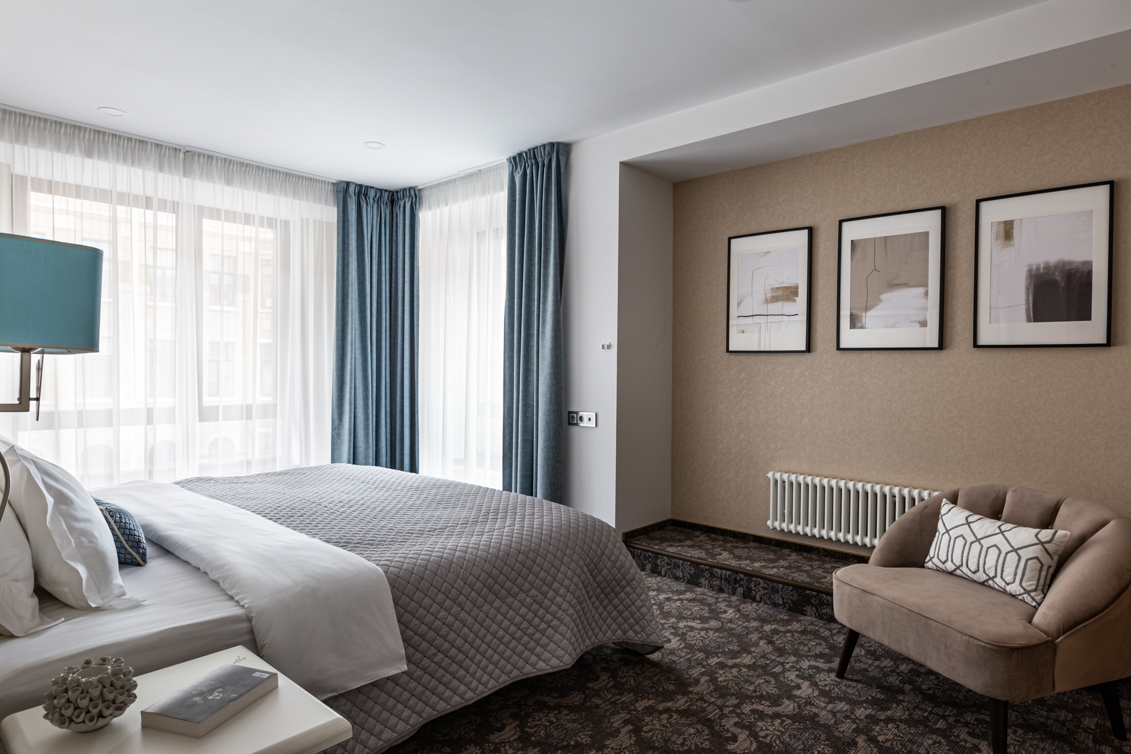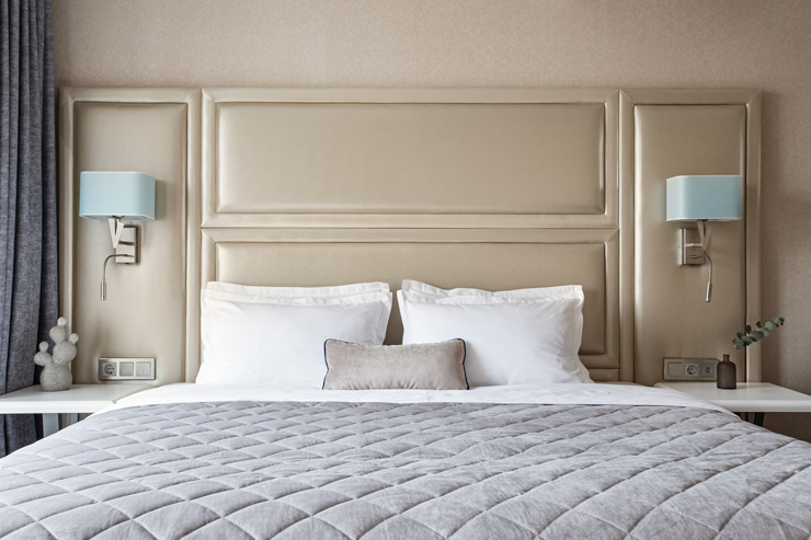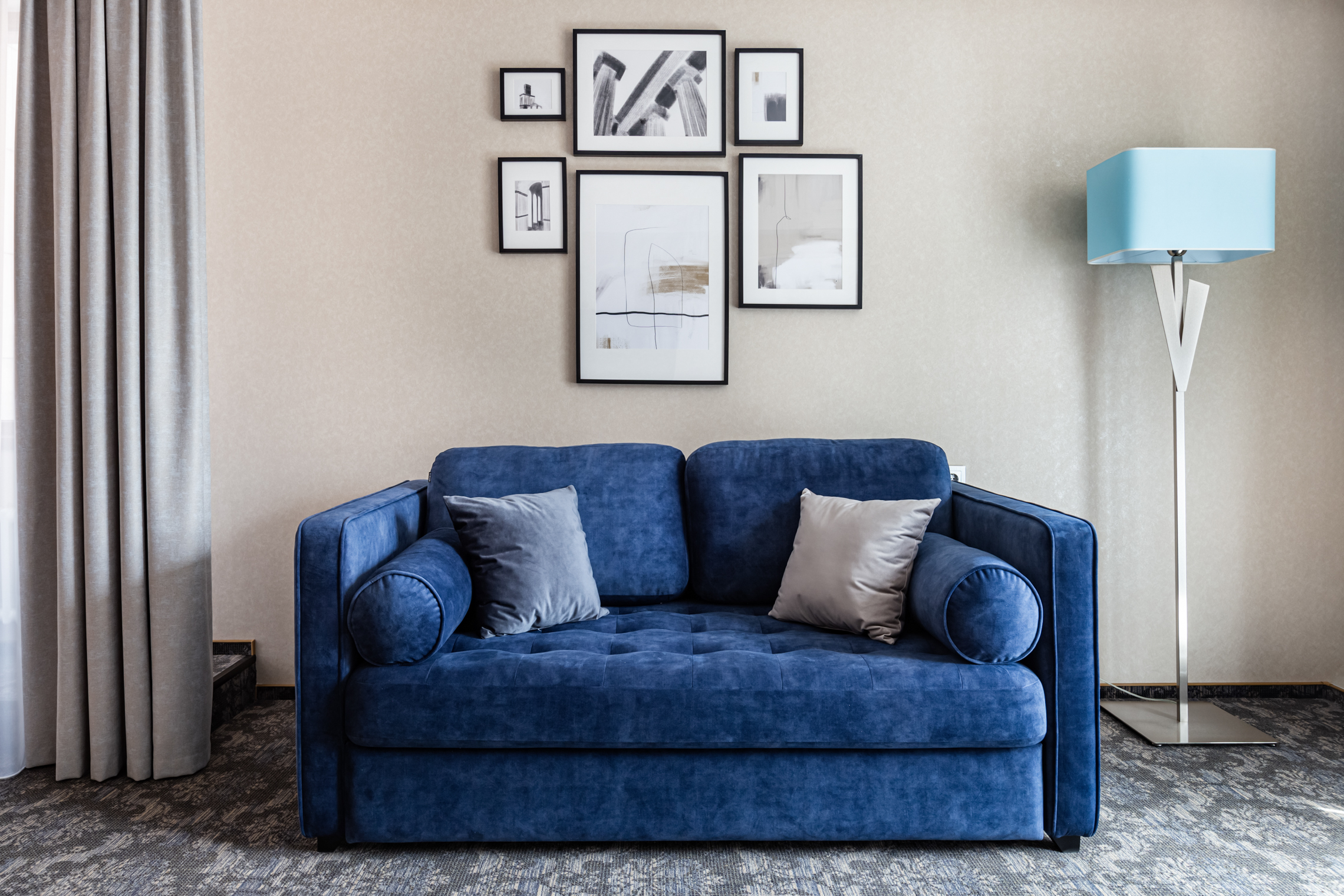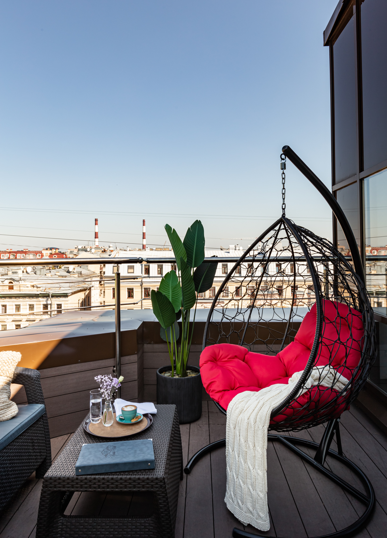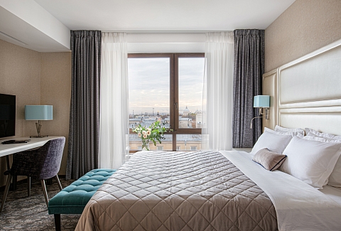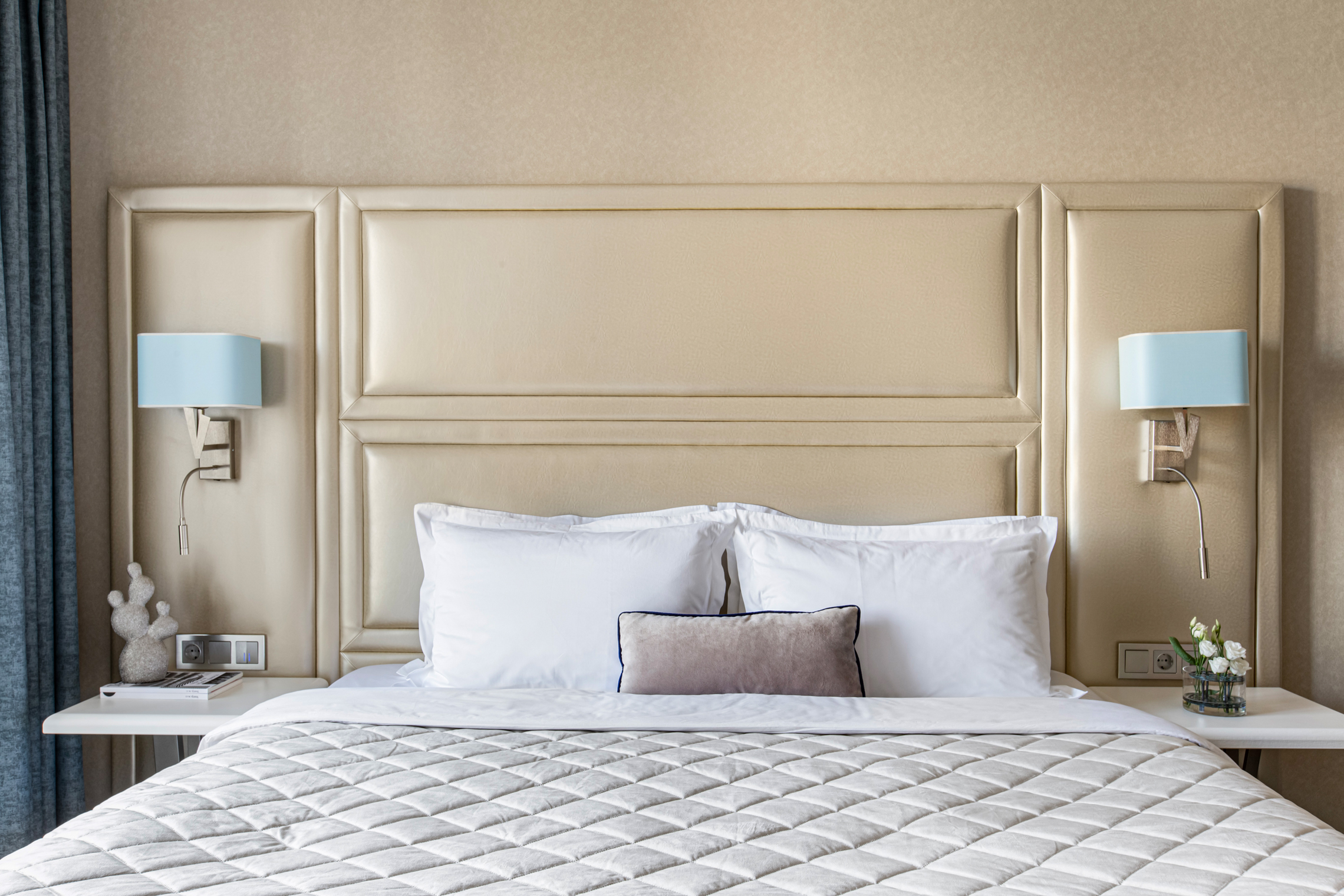 В номере: вешалка, диван, зеркало, кровать двуспальная, прикроватные тумбочки, стол, стулья, шкаф, кондиционер, кофемашина, мини-холодильник, сейф, телевизор, телефон, чайный набор посуды, электрочайник