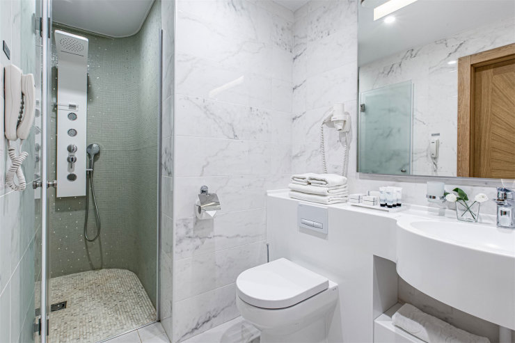 Санузел: с душем или ванной, тапочки, туалетные принадлежности, фен, халат