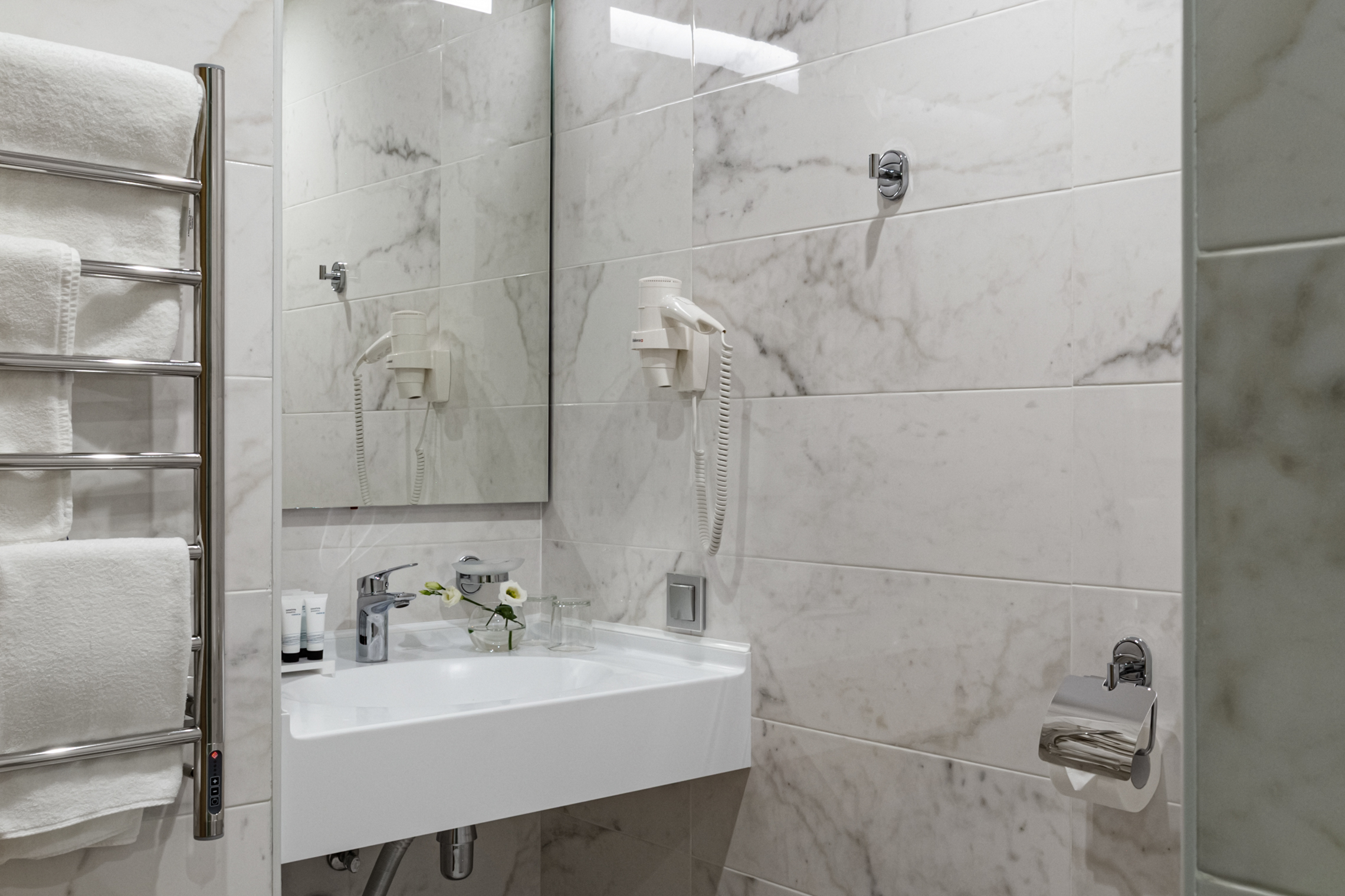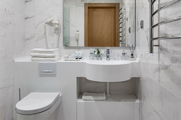 Санузел: с ванной или душевой кабиной, тапочки, туалетные принадлежности, фен, халат