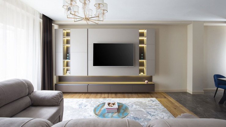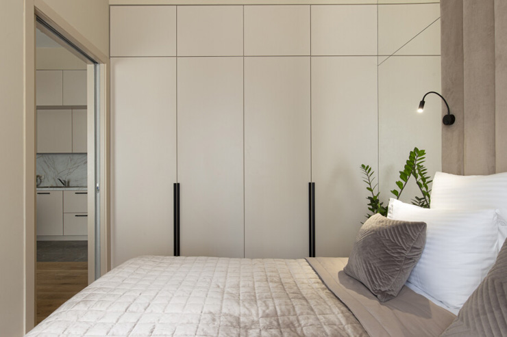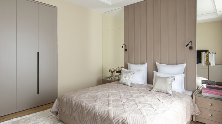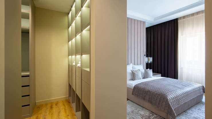 В номере: вешалка, гардеробная, диван, зеркало, кровать двуспальная, прикроватные тумбочки, стол, стулья, шкаф, гладильная доска, духовой шкаф, кондиционер, микроволновая печь, набор посуды, плита электрическая, стиральная машина, телевизор, утюг, холодильник, электрочайник