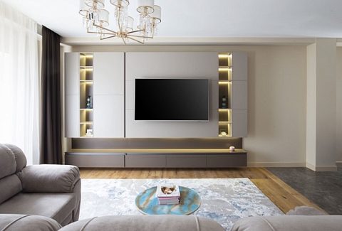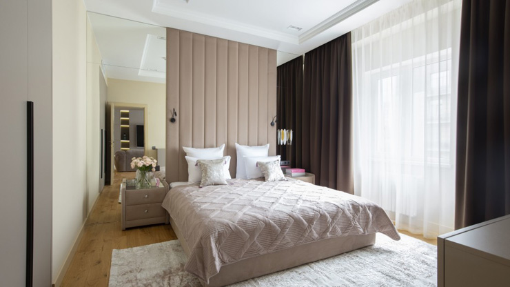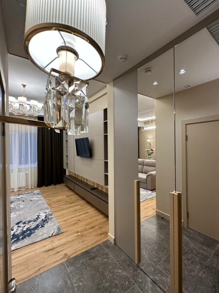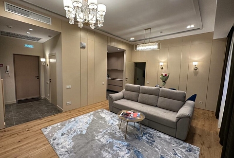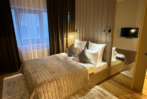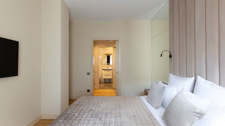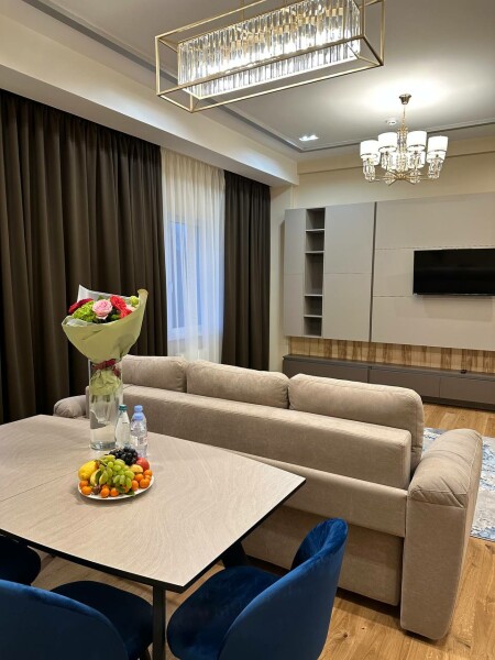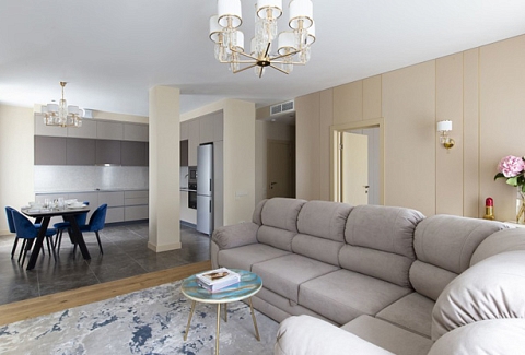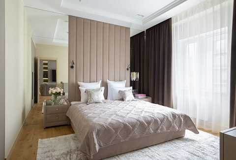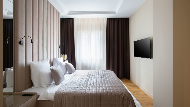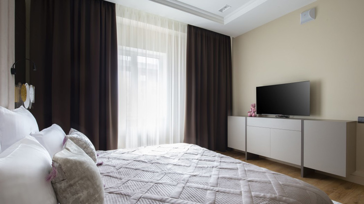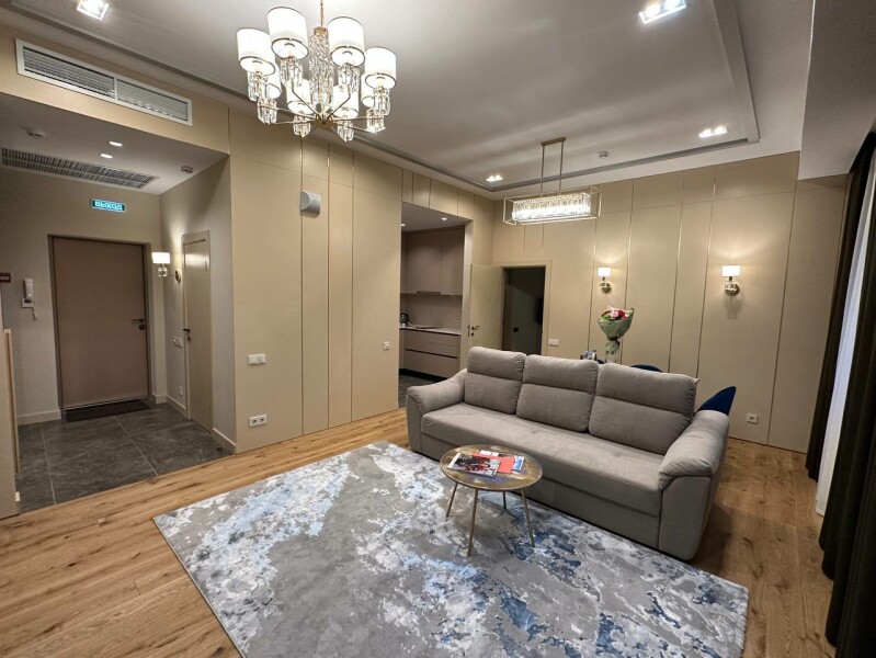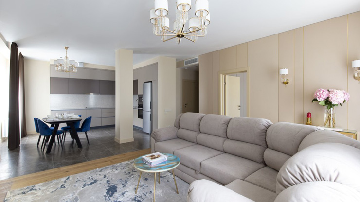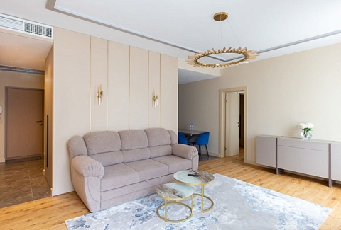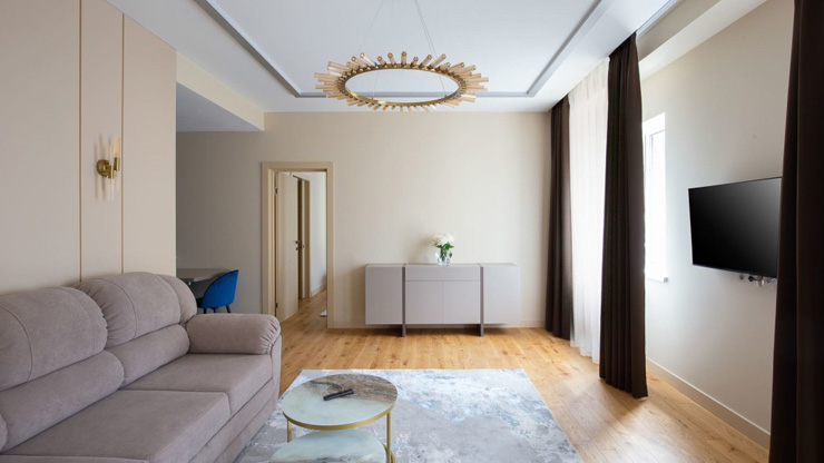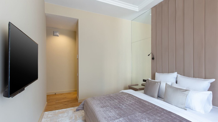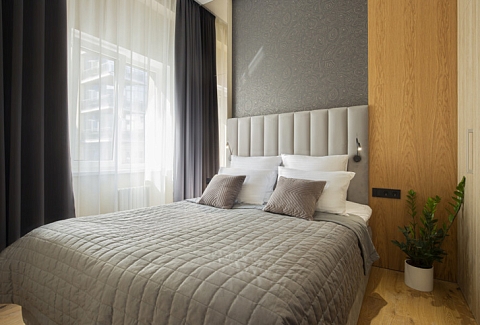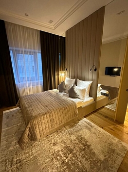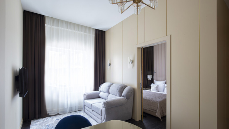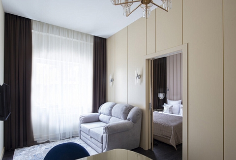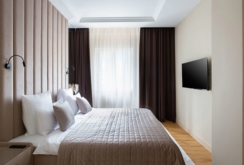 В номере: вешалка, диван, зеркало, кровать двуспальная, прикроватные тумбочки, стол, стулья, шкаф, гладильная доска, кондиционер, микроволновая печь, набор посуды, плита электрическая, посудомоечная машина, сейф, стиральная машина, телевизор, теплый пол, утюг, холодильник, электрочайник