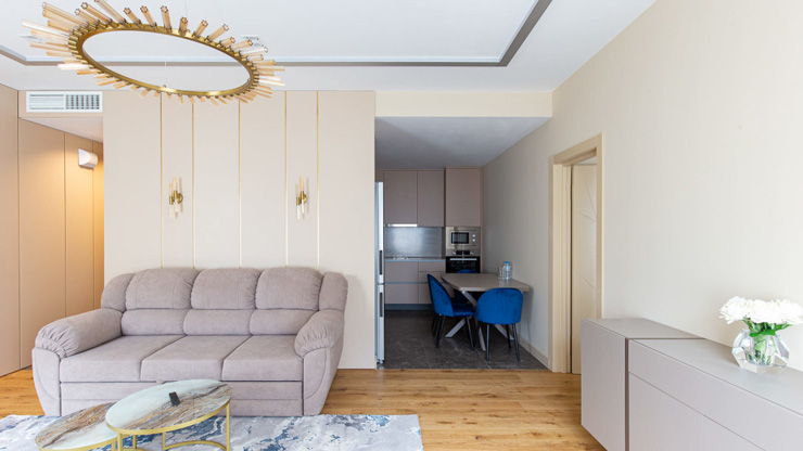 В номере: вешалка, диван, зеркало, кровать двуспальная, прикроватные тумбочки, стол, стулья, шкаф, гладильная доска, духовой шкаф, кондиционер, микроволновая печь, набор посуды, плита электрическая, стиральная машина, телевизор, утюг, холодильник, электрочайник