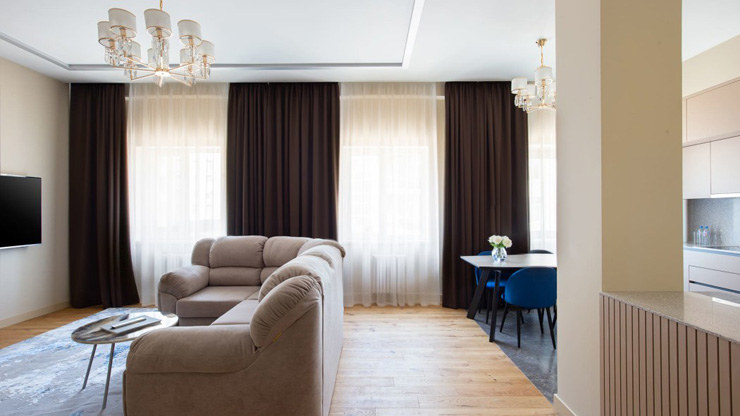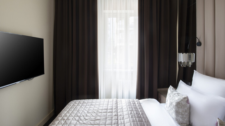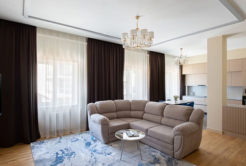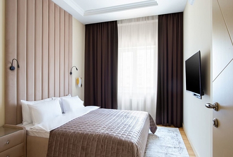 В номере: вешалка, диван, зеркало, кровать двуспальная, прикроватные тумбочки, стол, стулья, шкаф, гладильная доска, кондиционер, микроволновая печь, набор посуды, плита электрическая, сейф, стиральная машина, телевизор, утюг, холодильник, электрочайник