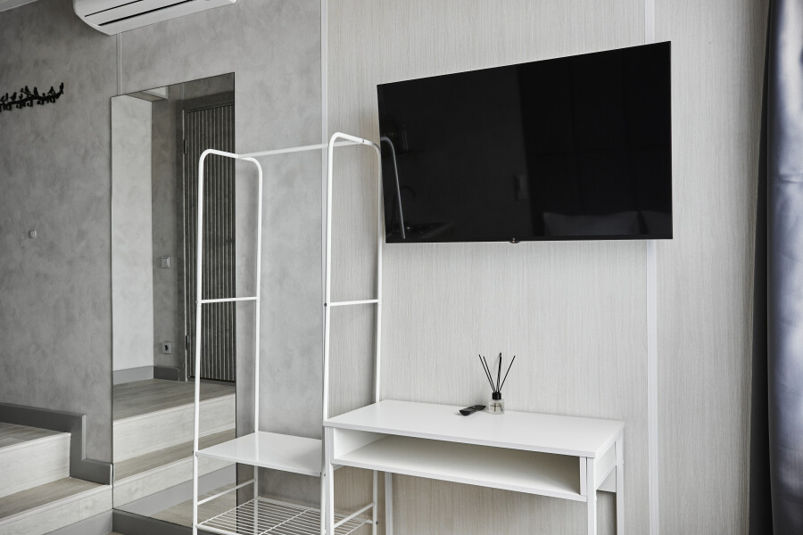 В номере: вешалка, зеркало, кровать двуспальная, прикроватные тумбочки, стол, стул, кондиционер, микроволновая печь, мини-холодильник, набор посуды, телевизор, электрочайник