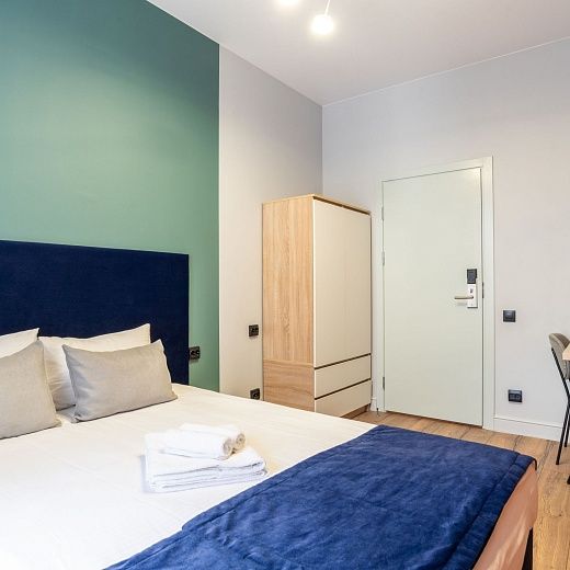 В номере: вешалка, диван, зеркало, кровати односпальные /одна двуспальная кровать, прикроватные тумбочки, стол, стулья, шкаф, кондиционер, микроволновая печь, плита электрическая, стиральная машина, телевизор ЖК, чайник