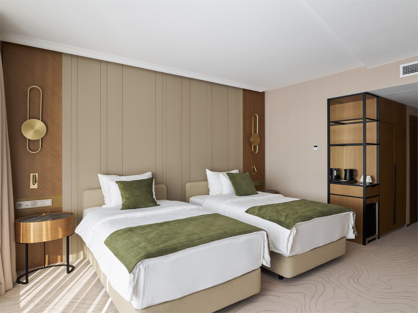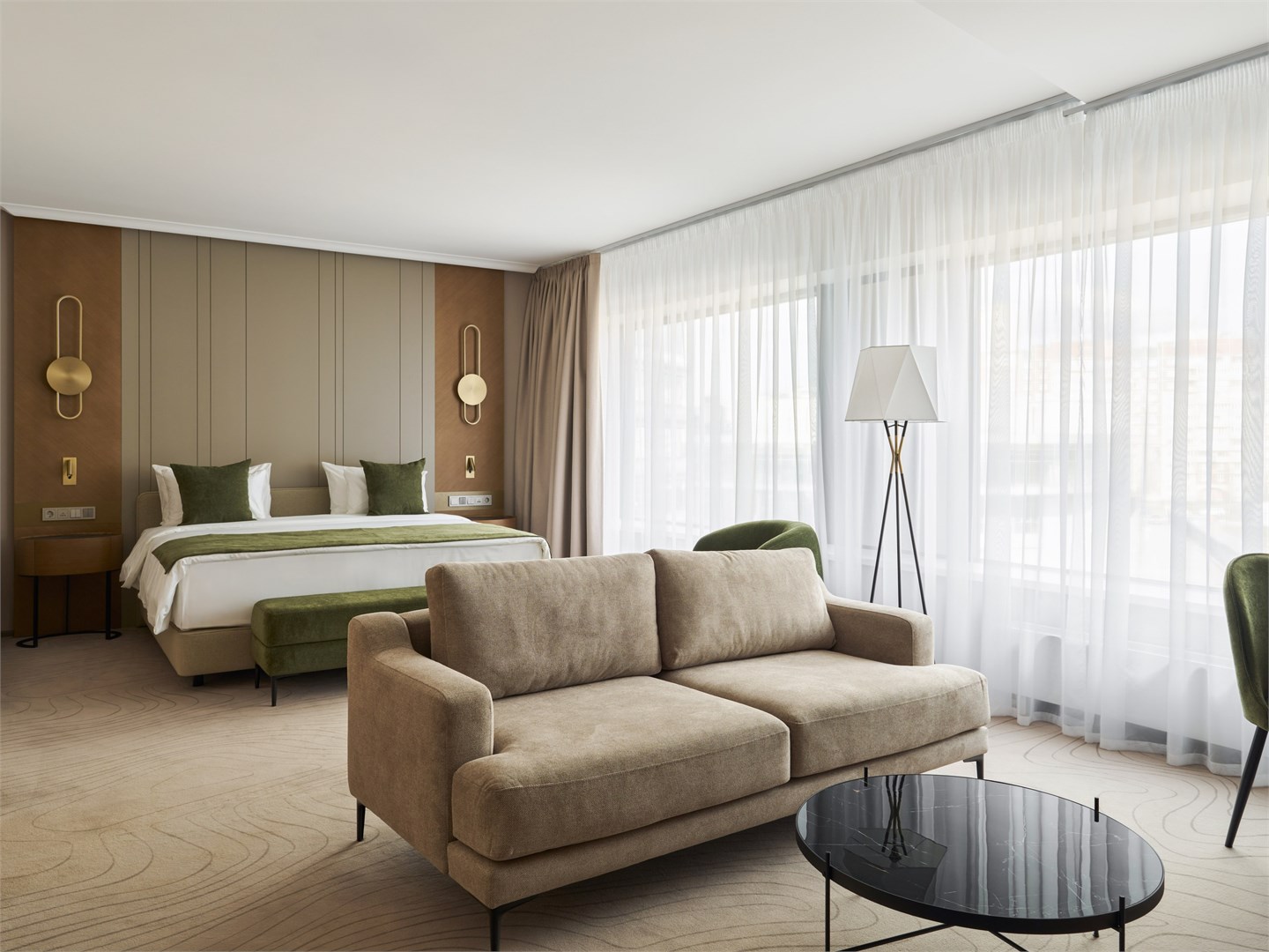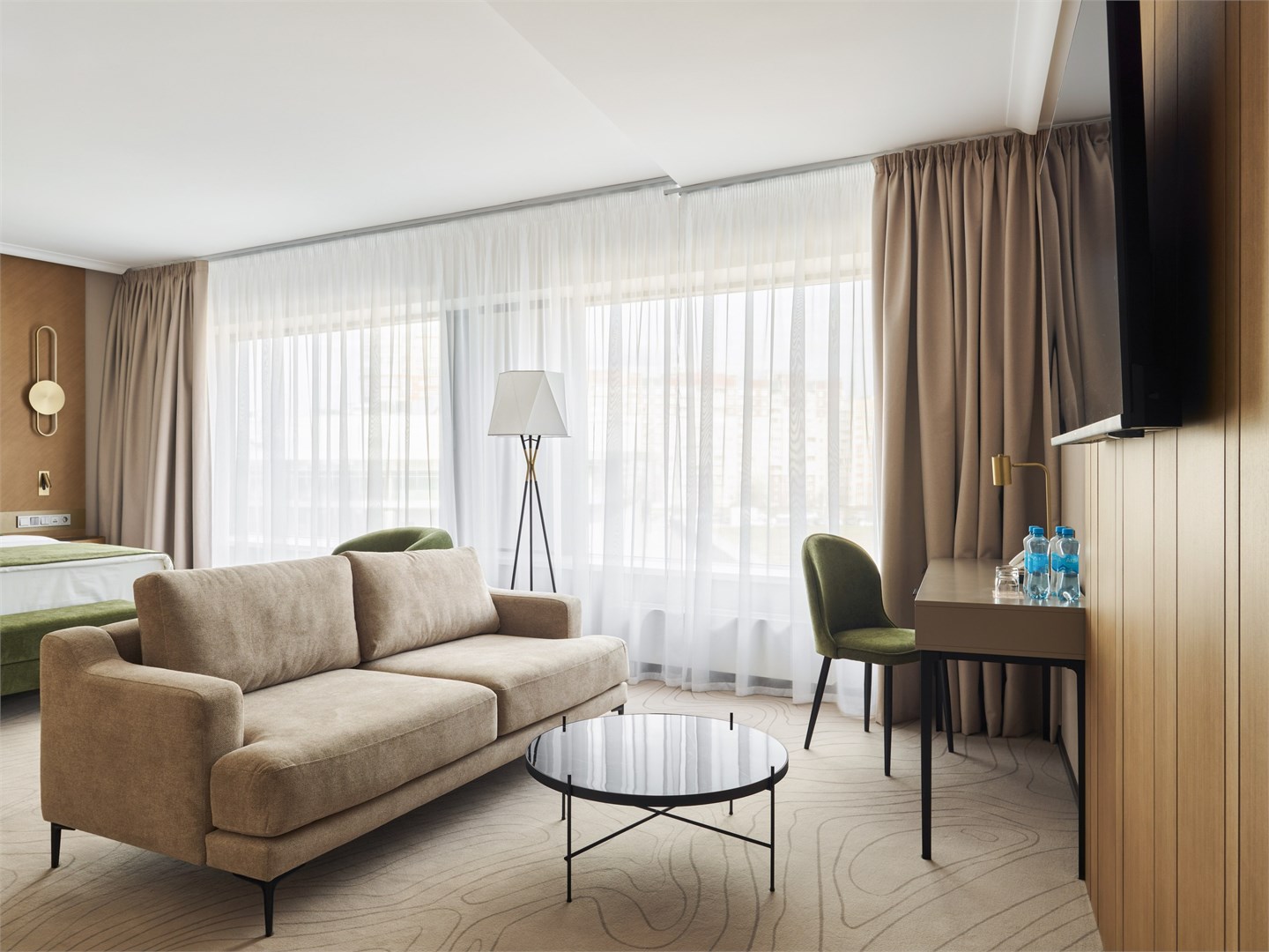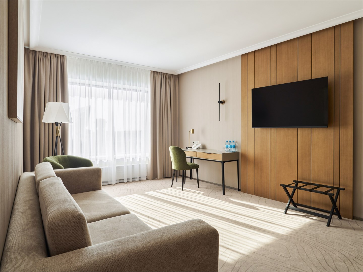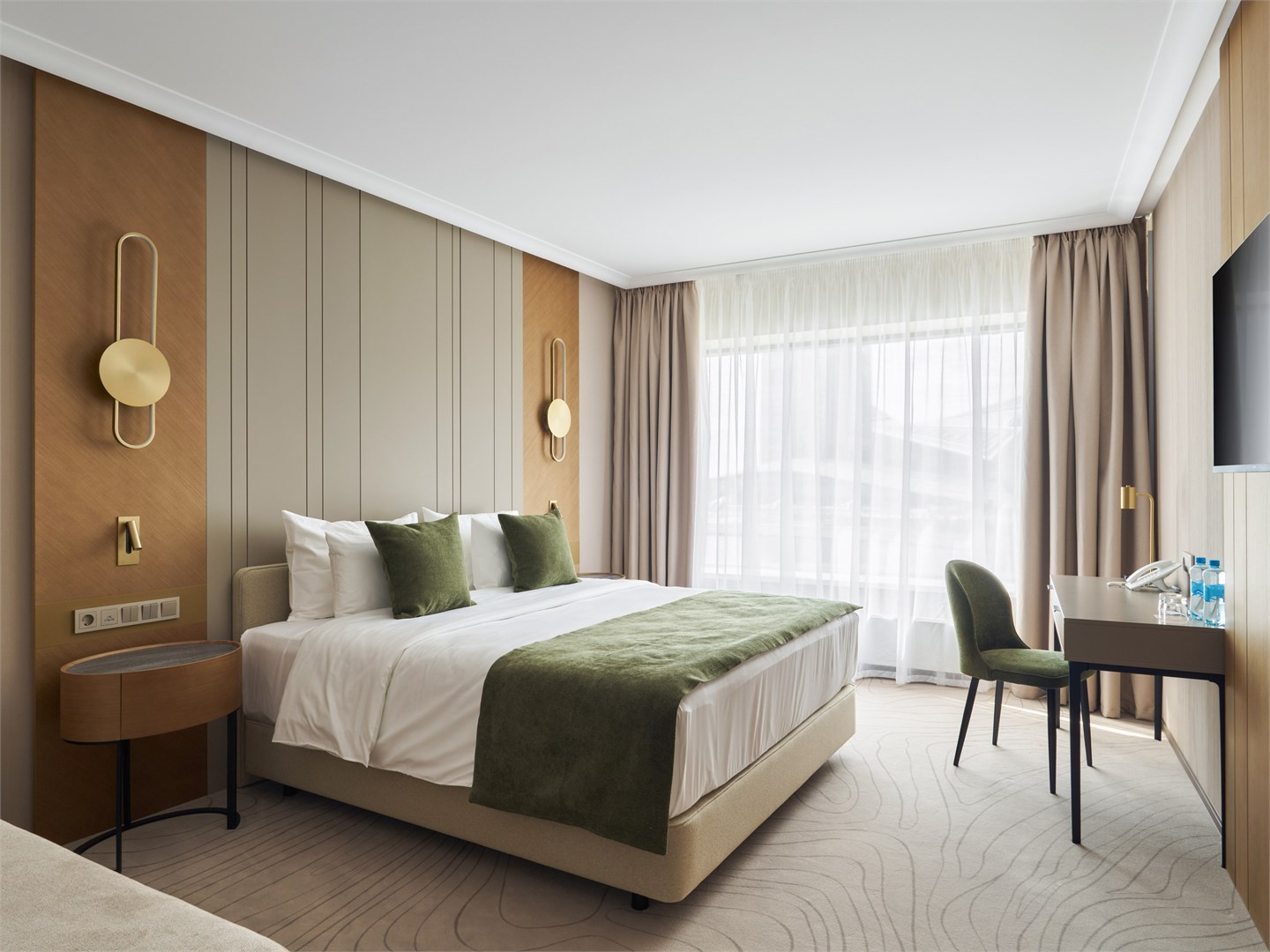 В номере: вешалка, диван, зеркало, кресла, кровать двуспальная, прикроватные столики, стол, стулья, шкаф, гладильная доска, кондиционер, кофемашина, микроволновая печь, набор посуды, посудомоечная машина, сейф, телевизор, телефон, утюг, холодильник, электрочайник