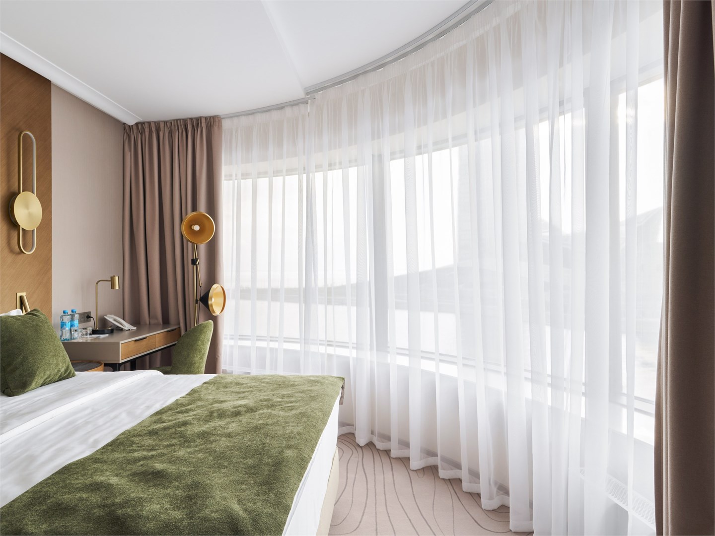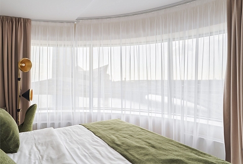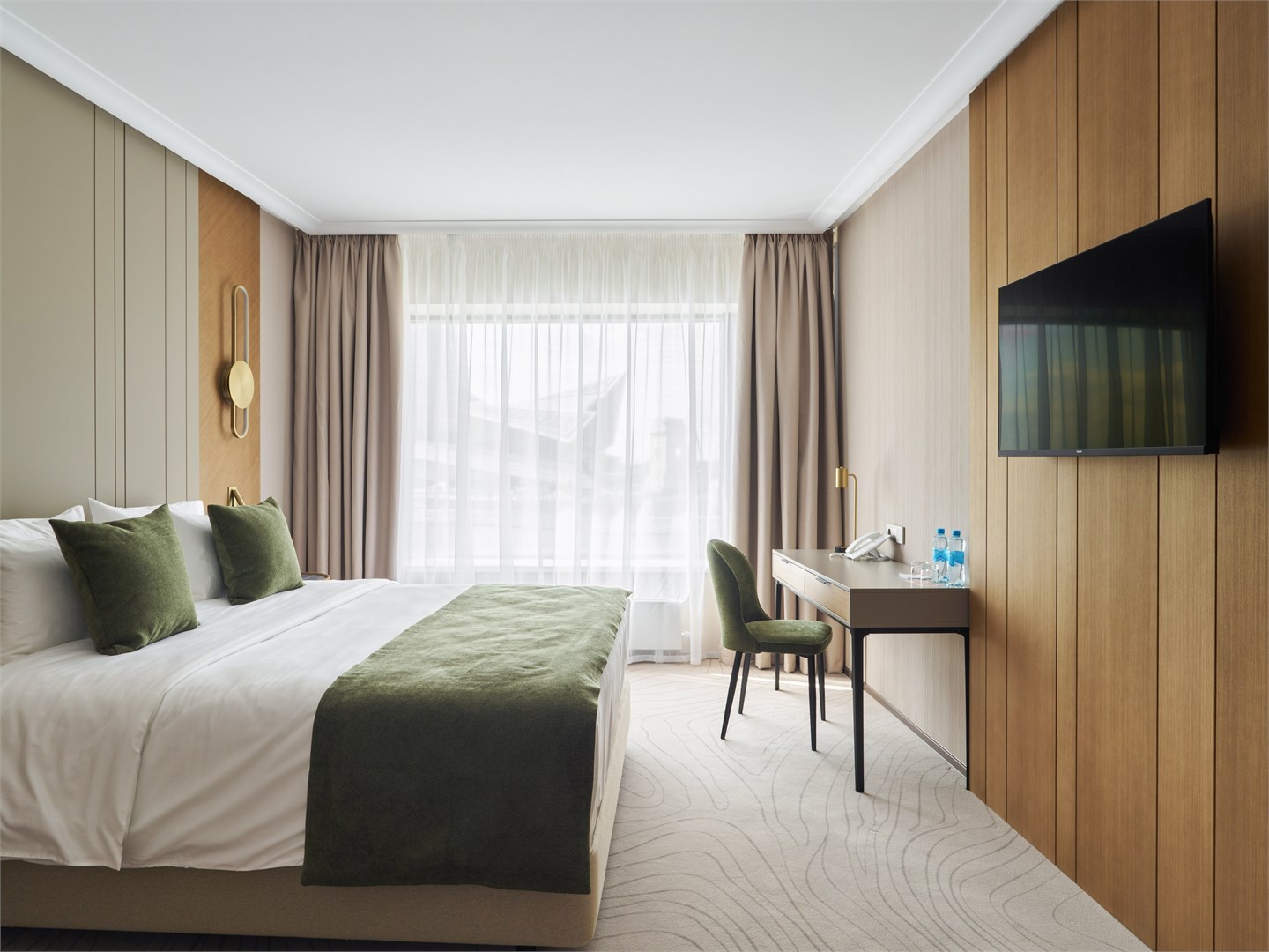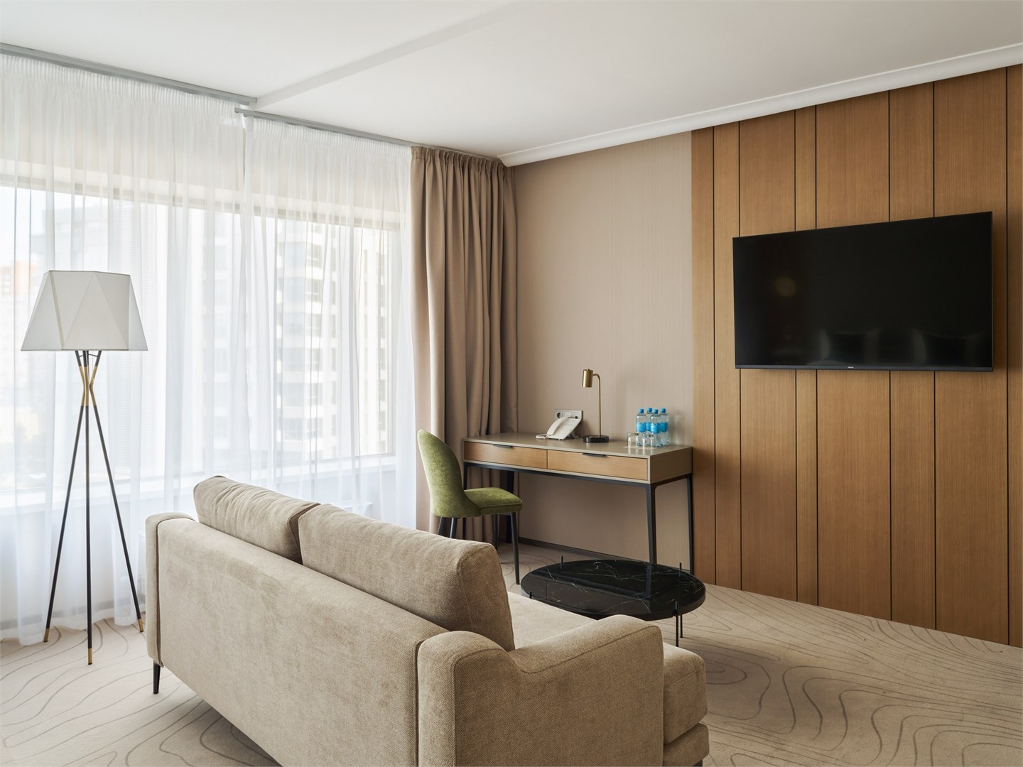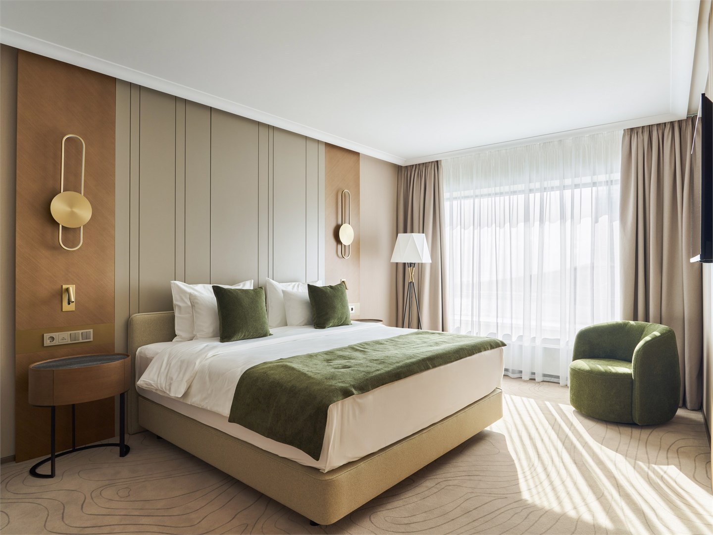 В номере: вешалка, диван, зеркало, кресла, кровать двуспальная, прикроватные столики, стол, стулья, шкаф, гладильная доска, кондиционер, кофемашина, микроволновая печь, набор посуды, посудомоечная машина, сейф, телевизор, телефон, утюг, холодильник, электрочайник