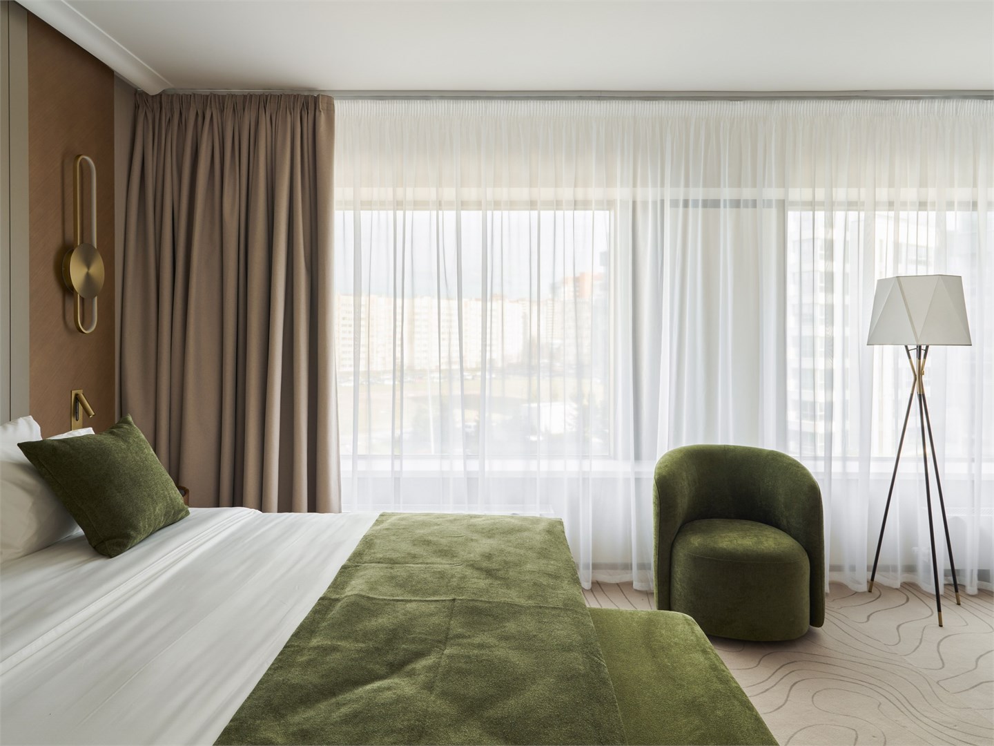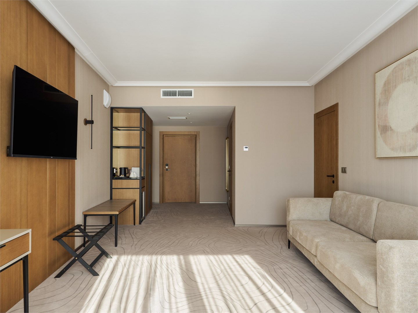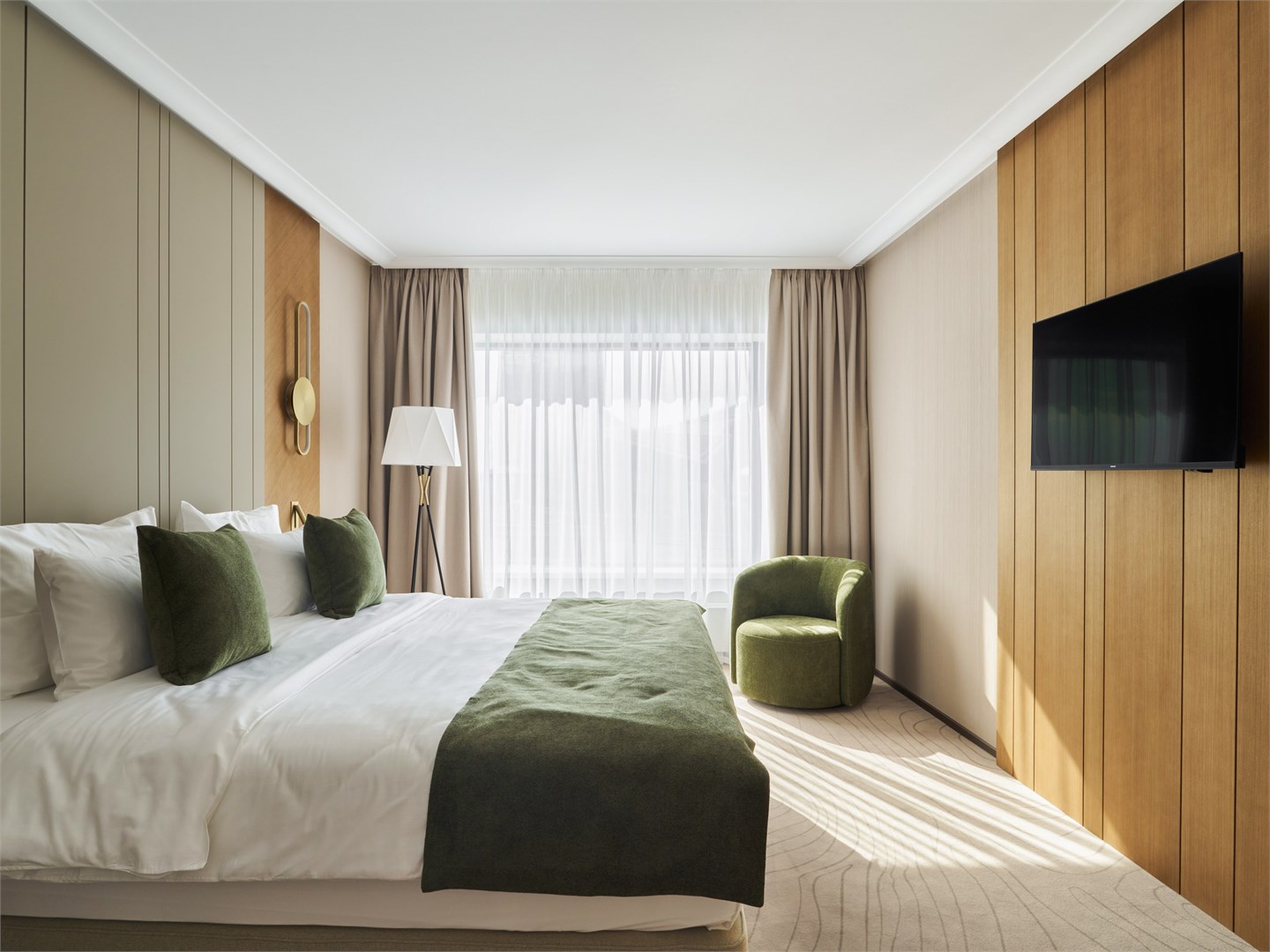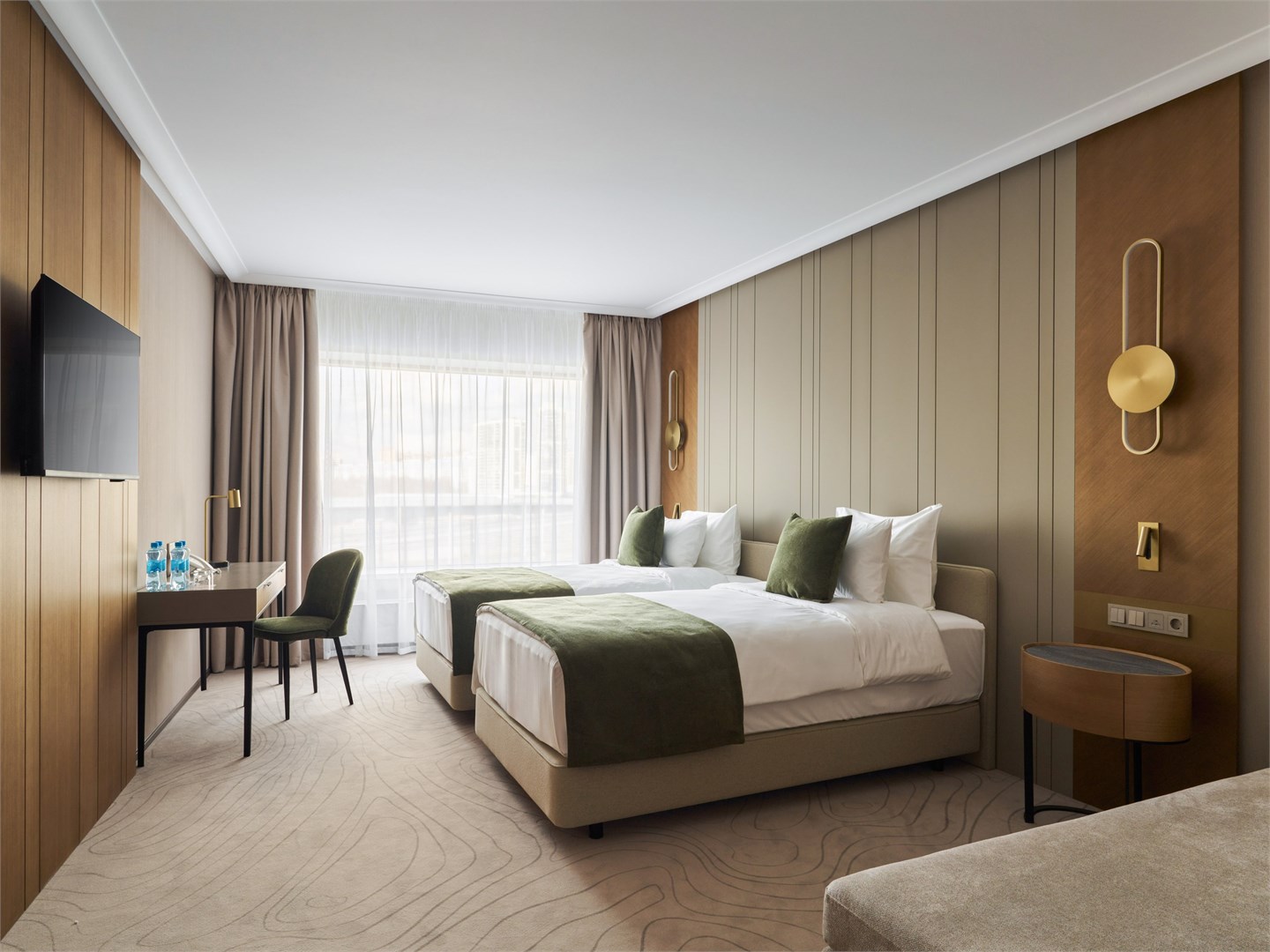 В номере: вешалка, диван, зеркало, кресла, кровать двуспальная, прикроватные столики, стол, стулья, шкаф, гладильная доска, кондиционер, кофемашина, микроволновая печь, набор посуды, посудомоечная машина, сейф, телевизор, телефон, утюг, холодильник, электрочайник