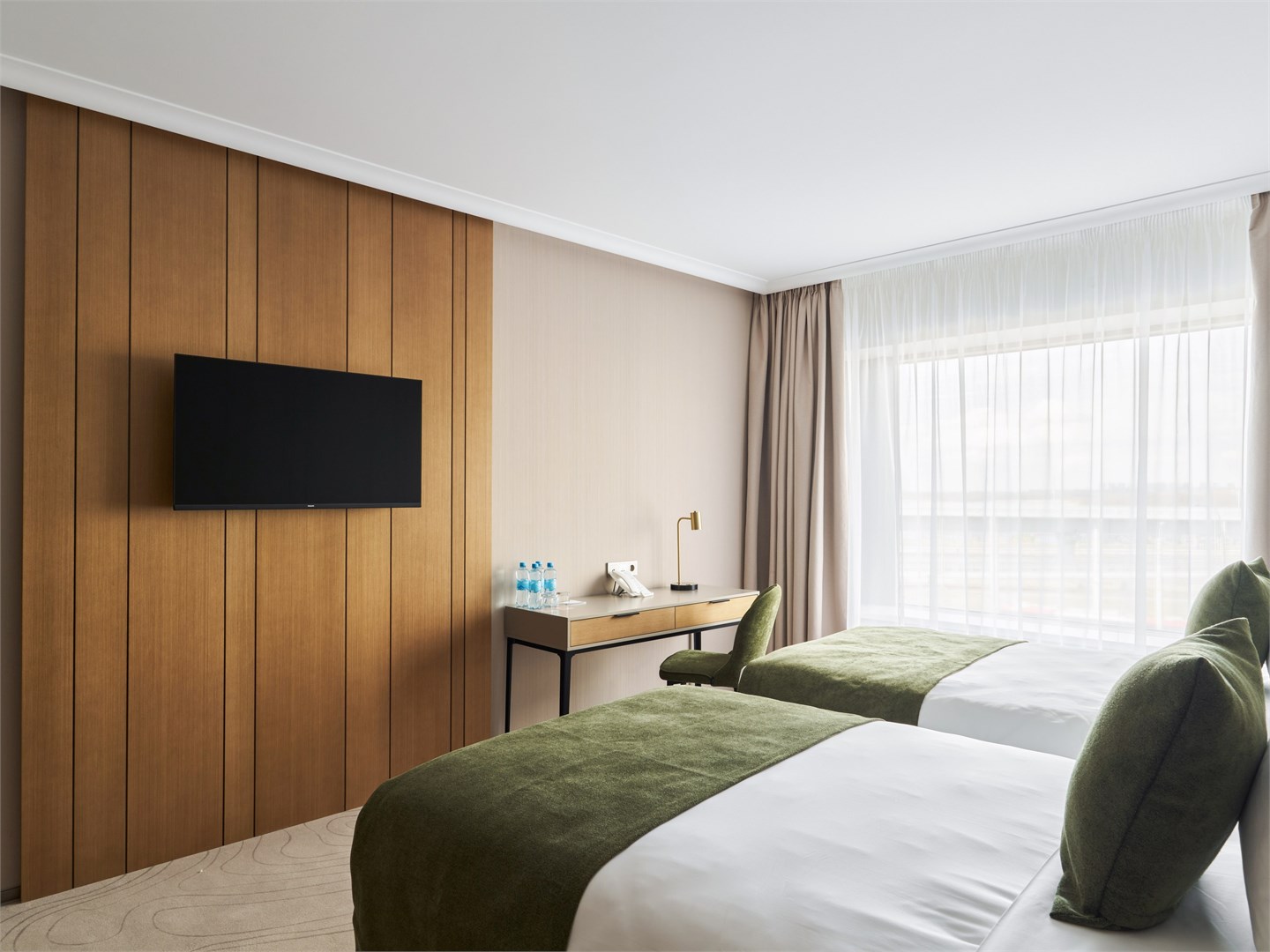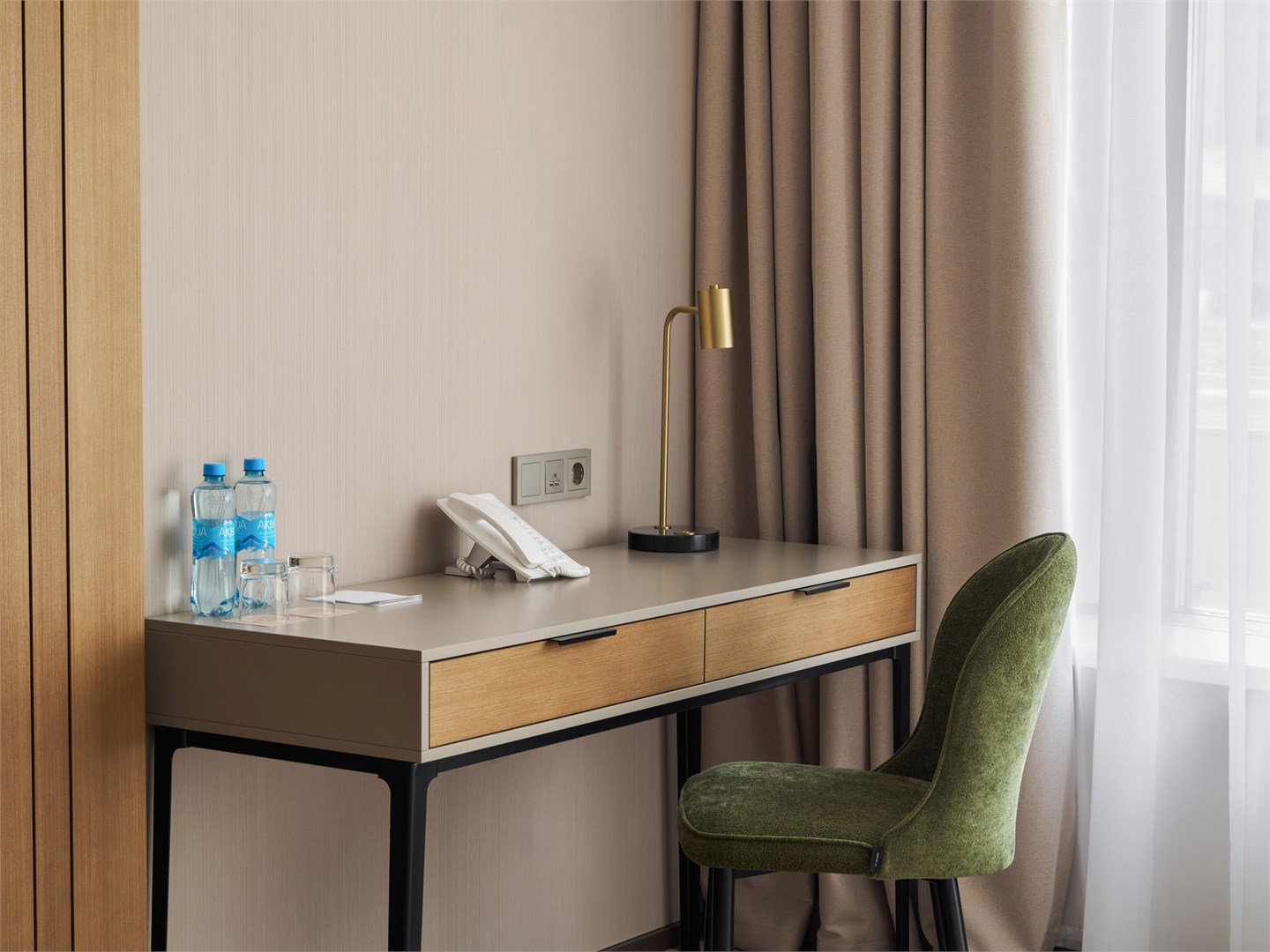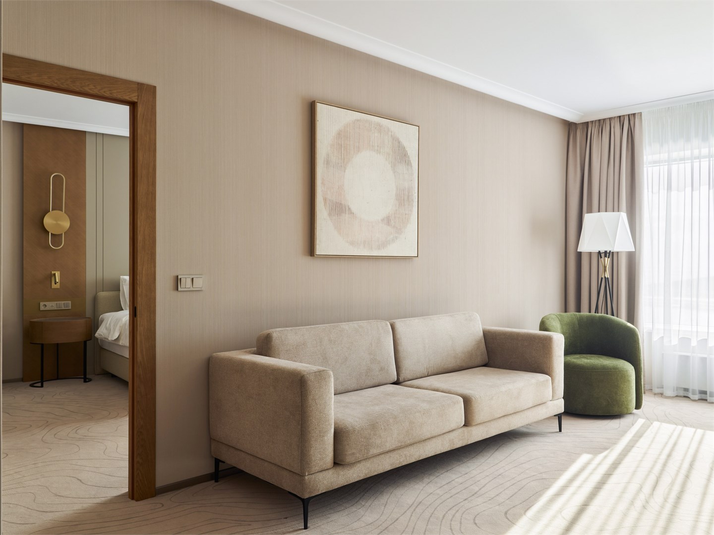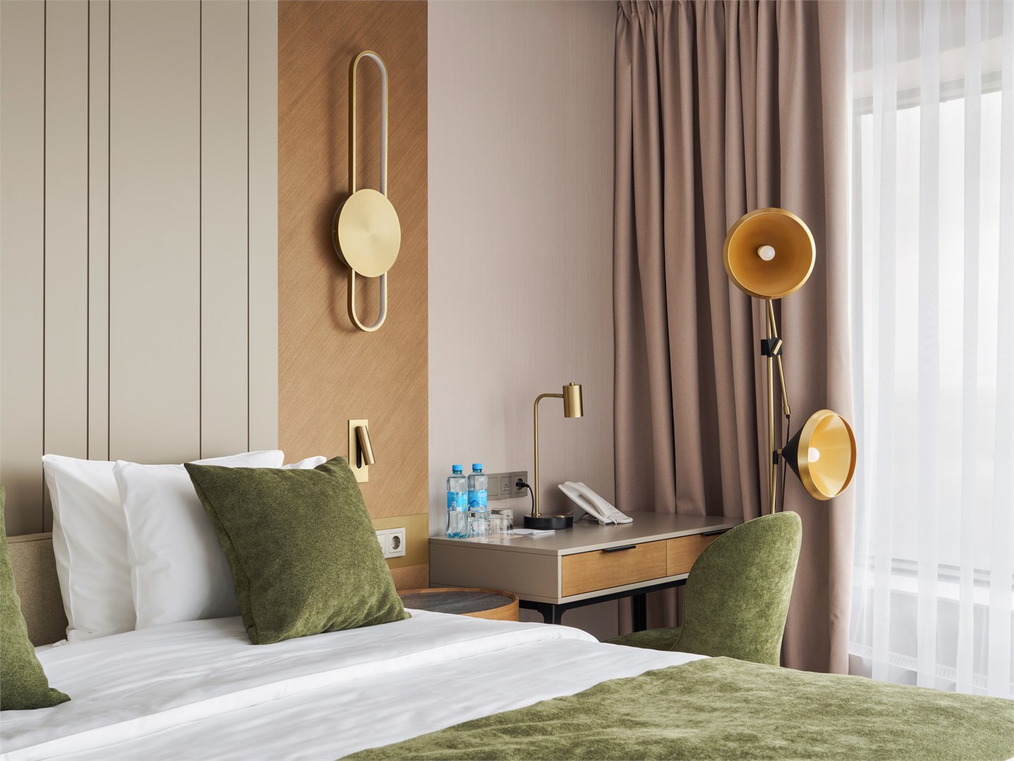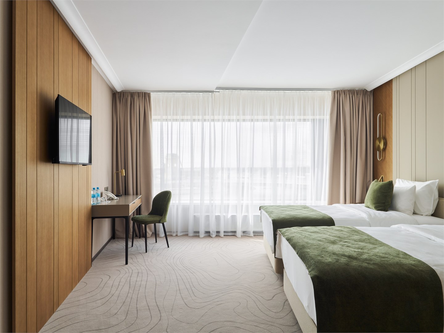 В номере: вешалка, диван, зеркало, кресла, кровать двуспальная, прикроватные столики, стол, стулья, шкаф, гладильная доска, кондиционер, кофемашина, микроволновая печь, набор посуды, посудомоечная машина, сейф, телевизор, телефон, утюг, холодильник, электрочайник