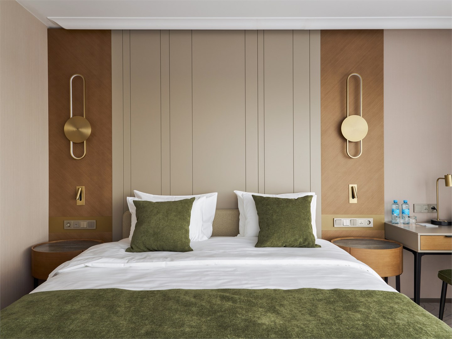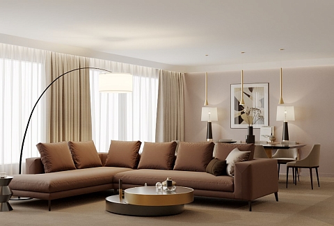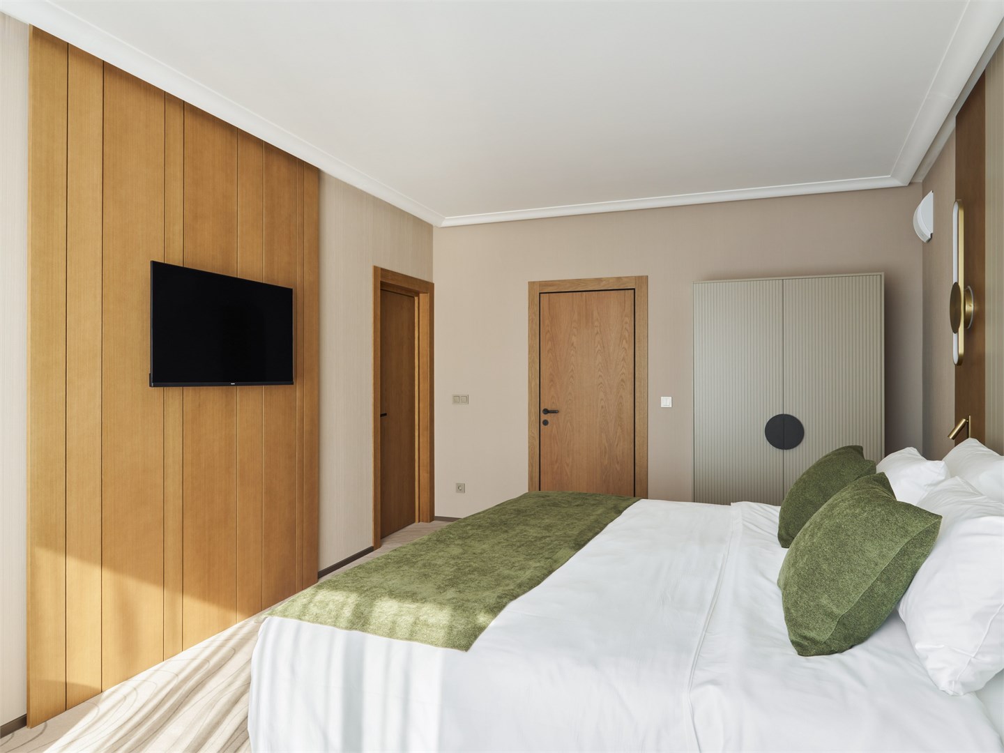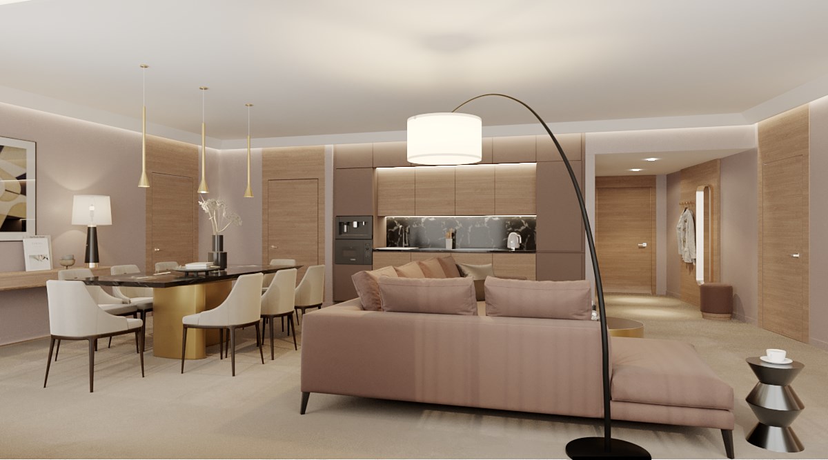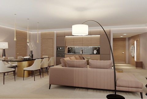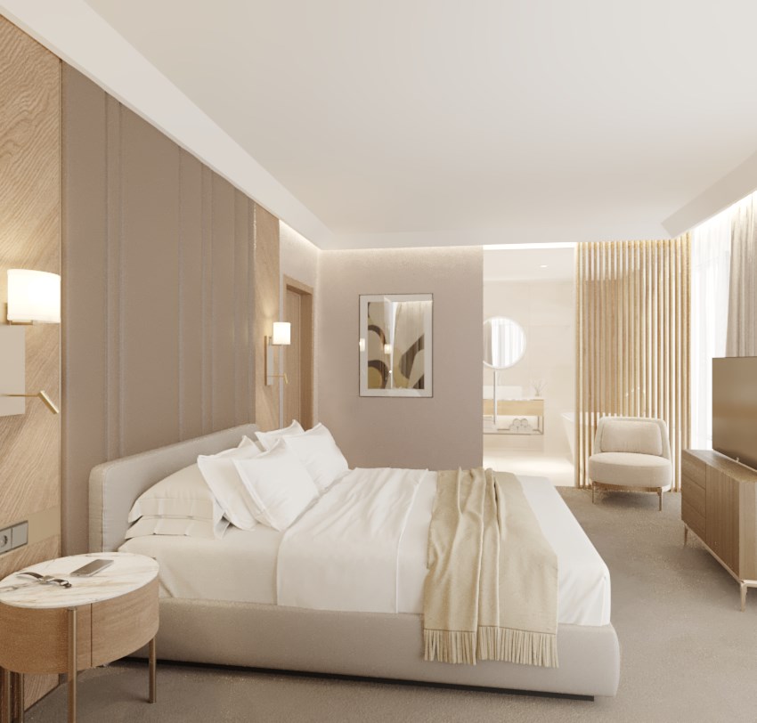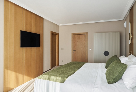 В номере: вешалка, диван, зеркало, кресло, кровать двуспальная, прикроватные тумбочки, стол, стулья, шкаф, гладильная доска, кондиционер, кофемашина, микроволновая печь, мини-холодильник, набор посуды, посудомоечная машина, сейф, телевизор, телефон, утюг, электрочайник