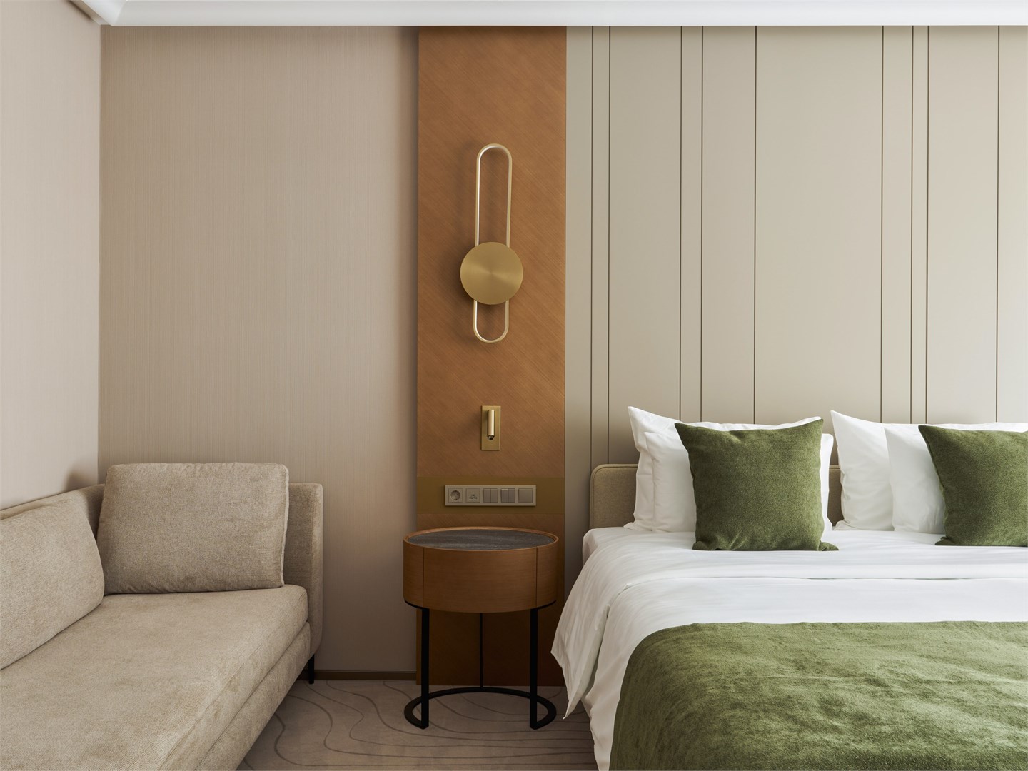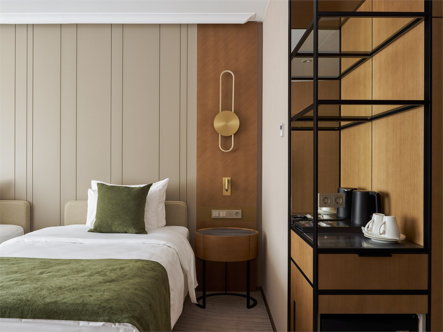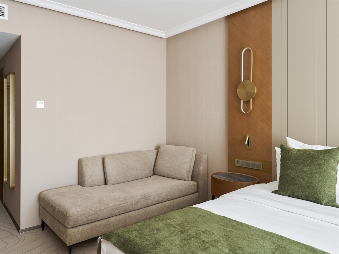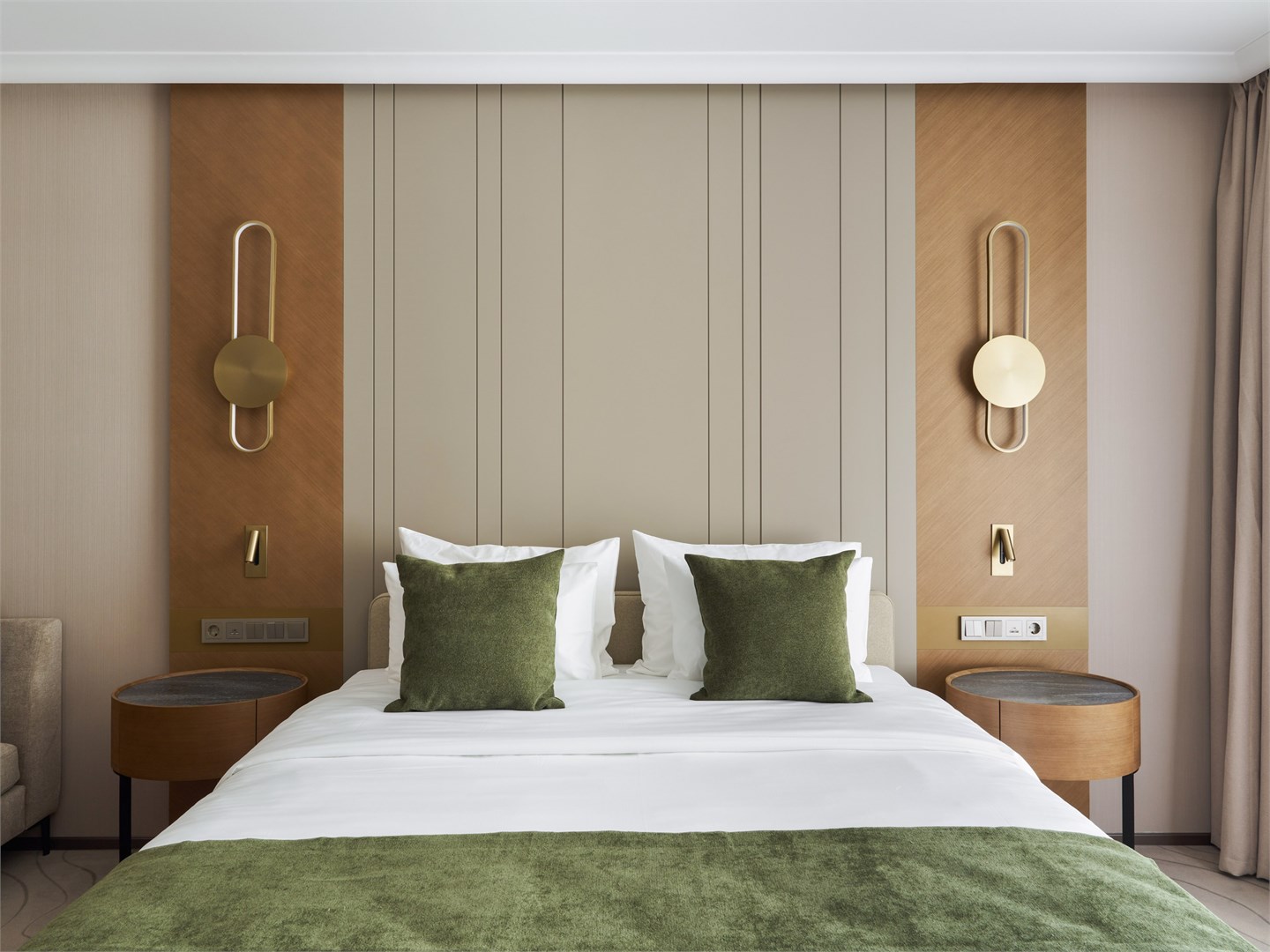 В номере: вешалка, диван, зеркало, кресло, кровать двуспальная, прикроватные тумбочки, стол, стулья, шкаф, гладильная доска, кондиционер, кофемашина, микроволновая печь, мини-холодильник, набор посуды, посудомоечная машина, сейф, телевизор, телефон, утюг, электрочайник