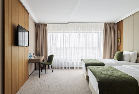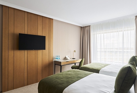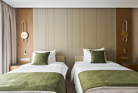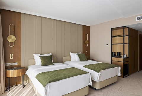 В номере: вешалка, зеркало, кровати полутороспальные, прикроватные столики, стол, стулья, шкаф, кондиционер, мини-холодильник, набор посуды, сейф, телевизор, телефон, электрочайник