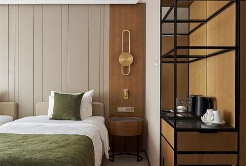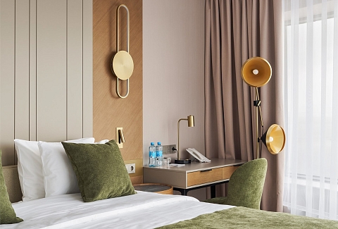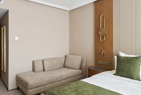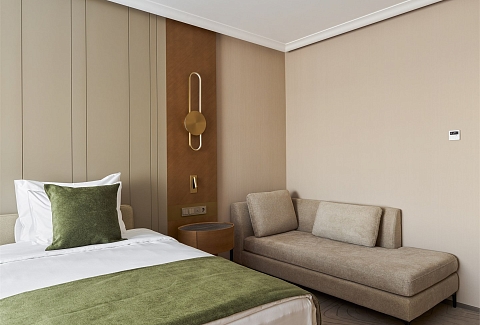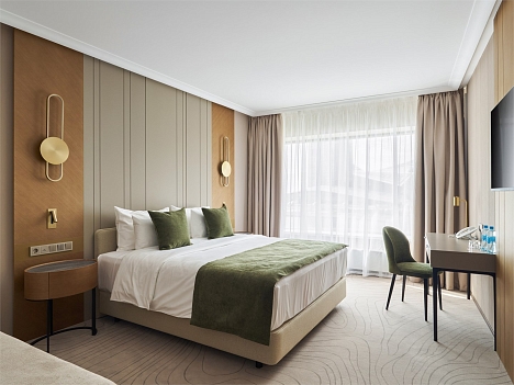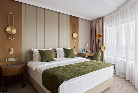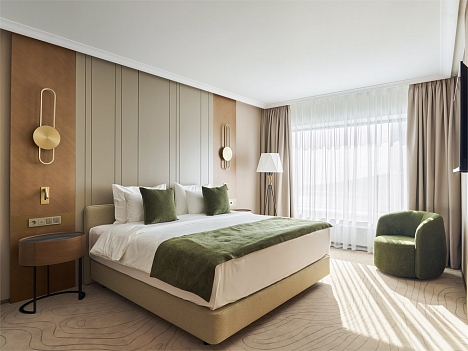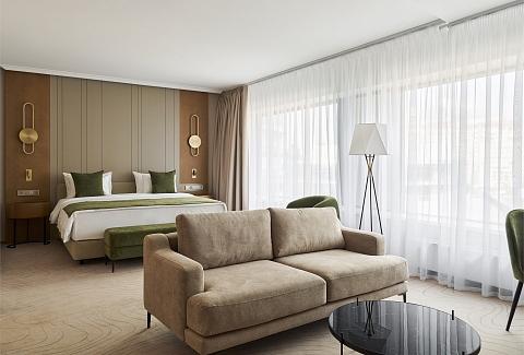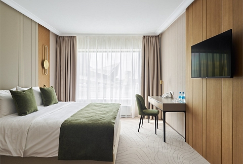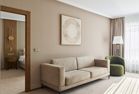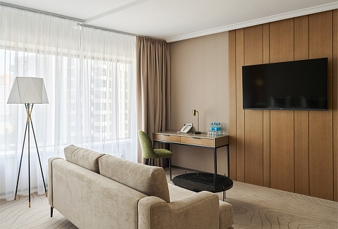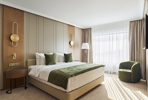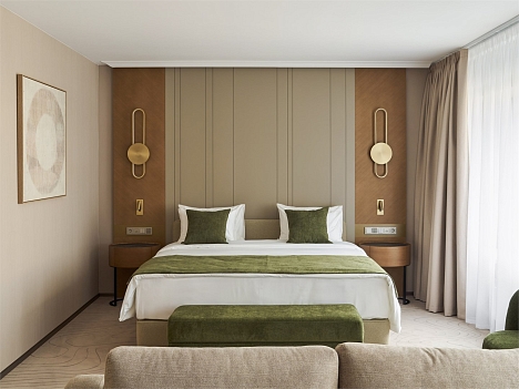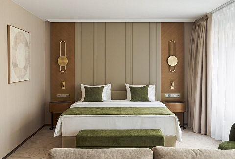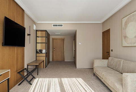В номере: вешалка, диван, зеркало, кресло, кровать двуспальная, прикроватные тумбочки, стол, стулья, шкаф, гладильная доска, кондиционер, кофемашина, мини-холодильник, набор посуды, сейф, телевизор, телефон, утюг, чайная станция, электрическая простынь с подогревом