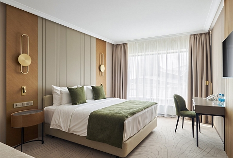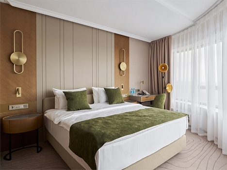 В номере: вешалка, зеркало, кровать двуспальная, прикроватные столики, стол, стулья, шкаф, кондиционер, мини-холодильник, набор посуды, сейф, телевизор, телефон, электрочайник
